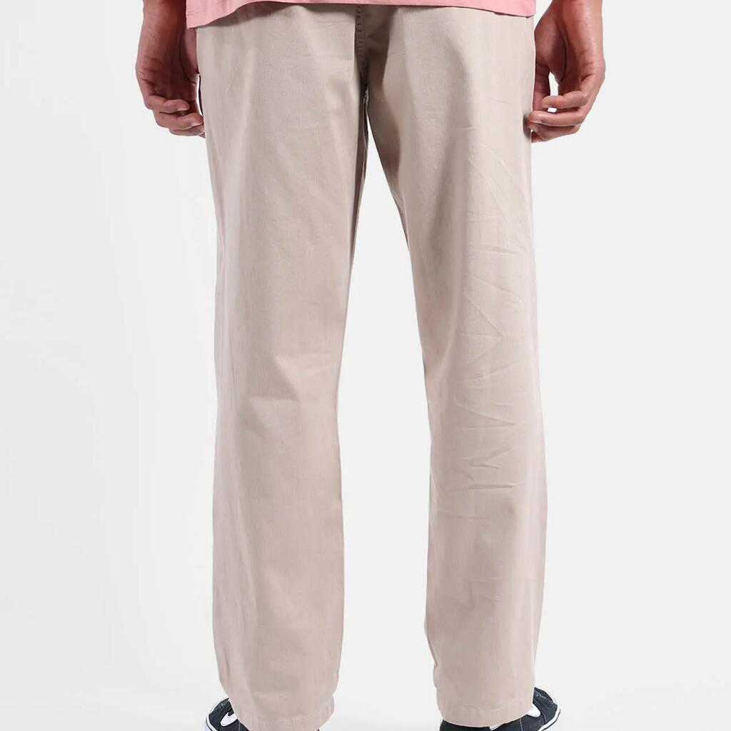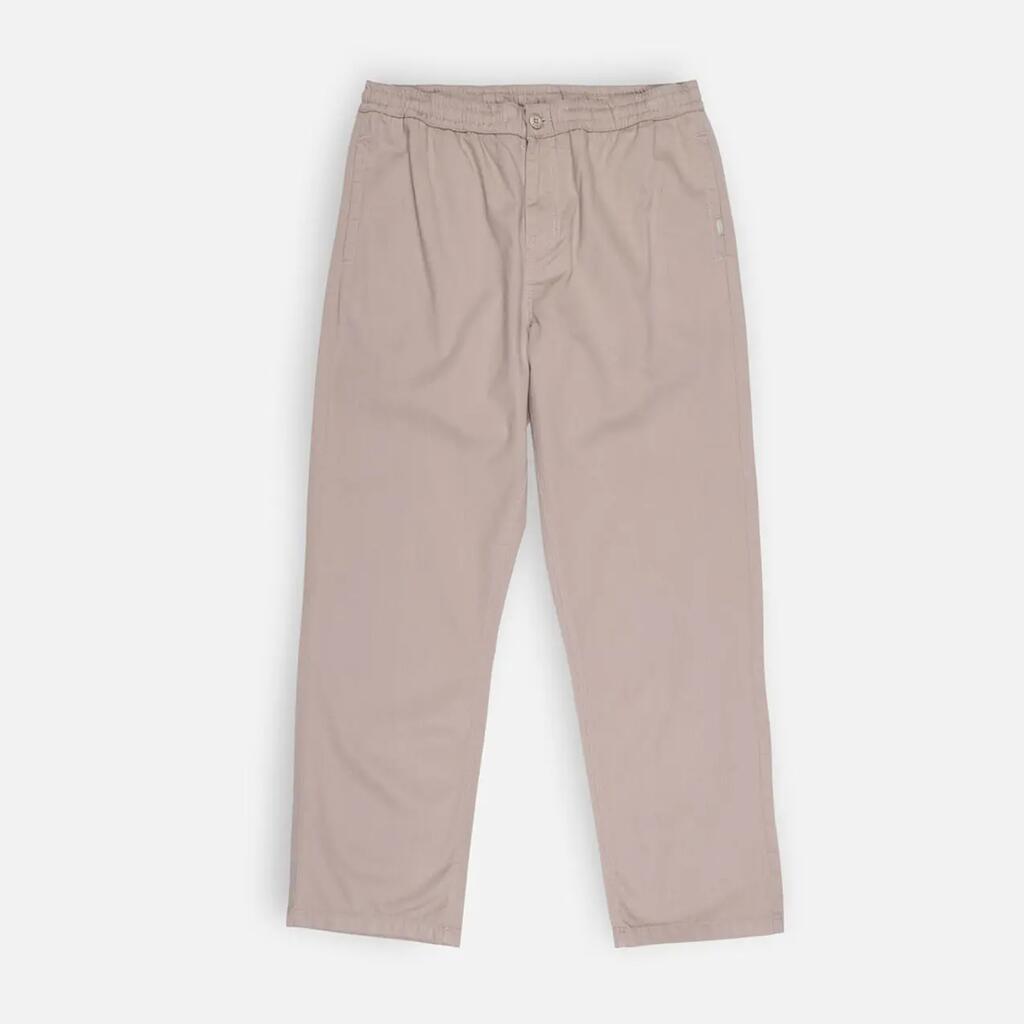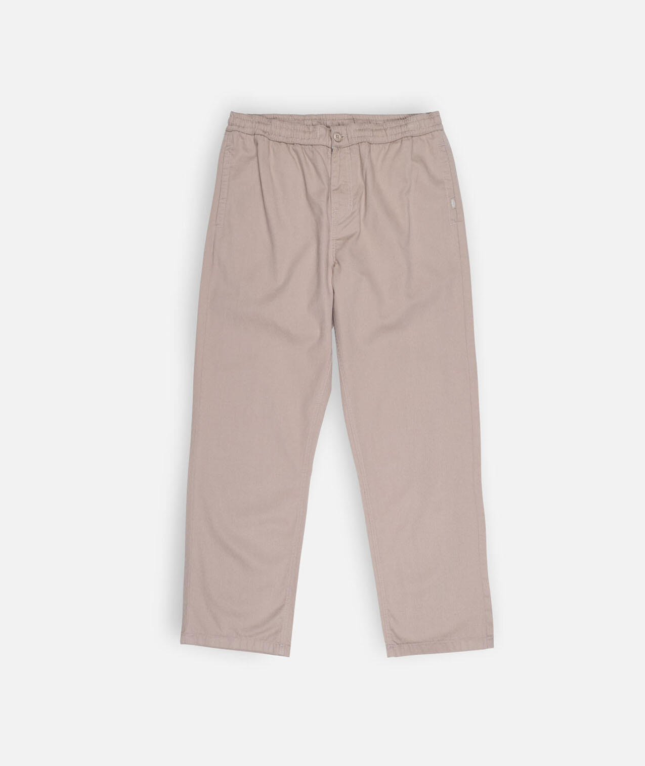 Lightweight elastic pants in 200 g/m² cotton dobby, elastic waistband with inner drawstring, zip fly, hand pockets, and buttoned welted back pockets, length 76–79.5 cm depending on size.