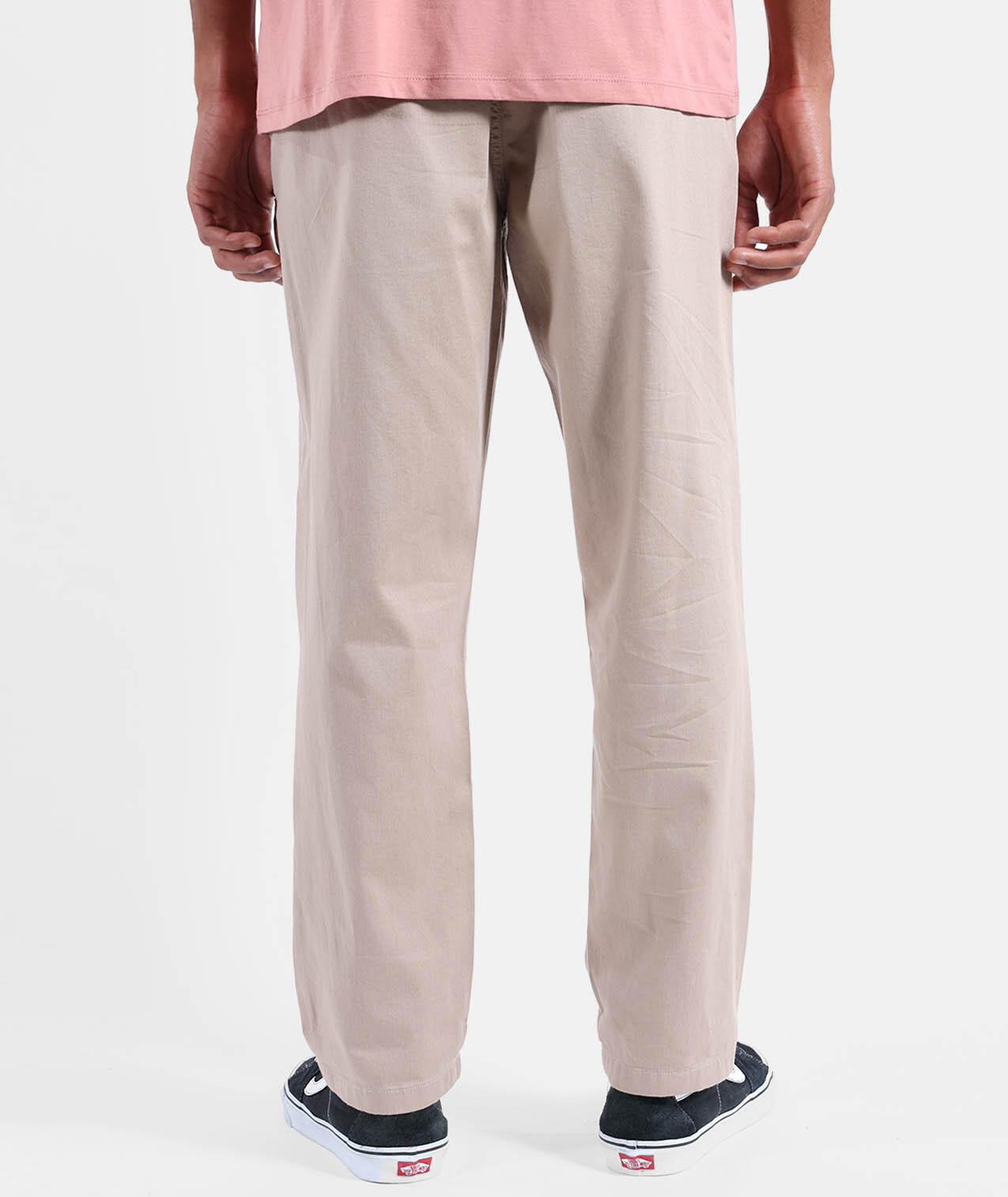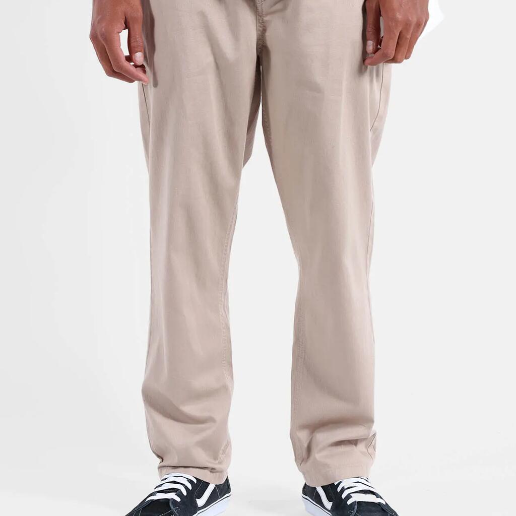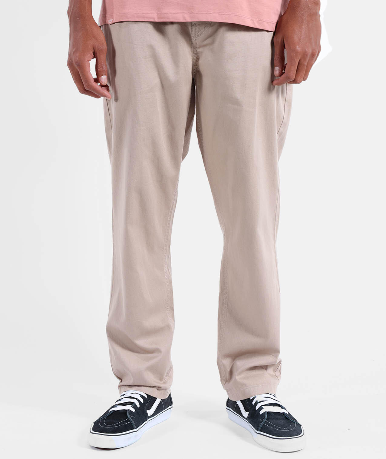 Lightweight elastic pants in 200 g/m² cotton dobby, elastic waistband with inner drawstring, zip fly, hand pockets, and buttoned welted back pockets, length 76–79.5 cm depending on size.