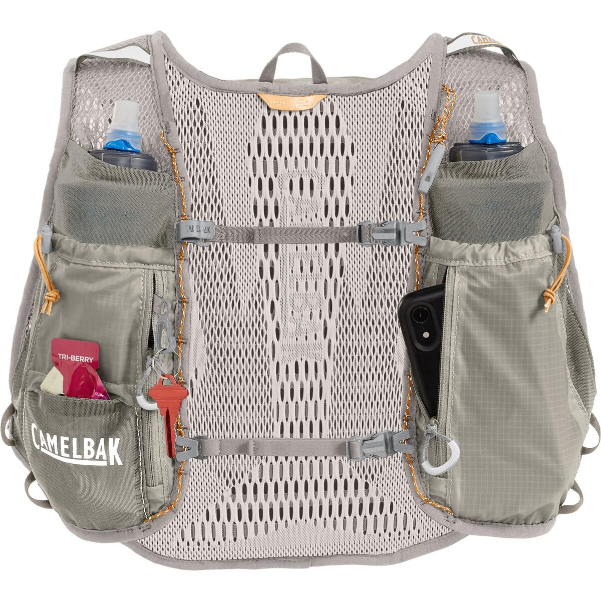 The Women Zephyr Pro™ vest is specially designed to meet the needs of the most demanding female athletes. Made to fit the female body, it combines comfort, lightness, and performance to support you during the longest trails and intense races. Thanks to its knitted mesh construction with body mapping of the back's sweat zones, it ensures optimal ventilation and lasting comfort, even in high heat. Its adjustable one-size design offers a customised fit with four side straps, allowing you to perfectly adapt the vest to your shape. Moreover, the front Quick Stow™ flasks of 500 ml have been positioned specifically to fit the female anatomy and are kept in place by non-slip silicone bands, preventing any uncomfortable movement during exertion. With a total capacity of 12 litres, it is designed to carry all the essentials: a secure pocket for your phone, an integrated safety whistle for your peace of mind, storage solutions for your snacks and clothing, as well as an included removable quiver to easily attach your trekking poles. Made from ultra-light materials and treated with Polygiene® antimicrobial technology, this vest stays fresh and pleasant to wear throughout your adventures.