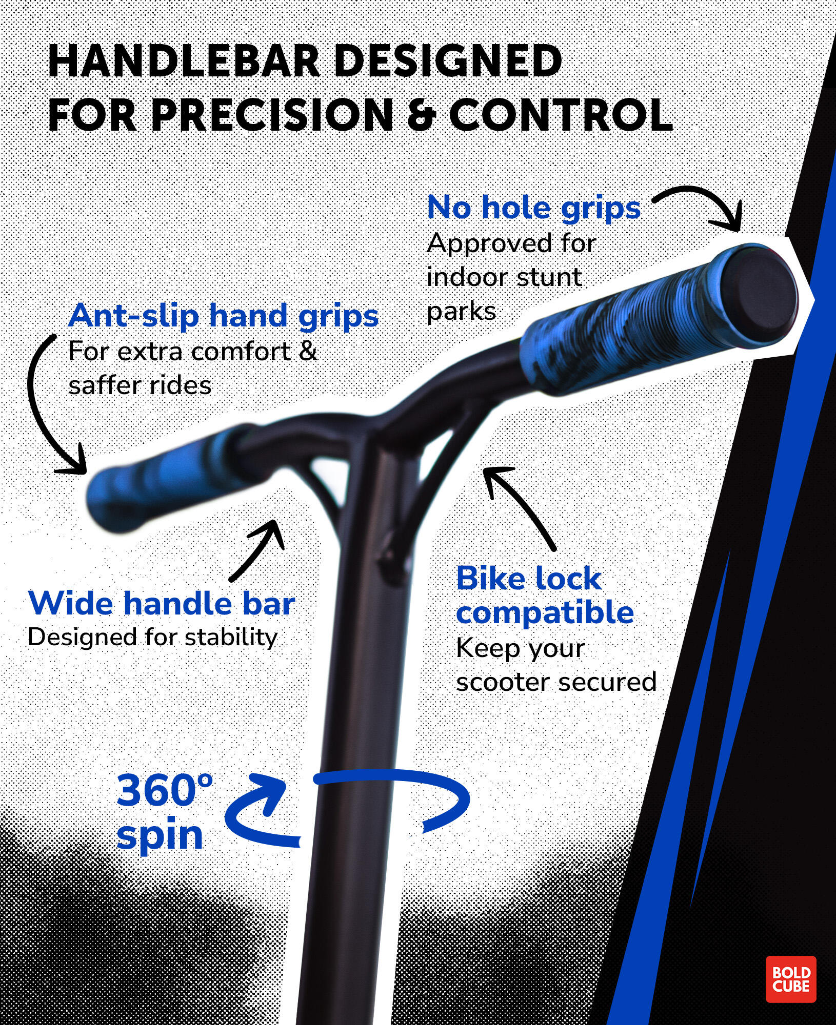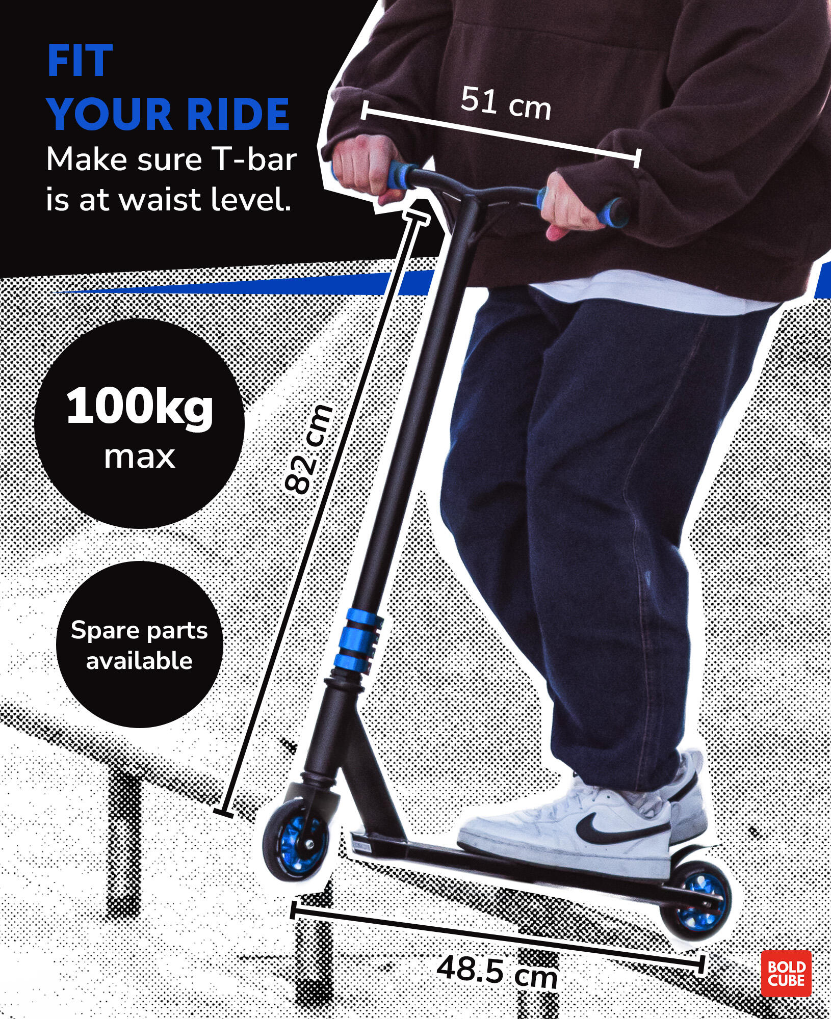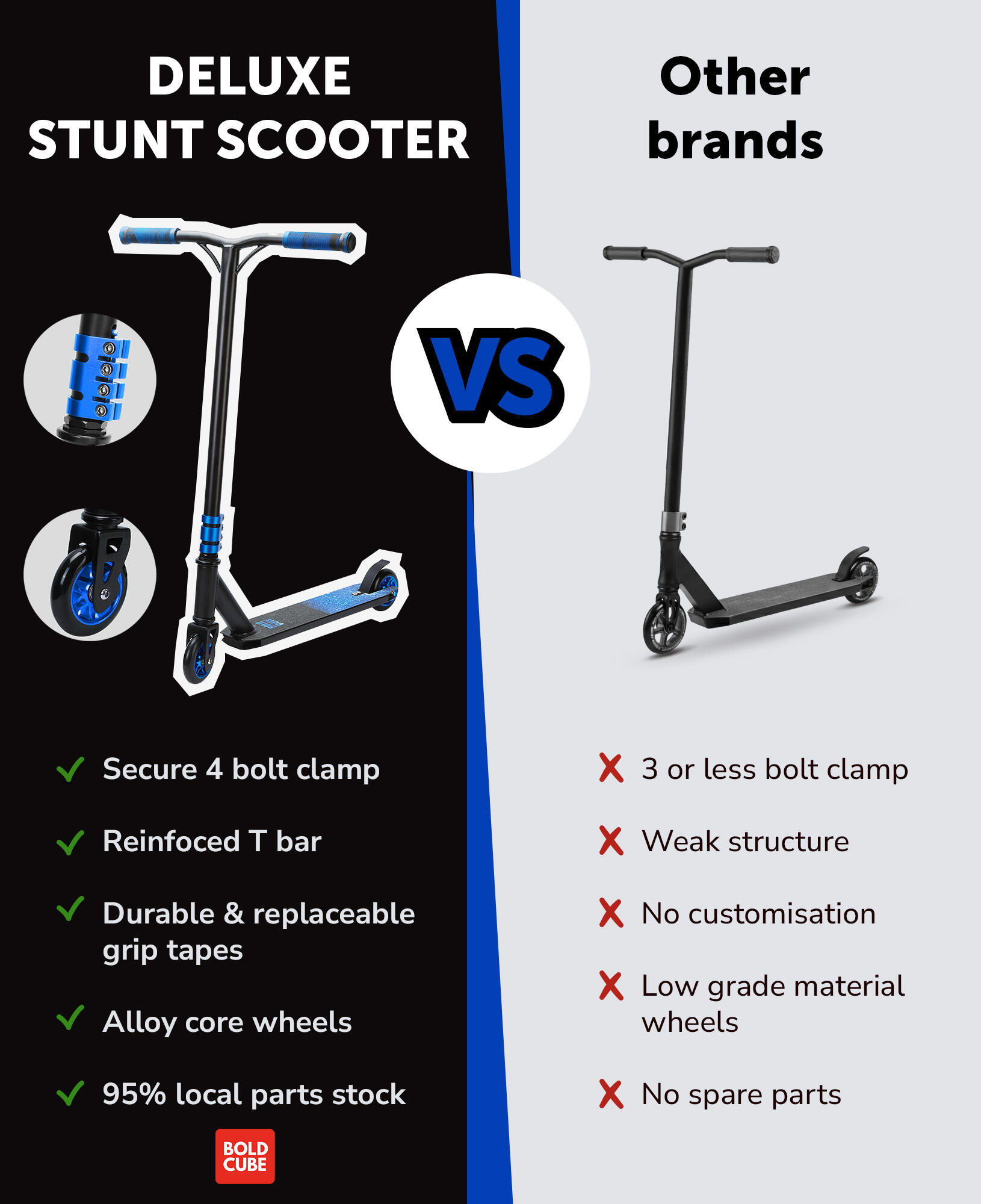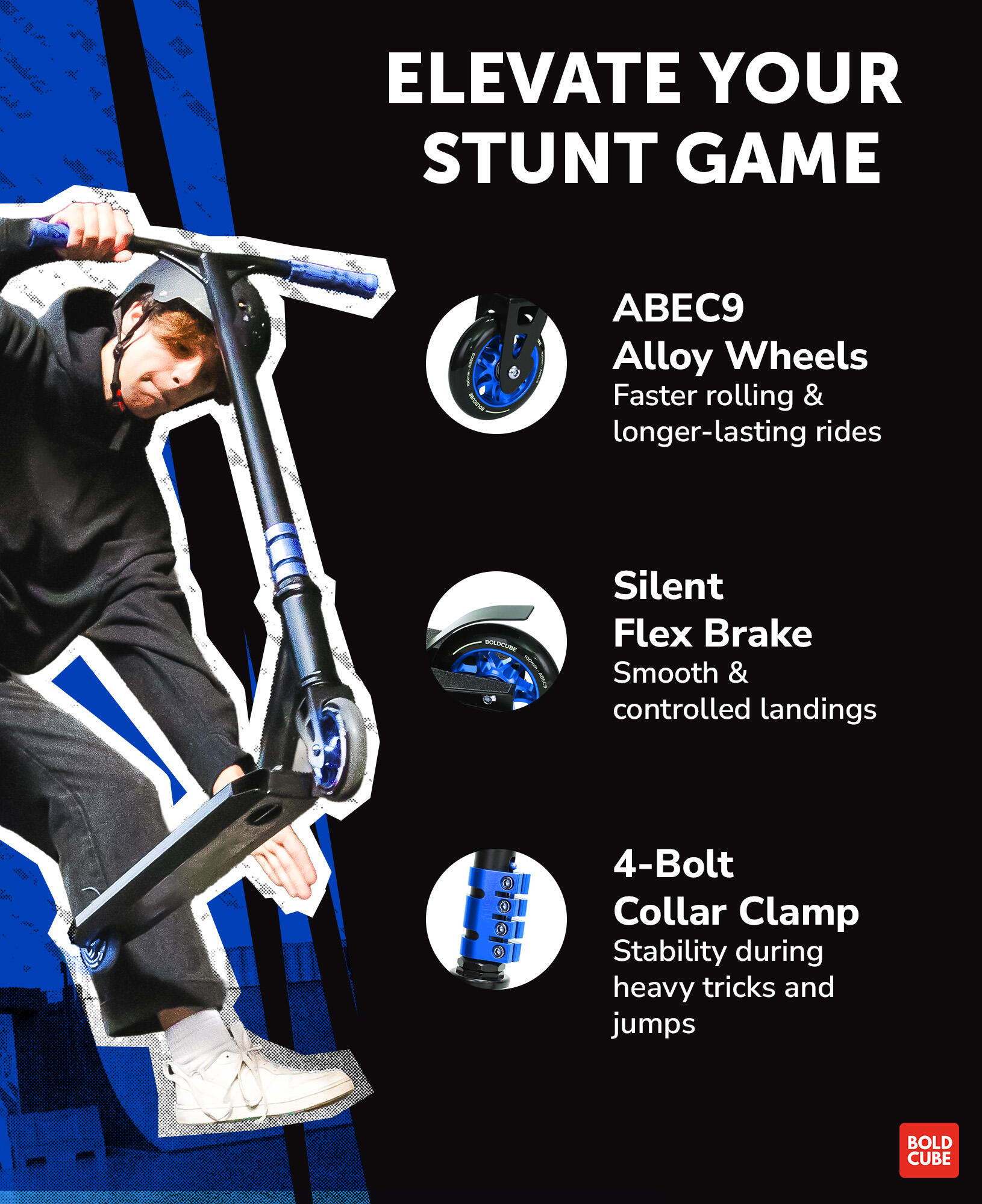 FEATHER-LIKE WEIGHT - A fully kitted out stunt scooter, with ABEC 9 wheel and weighting only 2.9 kg, this two wheeler is designed for performance at the skate park. Suitable for beginners and more advanced riders who are looking for a sturdy yet easily manoeuvrable trick scooter and durably designed for older kids and teens with little or no stunt scooter experience to stand out at the skate park or on the street. The BOLDCUBE deluxe stunt scooter can be used by adults too.