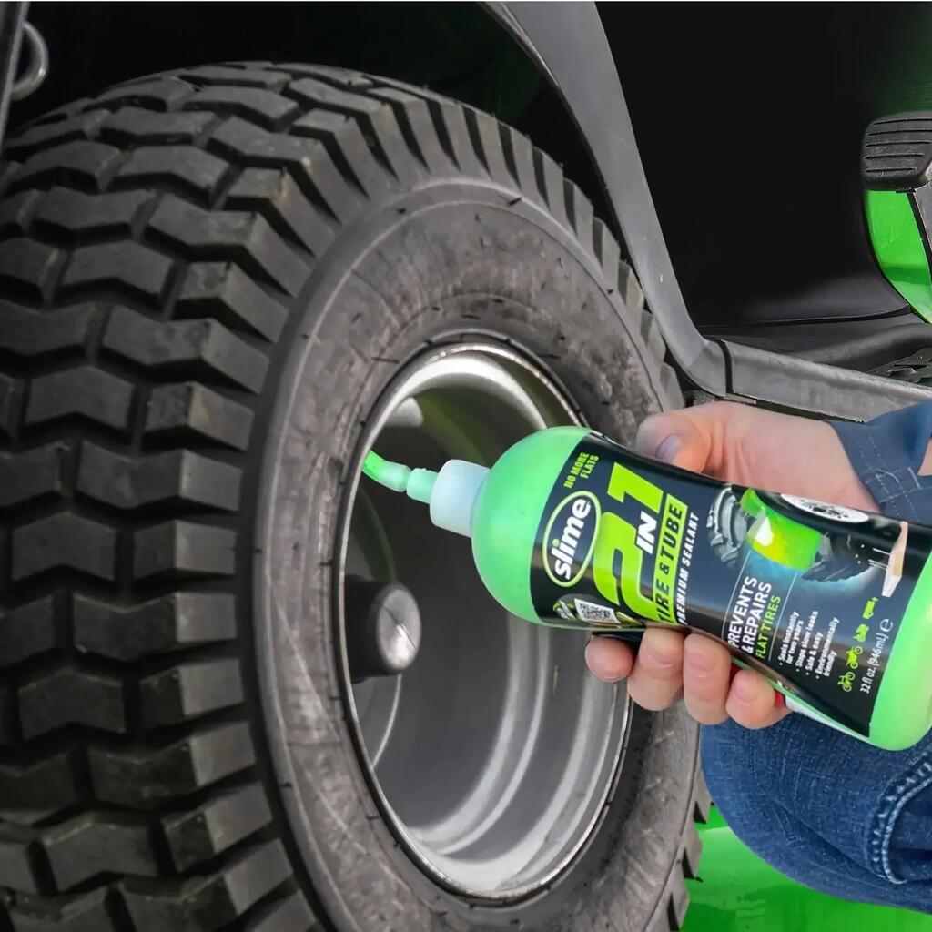 Slime 2-in-1 tyre and tube sealant prevents and repairs punctures in inner-tube and tubeless tyres, is non-toxic and non-flammable, and includes a pump. Not approved for highway use over 73 km/h.