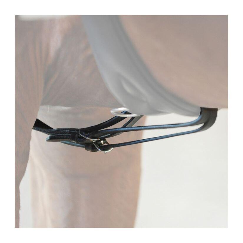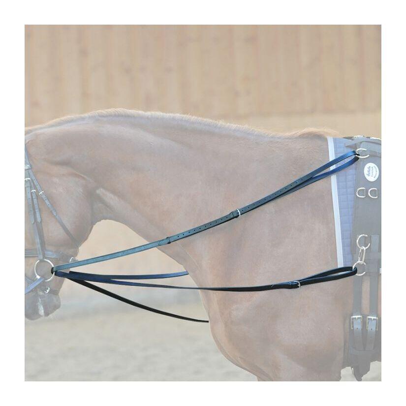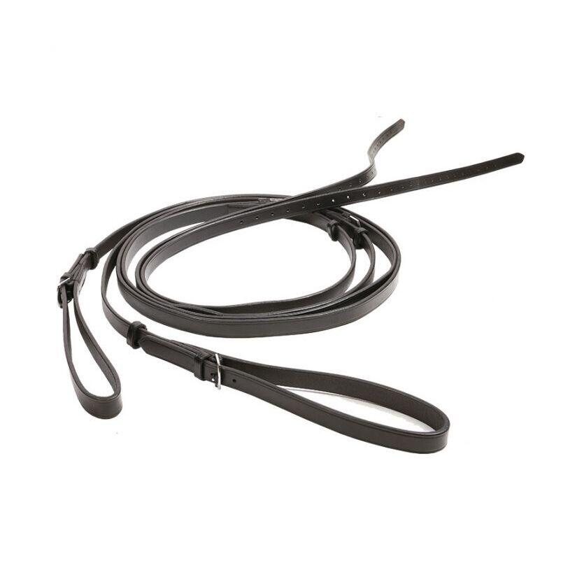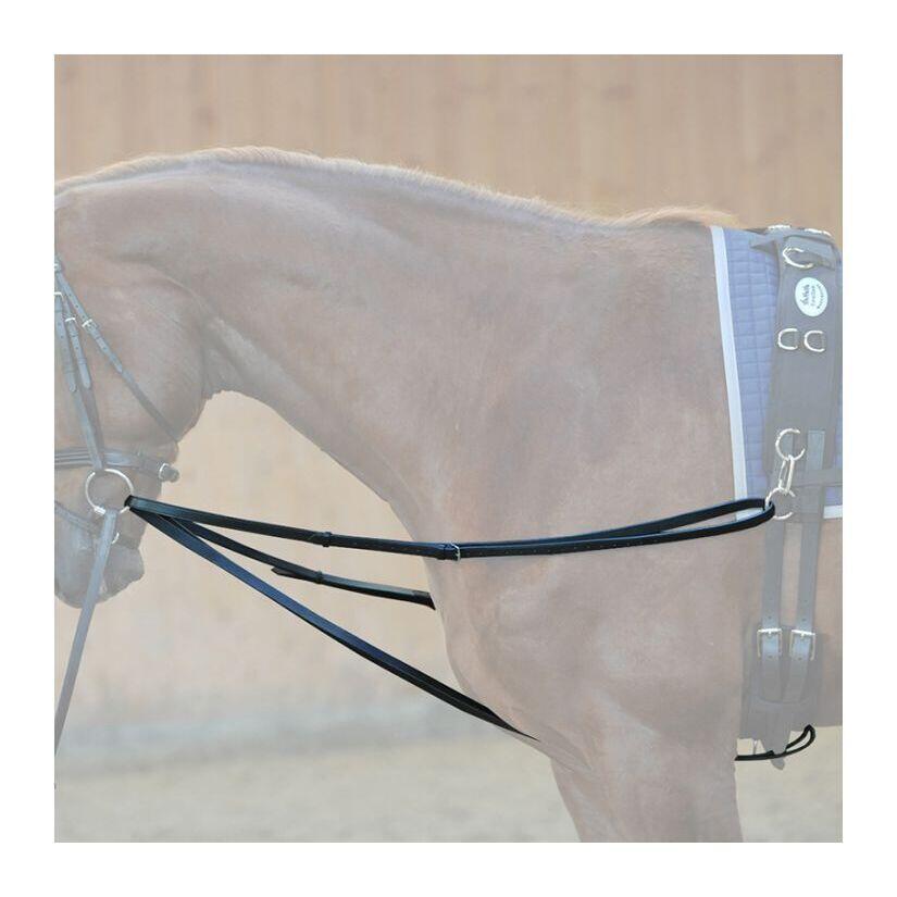 For riding or lunging- Handy leather reins, both ends to adjustSize: Pony, FullColor: BlackFittings: silverThe philips reins are two individual belts, which are turned in the same way as the racing reins the strap through the bridle rings to the horse. Instead of being under the horse's fuselage, however, they are attached to the horse's side, which improves the horse's lateral guidance compared to racing reins. They are used for riding and lunging, but are also ideal for working with young horses. The Philip reins are ideal for professional riding. The horse's freedom of movement can be modified by increasing or decreasing the triangle. The further apart the leather straps are, the larger the lateral triangle and the horse has more room to move up and down. In addition, a wide buckle provides good lateral stability and allows horses that like the outside shoulder to dodge a frame to the outside. Each rider or longeur can also connect the Philips reins so that they are as stiff and use as normal side reins as a direct and constant support. Philip reins, which are for each level of education, just on the longe, very appropriate. They help to cover many points of the education training scale and are very versatile.
