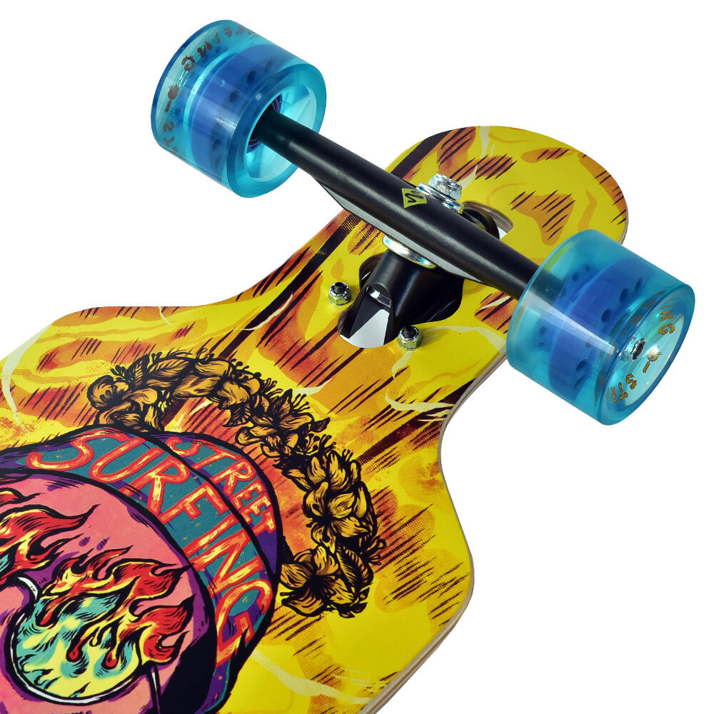 This symmetrical twin-tip drop-though board was designed to be used on the hills and the streets.