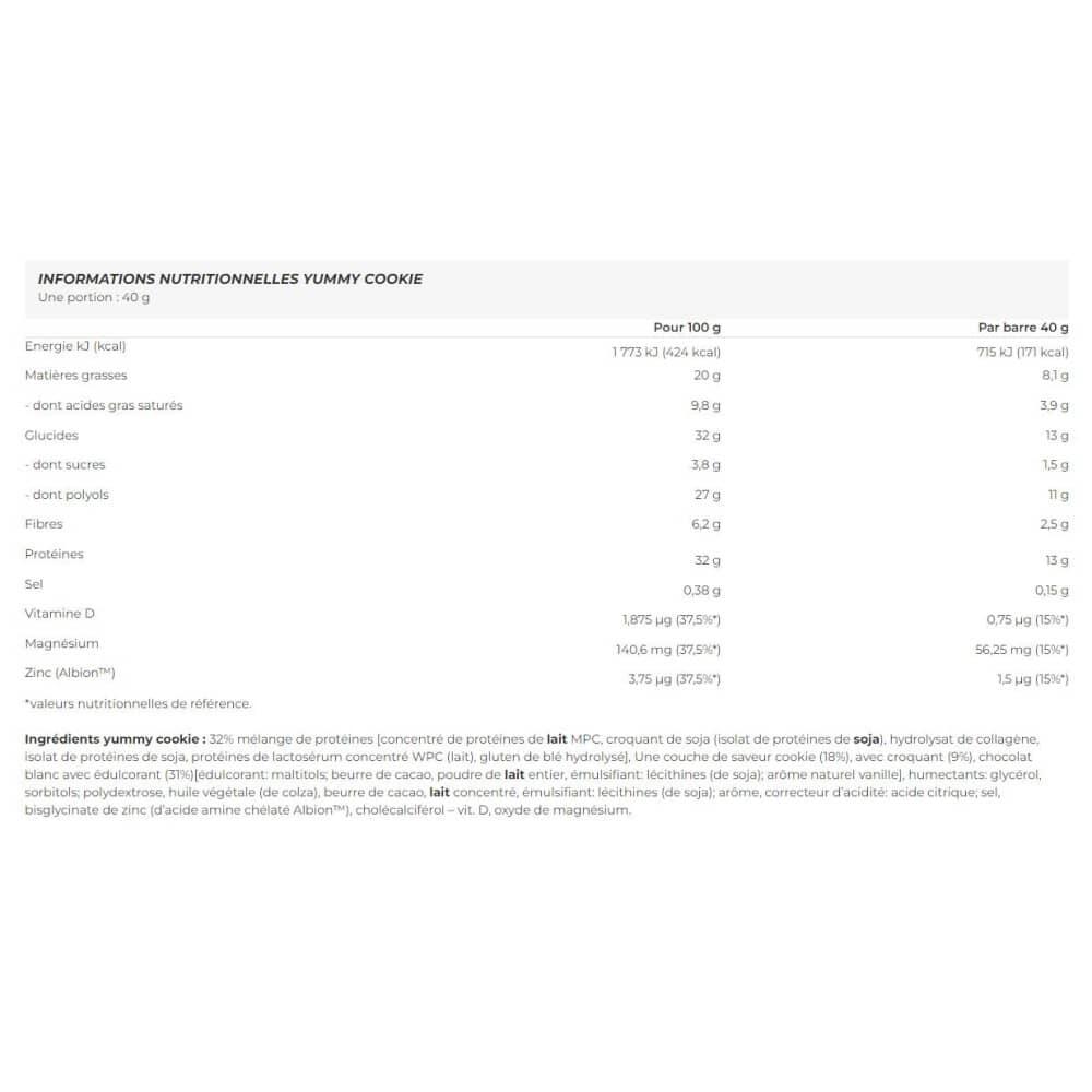 Ingredients yummy cookie: 32% protein blend [concentré de protéines de lait MPC, croquant de soja (isolat de protéines de soja), hydrolysat de collagène, isolat de protéines de soja, protéines de lactosérum concentré WPC (lait), gluten de blé hydrolysé], A layer of cookie flavor (18%), with crunch (9%), white chocolate with sweetener (31%)[édulcorant: maltitols, beurre de cacao, poudre de lait entier, émulsifiant: lécithines (de soja), arôme naturel vanille], humectants: glycerol, sorbitols, polydextrose, vegetable oil (rapeseed), cocoa butter, condensed milk, emulsifier: lecithins (soya), flavour, acidity regulator: citric acid, salt, zinc bisglycinate (from Albion? chelated amino acid), cholecalciferol - vit. D, magnesium oxide.Ingredients peanut butter: 35% protein blend [concentré de protéines de lait MPC, croquant de soja (isolat de protéines de soja), hydrolysat de collagène, isolat de protéines de soja, protéines de lactosérum concentré WPC (lait), gluten de blé hydrolysé], 29.5% milk chocolate with sweetener [édulcorant: maltitols, beurre de cacao, poudre de lait entier, pâte de cacao, émulsifiant: lécithines (de soja), arôme naturel vanille], humectants: glycerol, sorbitols, polydextrose, vegetable oil (rapeseed), cocoa butter, condensed milk, 1.5% chocolate with sweetener [pâte de cacao, édulcorant: maltitols, beurre de cacao, émulsifiant: lécithines (de soja), arôme naturel vanille], emulsifier: lecithins (soya), flavour (contains: peanuts), acidity regulator: citric acid, salt, zinc bisglycinate (from Albion? chelated amino acid), cholecalciferol - vit. D, magnesium oxide. Milk chocolate - cocoa: 35% minimum, milk solids: 21% minimum. Coffee delight ingredients: 32% protein blend [concentré de protéines de lait MPC, croquant de soja (isolat de protéines de soja), hydrolysat de collagène, isolat de protéines de soja, protéines de lactosérum concentré WPC (lait), gluten de blé hydrolysé], 31% white chocolate with sweetener [édulcorant: maltitols, beurre de cacao, poudre de lait entier, émulsifiant: lécithines (de soja), arôme naturel vanille], humectants: glycerol, sorbitols, polydextrose, vegetable oil (rapeseed), cocoa butter, condensed milk, emulsifier: lecithins (soya), flavouring, acidity regulator: citric acid, salt, zinc bisglycinate (from Albion? chelated amine acid), cholecalciferol - vit. D, magnesium oxide.