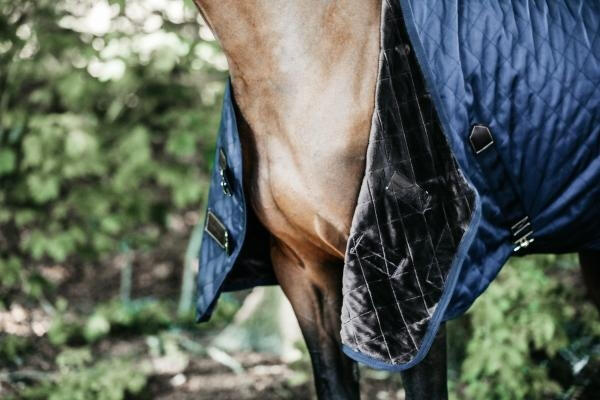 The 600D polyester diamond quilted outer fabric is very tear resistant. This blanket does not contain padding, but the artificial rabbit skin creates tiny air pockets that trap and retain the horse's body heat. The artificial rabbit skin lining ensures that the blanket stays in place after the horse rolls. The artificial rabbit skin also prevents rubbing and gives the horse a shiny coat.