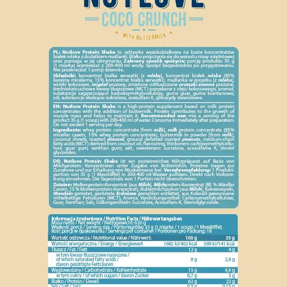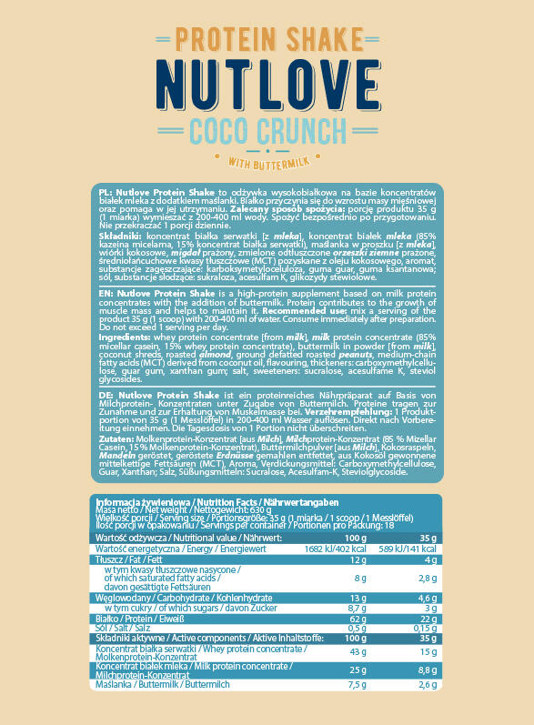 Ingredients Chocolate Hazelnut: Whey protein concentrate [lait], milk protein concentrate (85% micellar casein, 15% whey protein concentrate), buttermilk powder [lait], ground hazelnuts, roasted hazelnuts, ground defatted roasted peanuts, medium-chain fatty acids (mct) from coconut oil, low-fat cocoa, flavour, thickeners: cellulose gum, guar gum, xanthan gum, salt, sweeteners: sucralose, acesulfame potassium, stevia steviol glycosides. Ingredients White Chocolate Peanut: Whey protein concentrate [lait], milk protein concentrate (85% micellar casein, 15% whey protein concentrate), buttermilk powder [lait], peanut pieces, ground peanuts, ground defatted roasted peanuts, flavour, thickener : cellulose gum, guar gum, xanthan gum, salt fromHimalaya, sweeteners: sucralose, acesulfame potassium, stevia steviol glycosides. Ingredients Coco crunch: whey protein concentrate [lait], milk protein concentrate (85% micellar casein, 15% whey protein concentrate), buttermilk powder [lait], ground hazelnuts, roasted hazelnuts, ground defatted roasted peanuts, medium-chain fatty acids (mct) from coconut oil, low-fat cocoa, flavour, thickeners: cellulose gum, guar gum, xanthan gum, salt, sweeteners: sucralose, acesulfame potassium, stevia steviol glycosides.