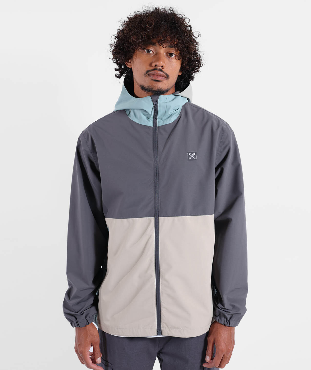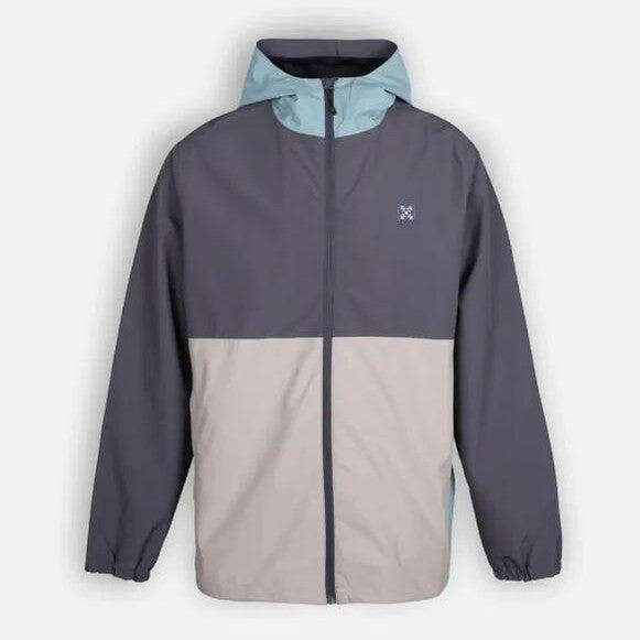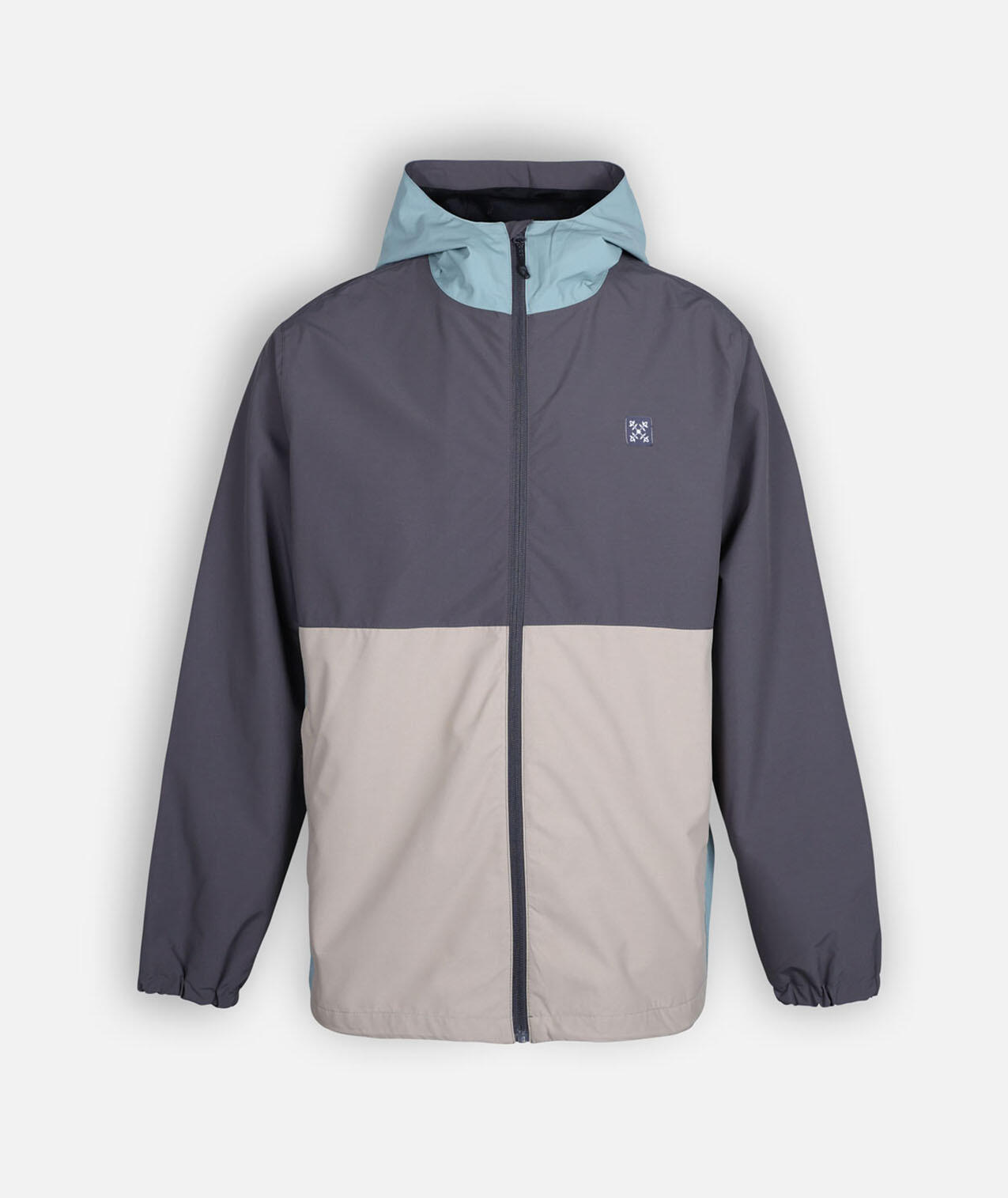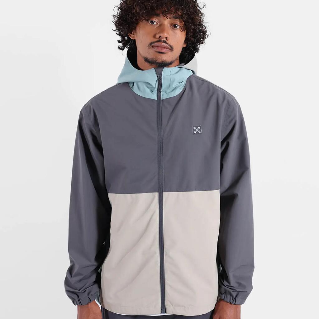 Waterproof and breathable jacket with adjustable hood, elastic hem and cuffs, sealed seams, zip pockets and printed inner lining, colorblock.