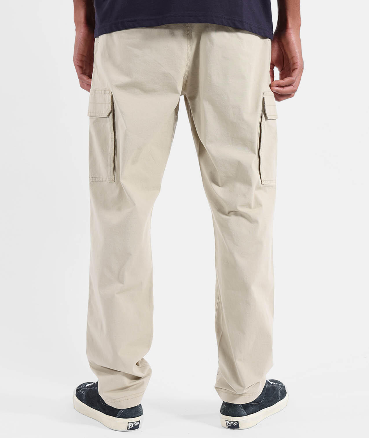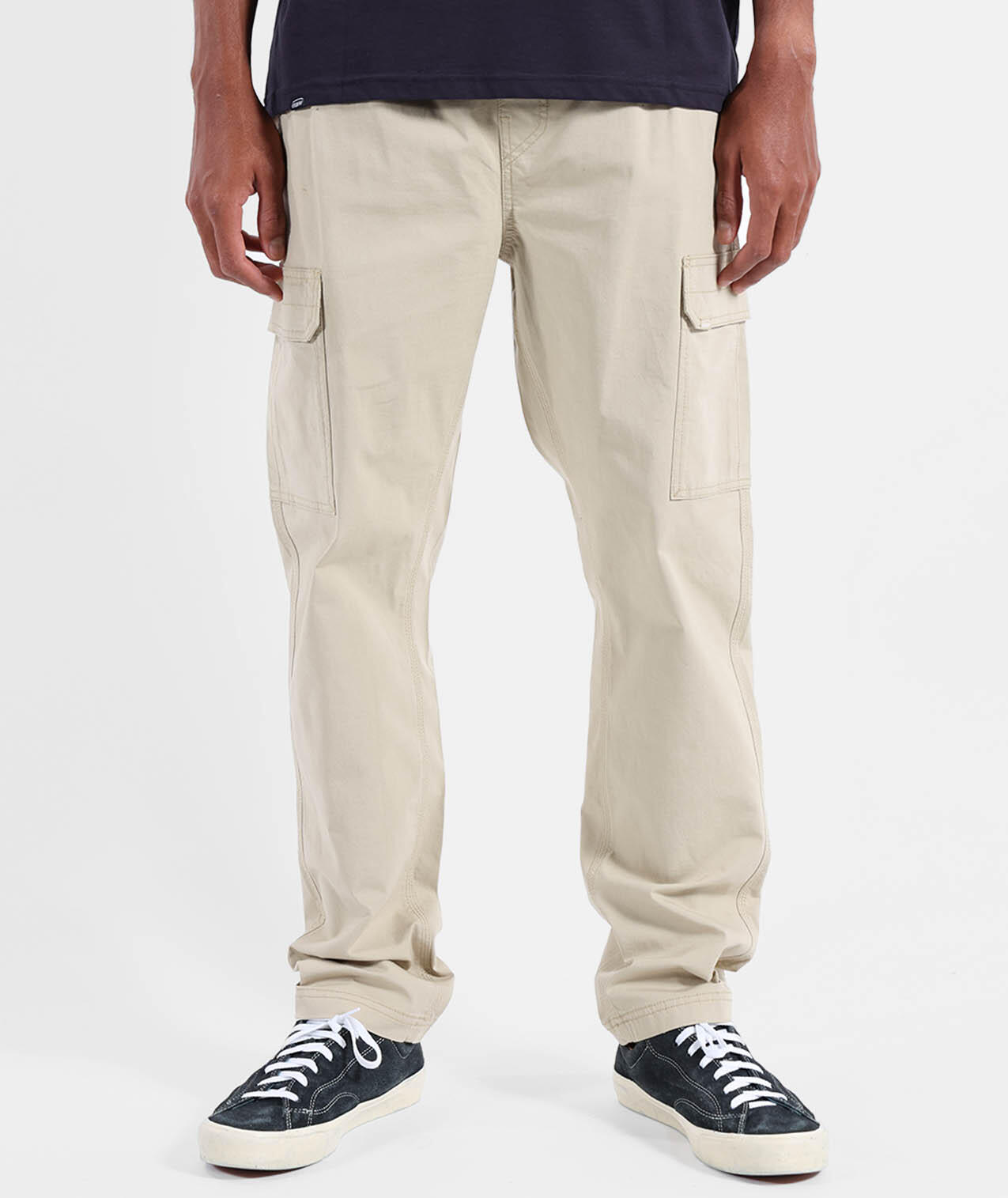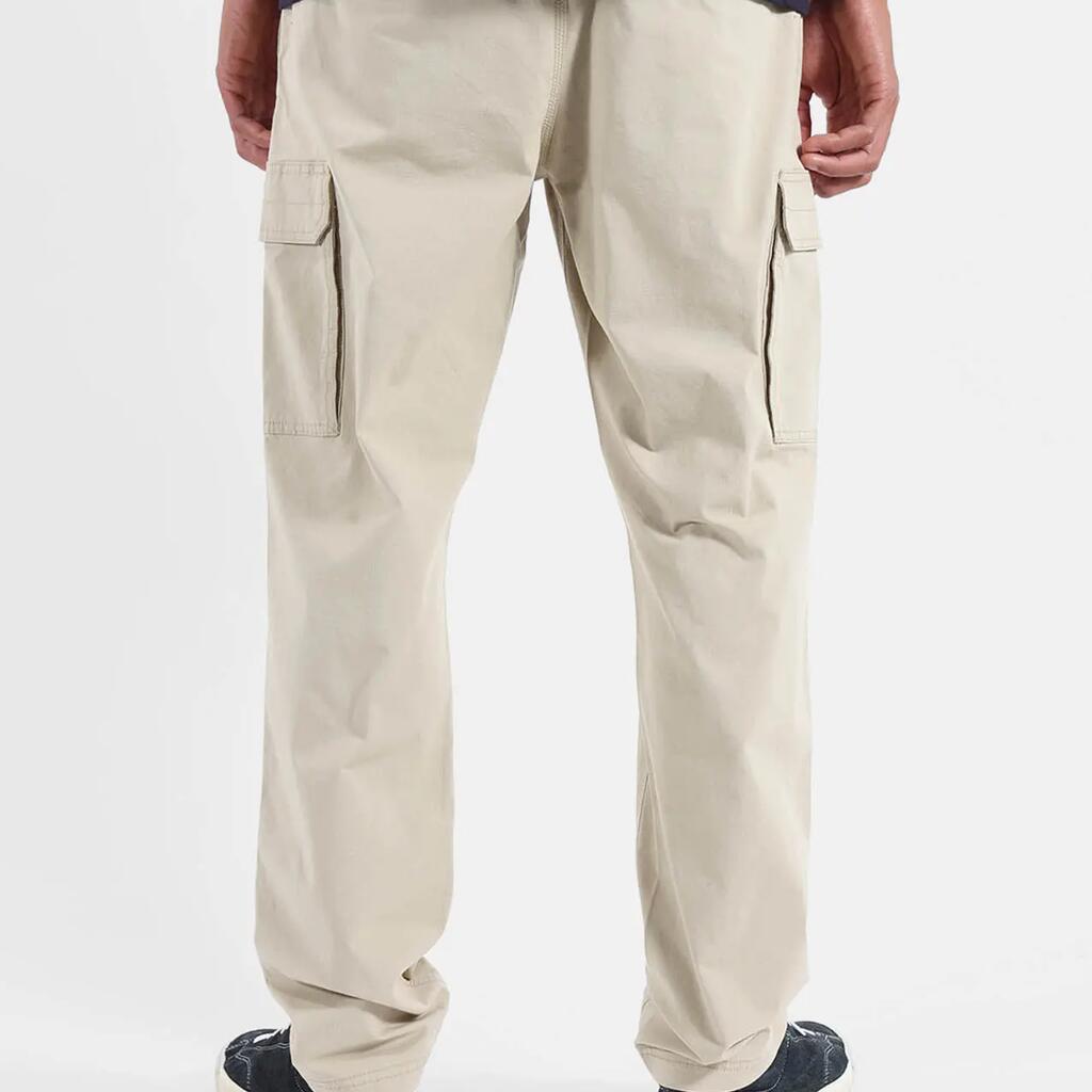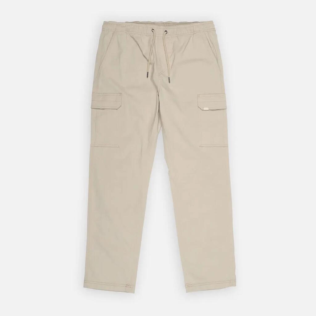 Elastic cargo pants with drawstring waistband, cargo pockets, side and back pockets, printed pocket bags, 250 g/m² stretch microcanvas cotton, length 76–79.5 cm depending on size.