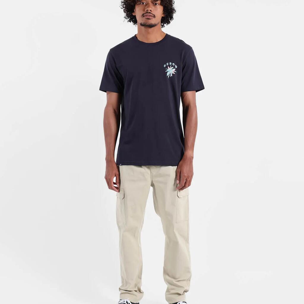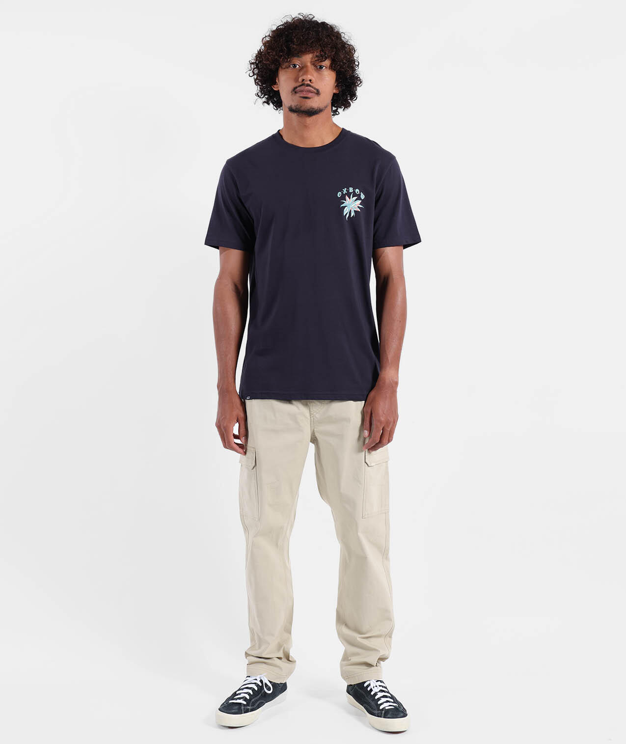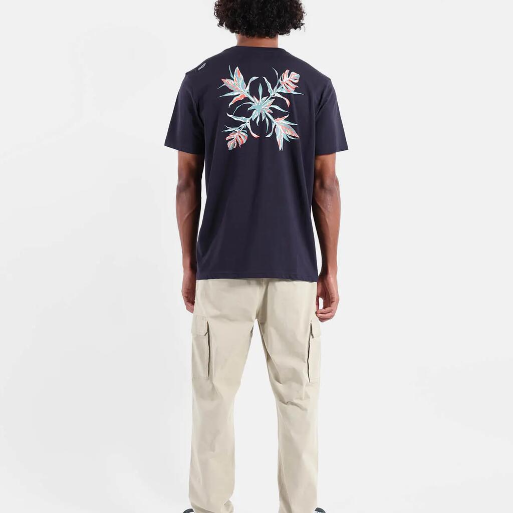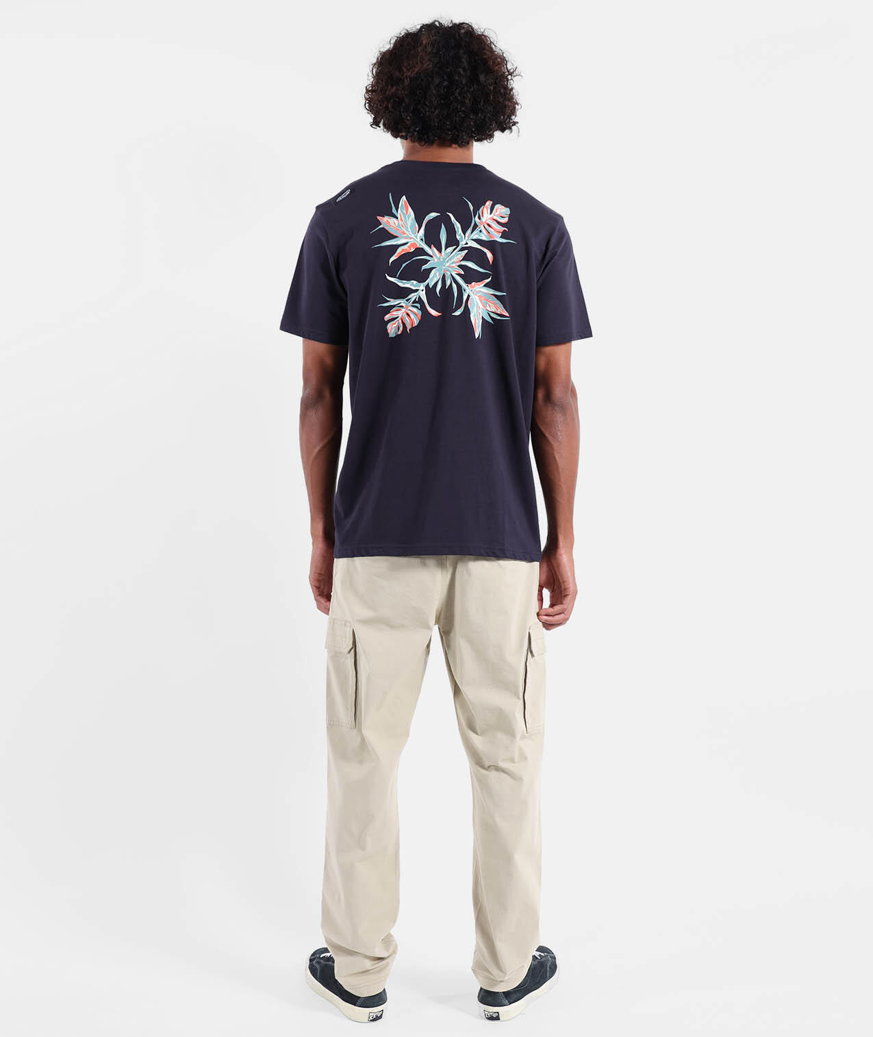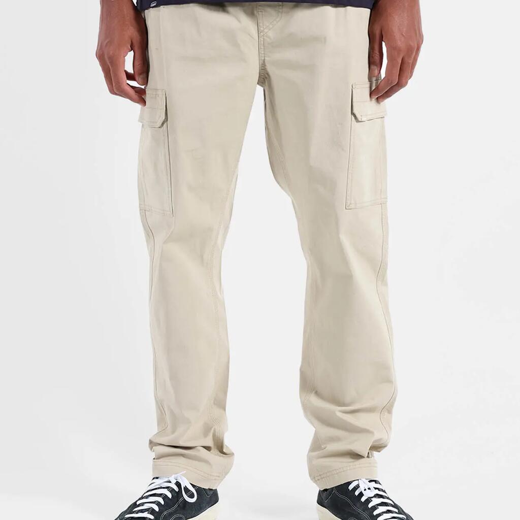Elastic cargo pants with drawstring waistband, cargo pockets, side and back pockets, printed pocket bags, 250 g/m² stretch microcanvas cotton, length 76–79.5 cm depending on size.