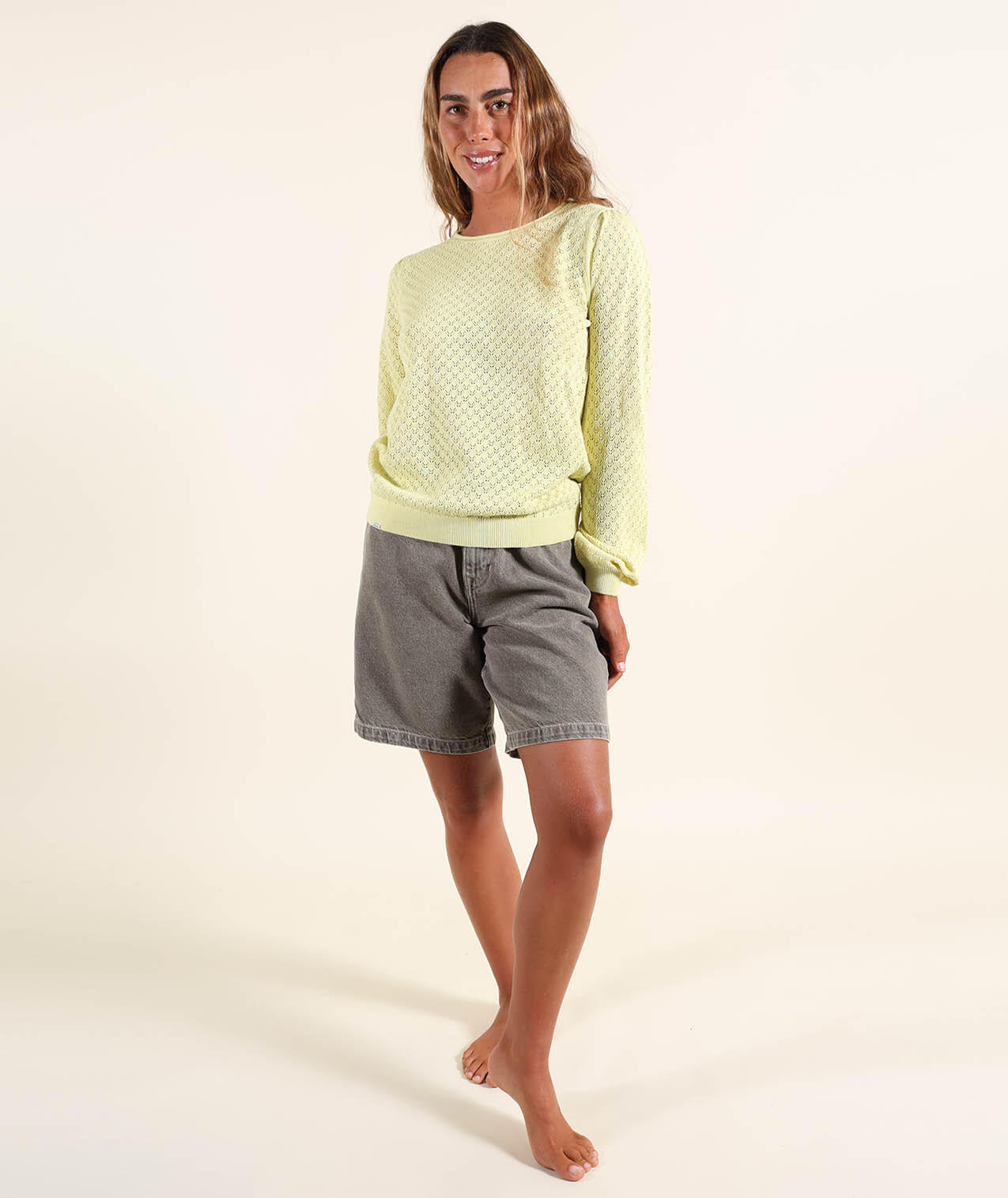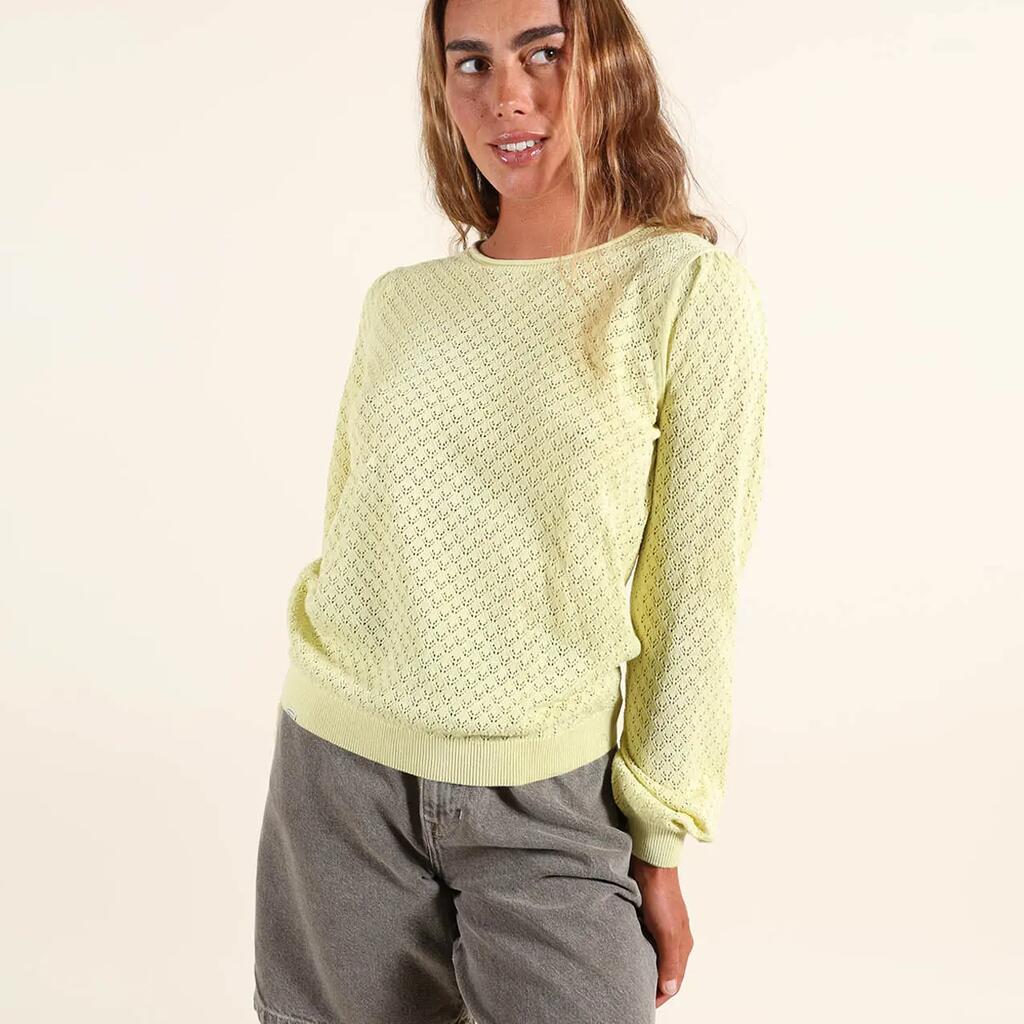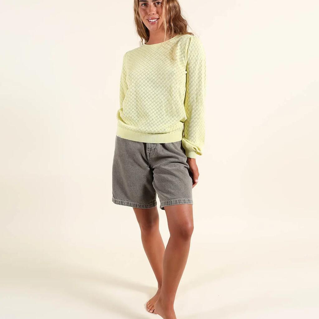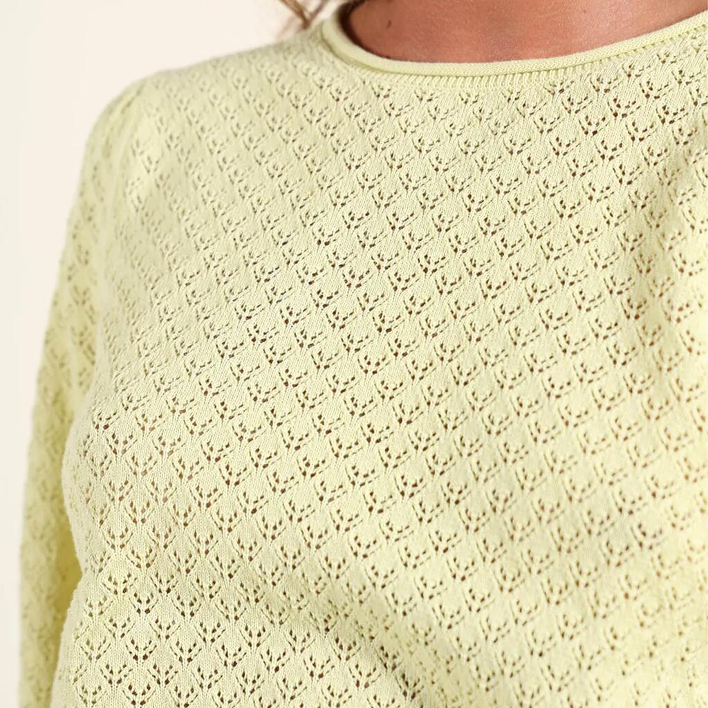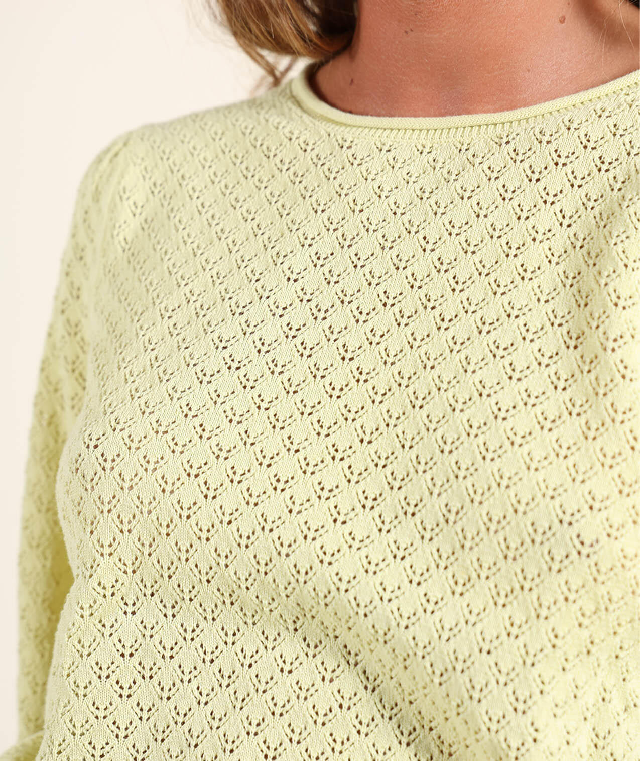 Lightweight gauge 12 sweater with round neck and fancy open stitch, embroidered patch on chest and Oxbow label on shoulder.