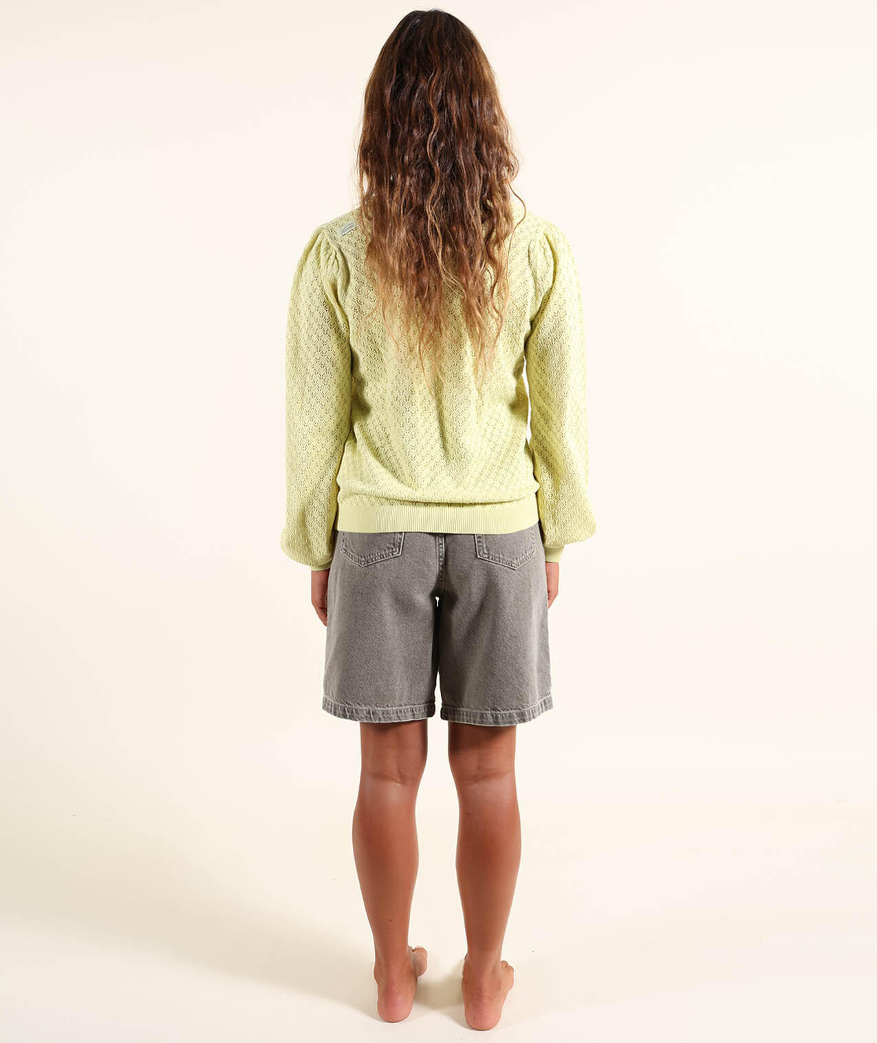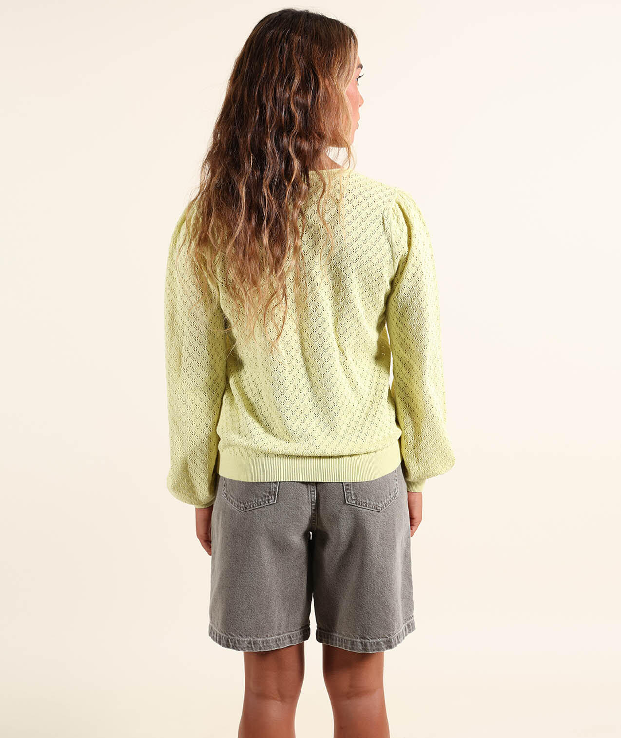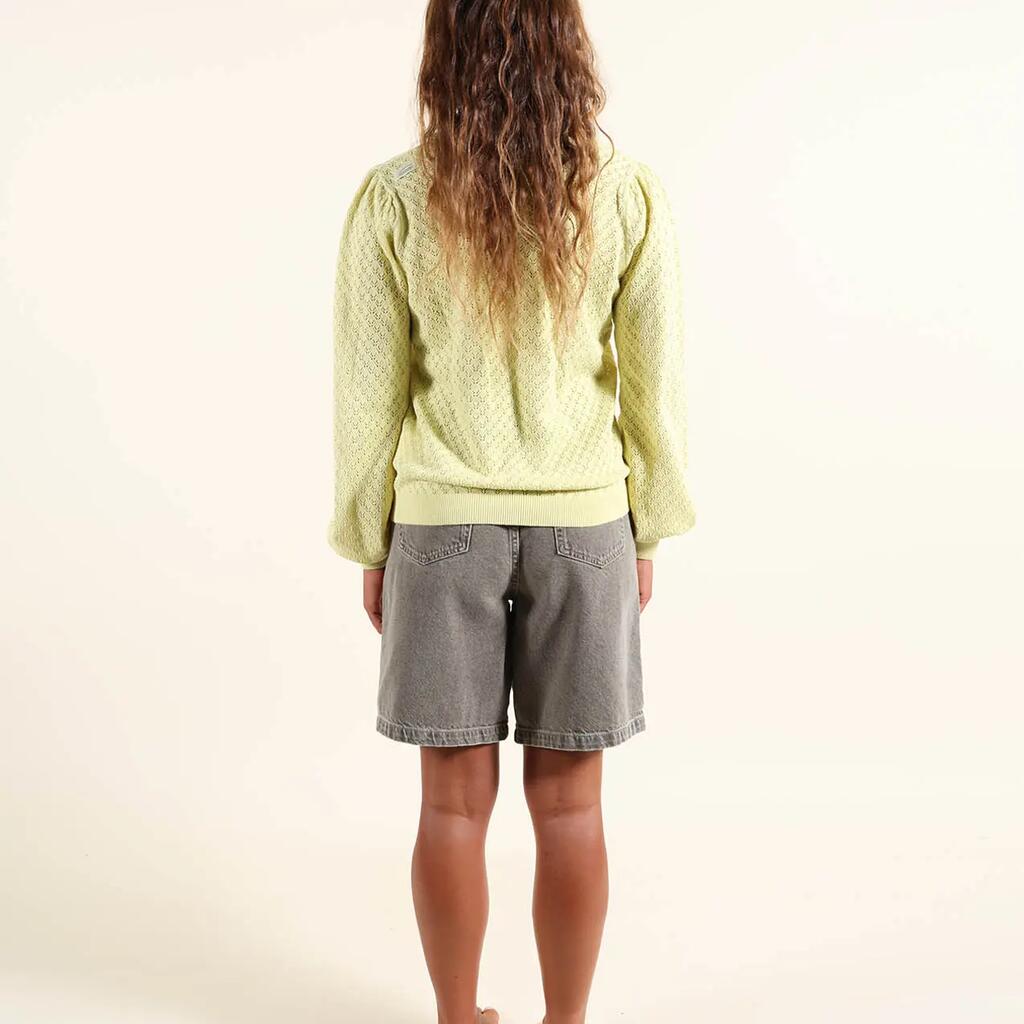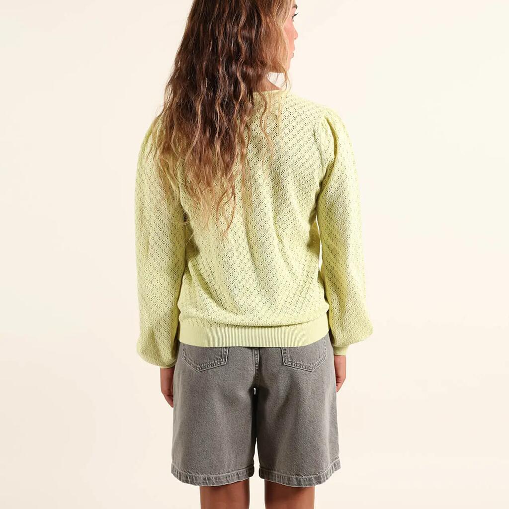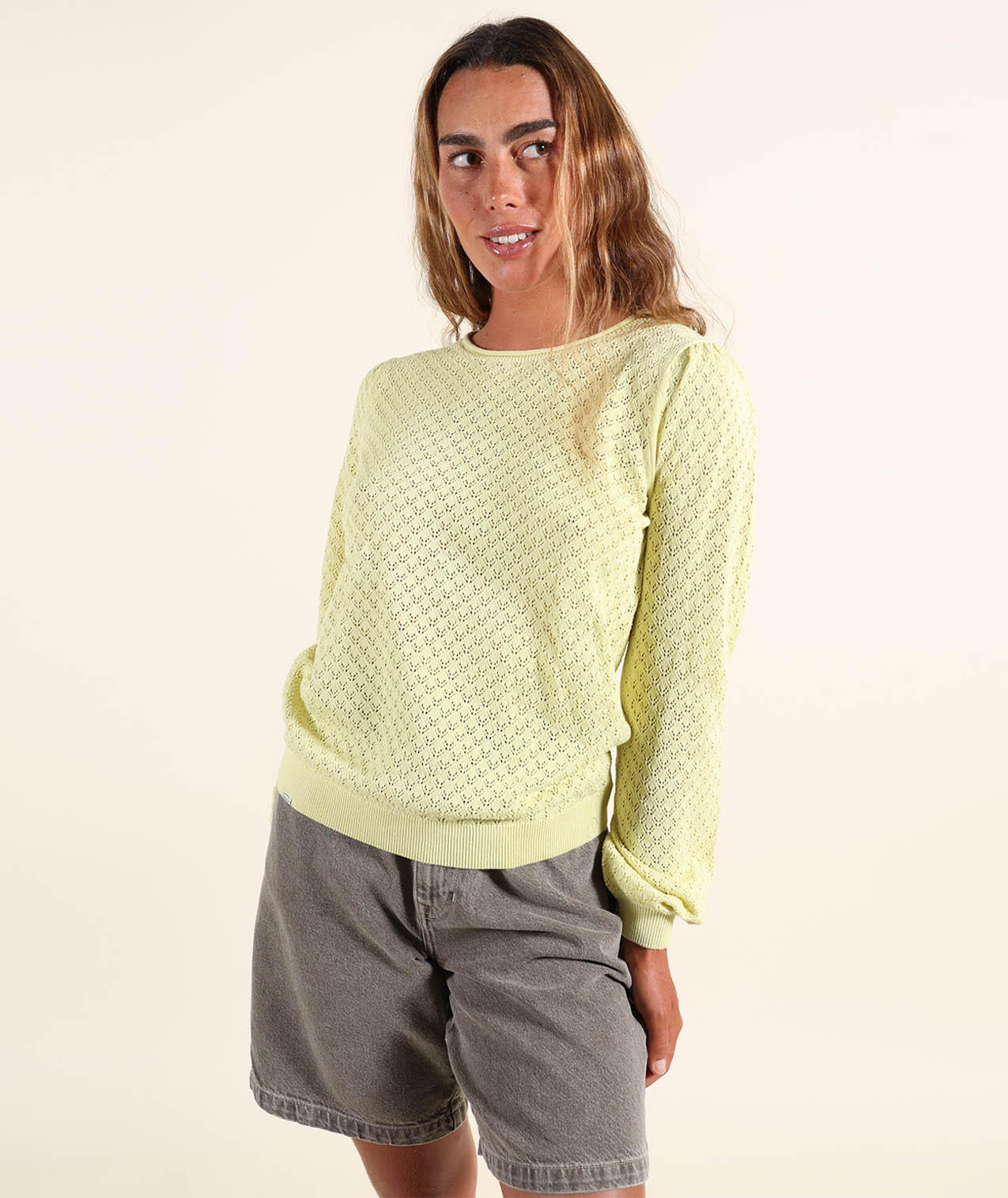 Lightweight gauge 12 sweater with round neck and fancy open stitch, embroidered patch on chest and Oxbow label on shoulder.