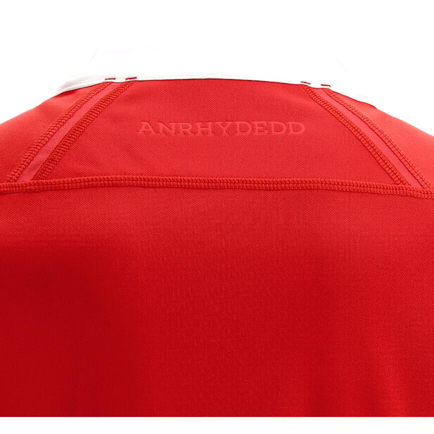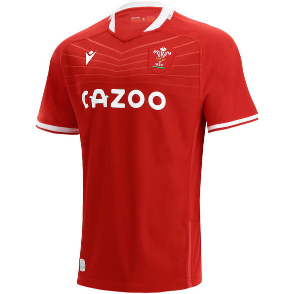 The Official Welsh Rugby Home Replica Jersey for the 2021 season. Red shirt with tone on tone design across the chest and white details on the collar and cuffs and the Welsh Rugby Crest embroidered over the heart. This shirt is standard fit, with short sleeves and produced using polyester making it perfect for cheering on the squad from the stands.V-neck collarOFFICIAL LICENSED PRODUCT | This official, certified product has been designed and made by Macron for and in close conjunction with the Club. It conforms to the strictest standards of authenticity and traceability in the supply chain.PersonalisationName & Number - Customise your jersey with the name and number of your favourite player or even your own name. We can print name in the same style worn by the players.
