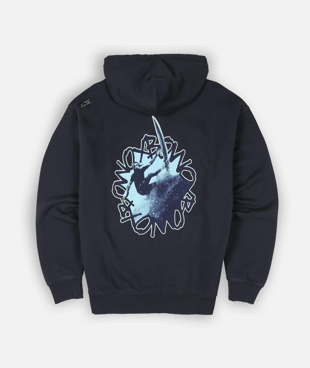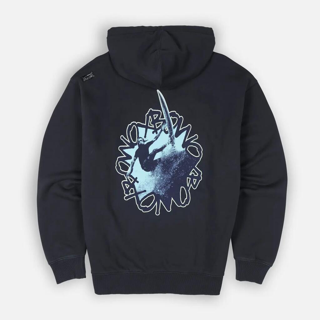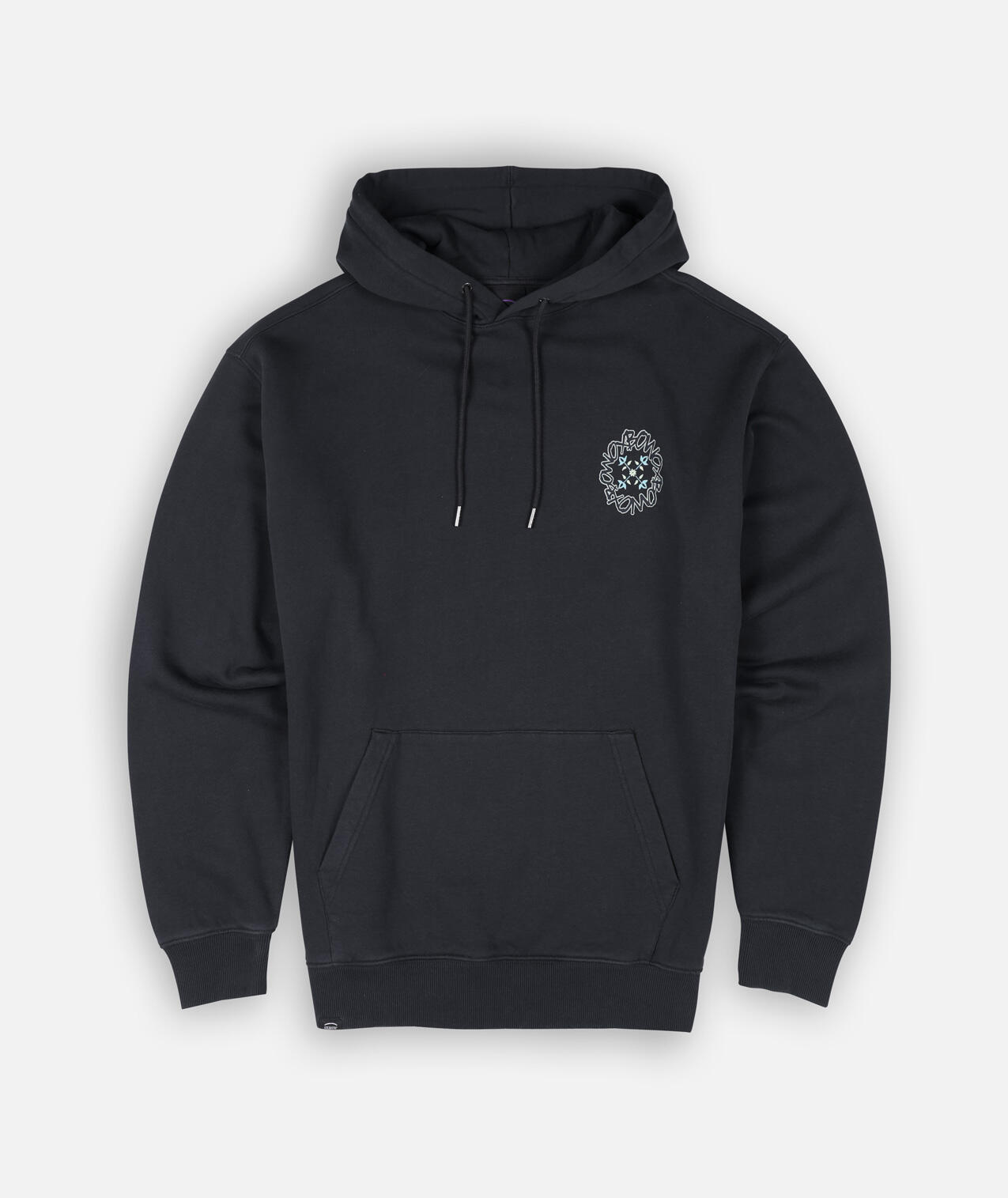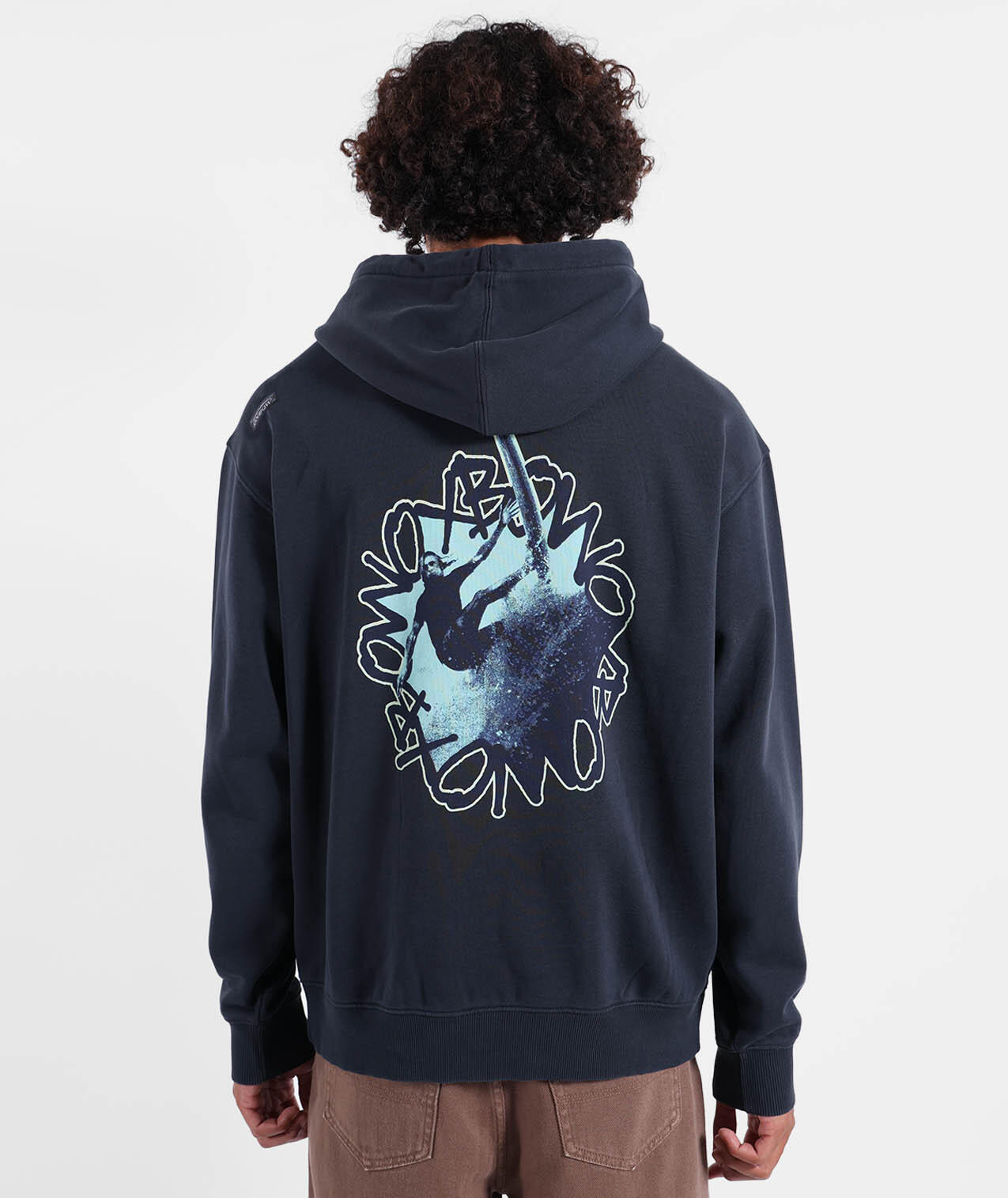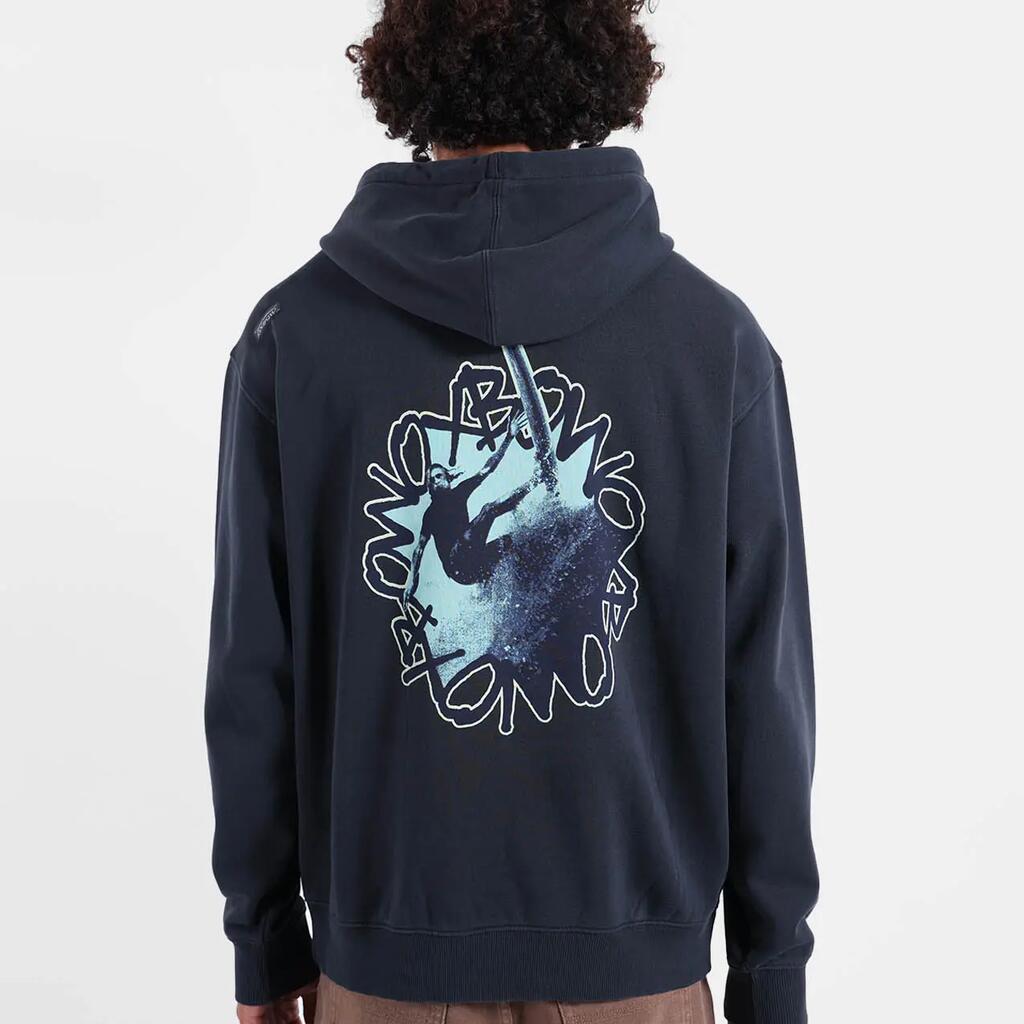 Hooded sweatshirt, ribbed edges, hood with drawstrings, printed graphic on back with chest detail, kangaroo pocket, heavy brushed fleece, dip-dyed and washed for faded colors effect