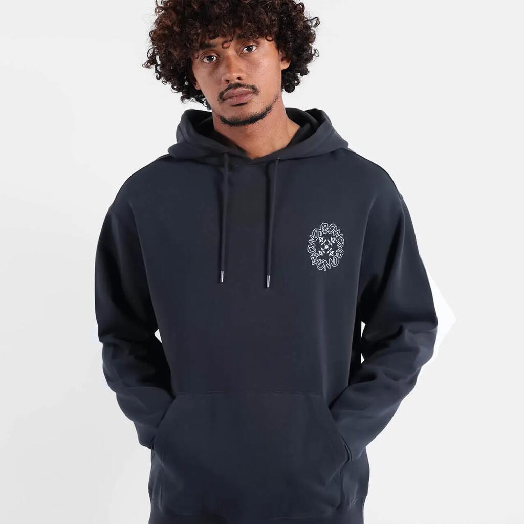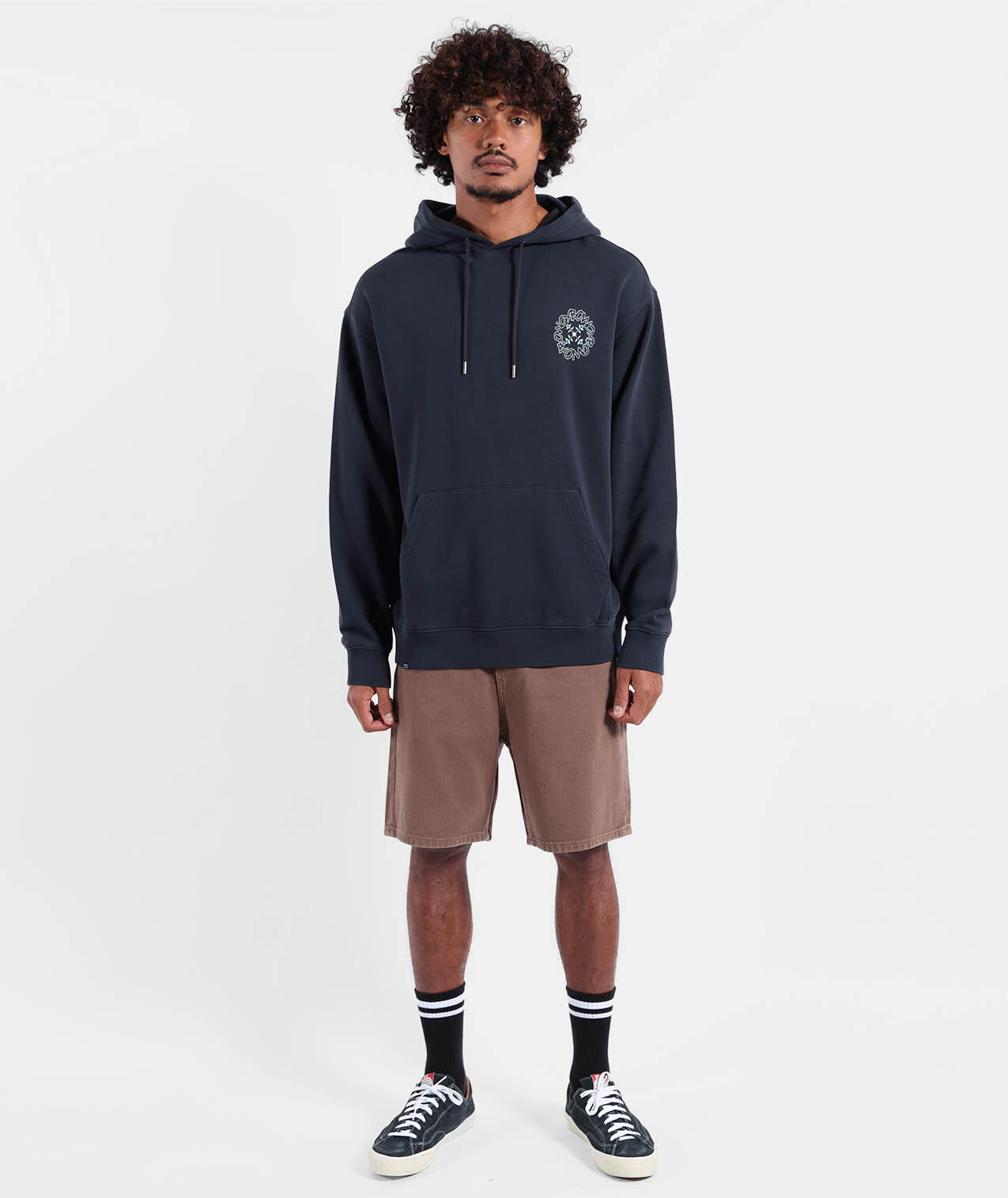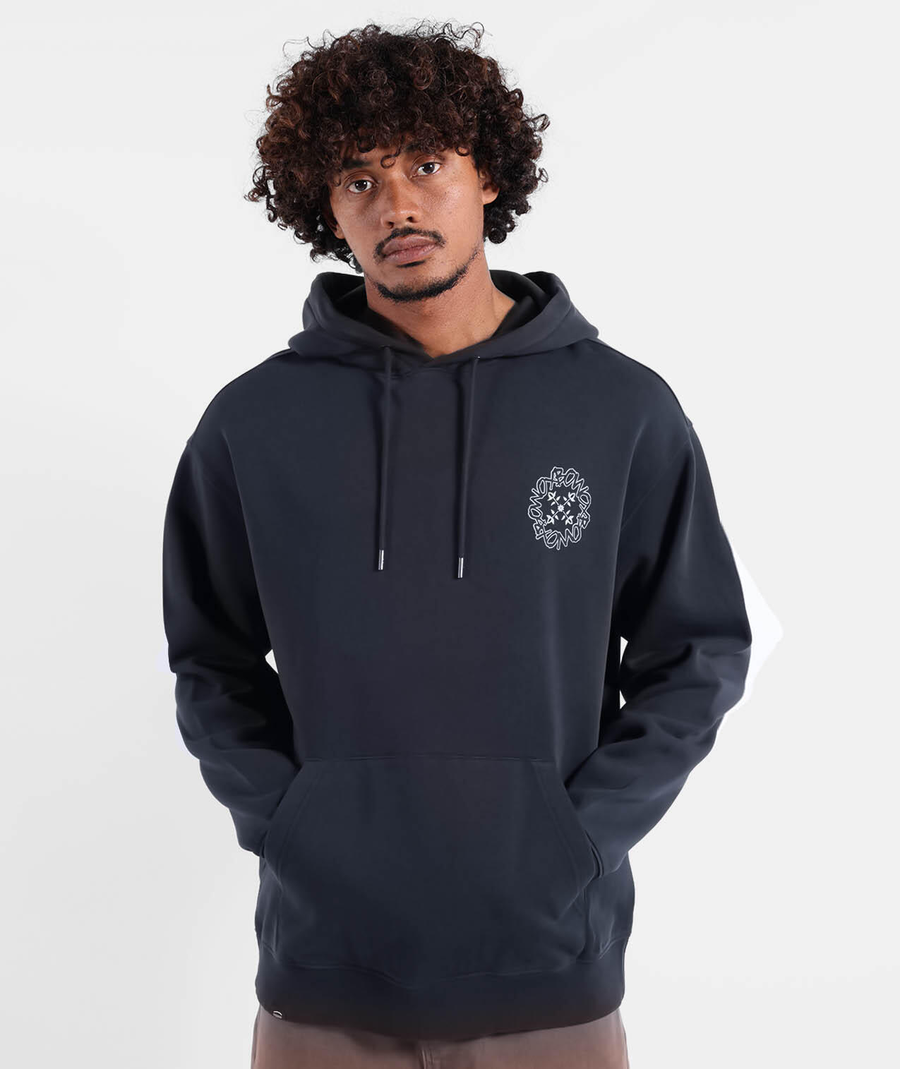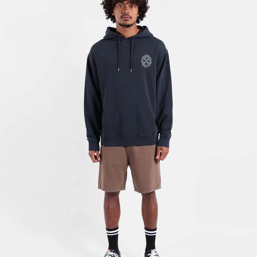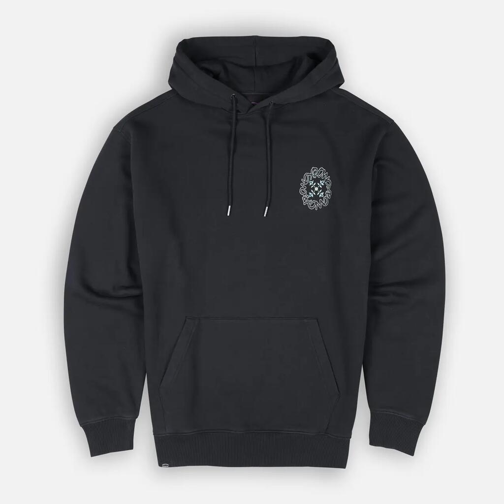 Hooded sweatshirt, ribbed edges, hood with drawstrings, printed graphic on back with chest detail, kangaroo pocket, heavy brushed fleece, dip-dyed and washed for faded colors effect
