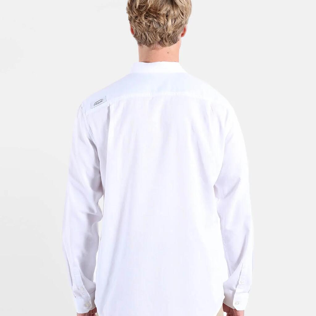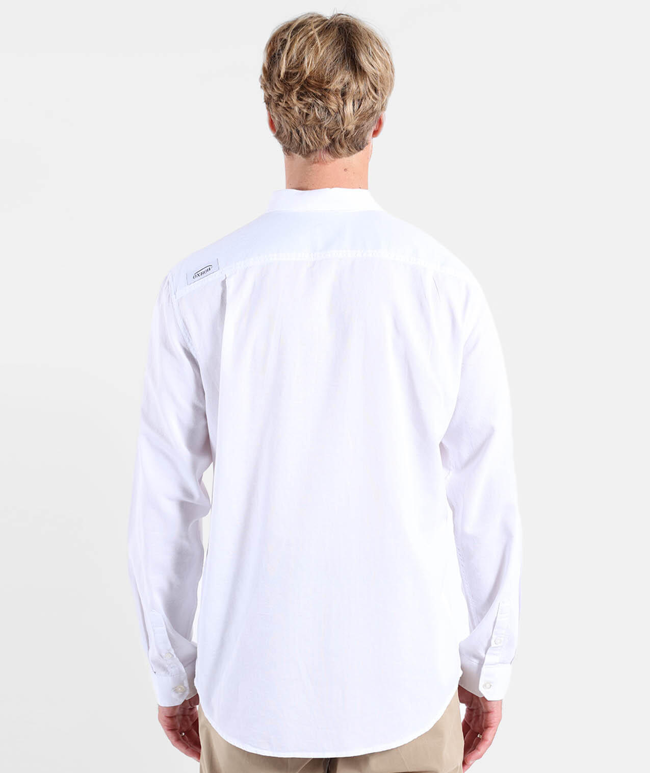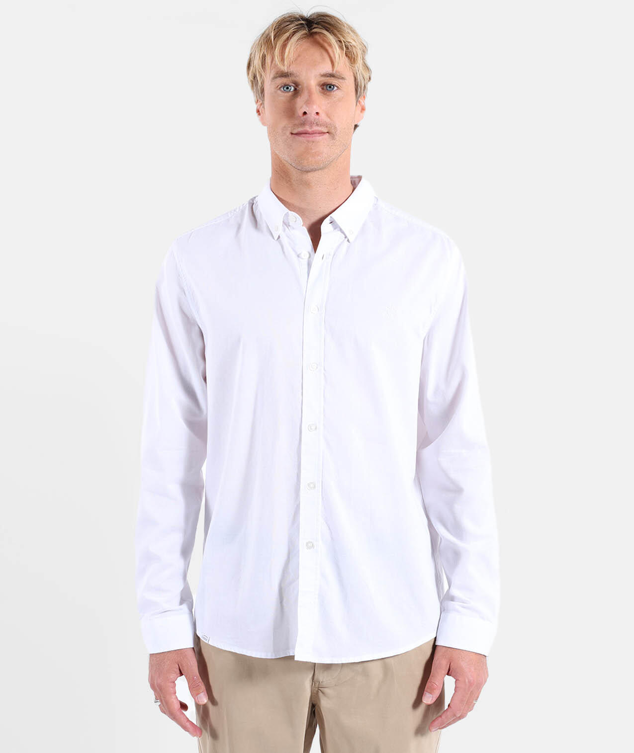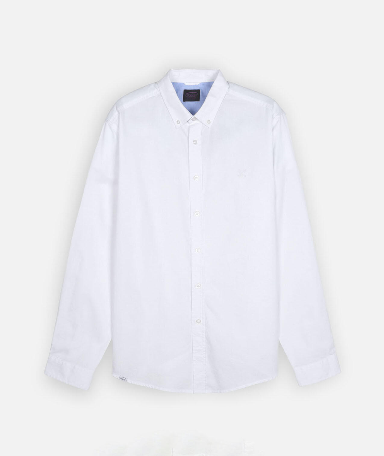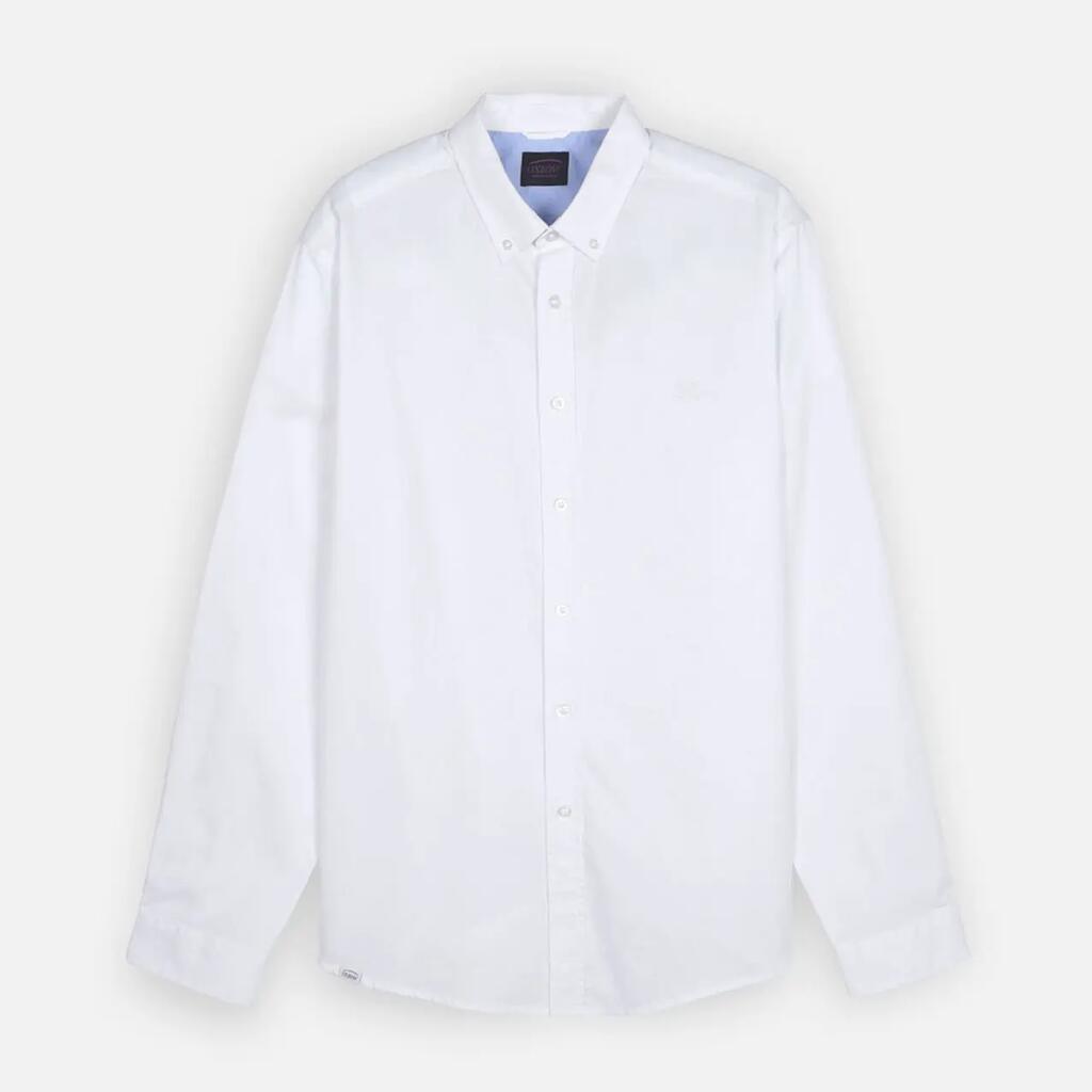 Long-sleeve Italian collar shirt with collar stand, contrasting back yoke in striped poplin, 4flo chest embroidery, 120g/m² Oxford heathered cotton.