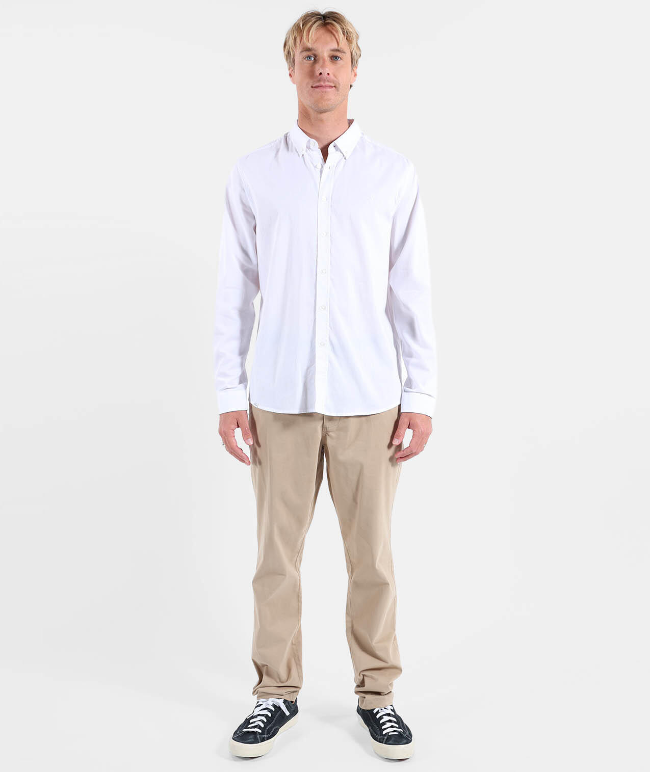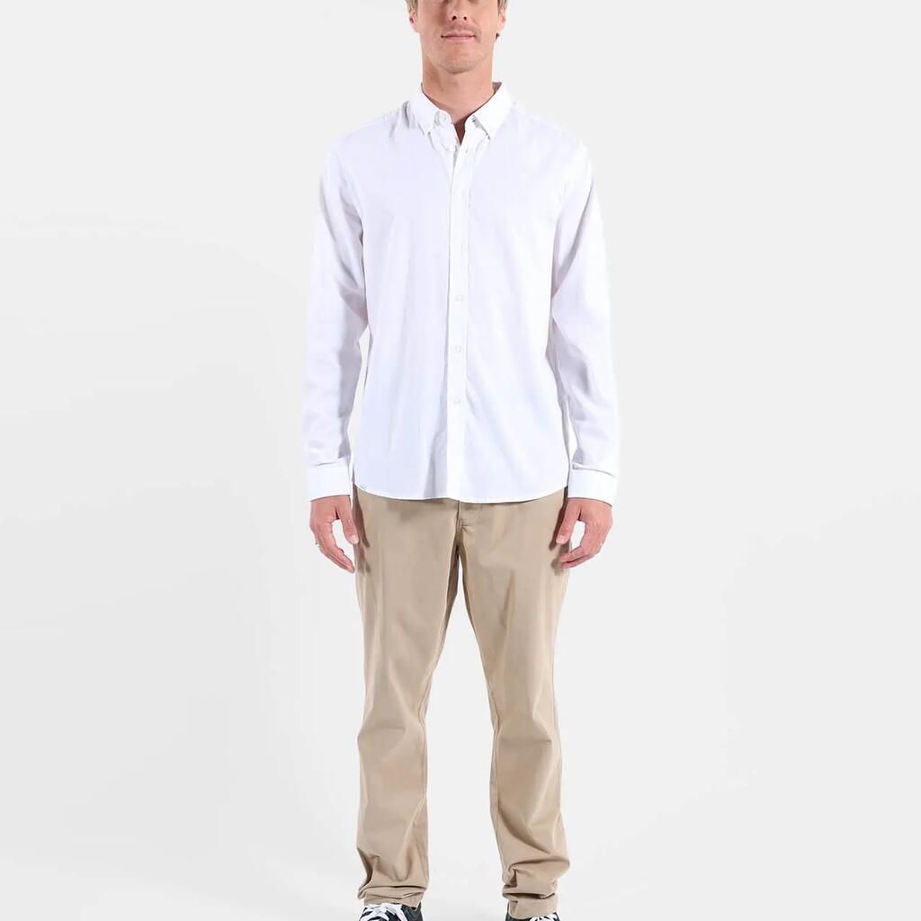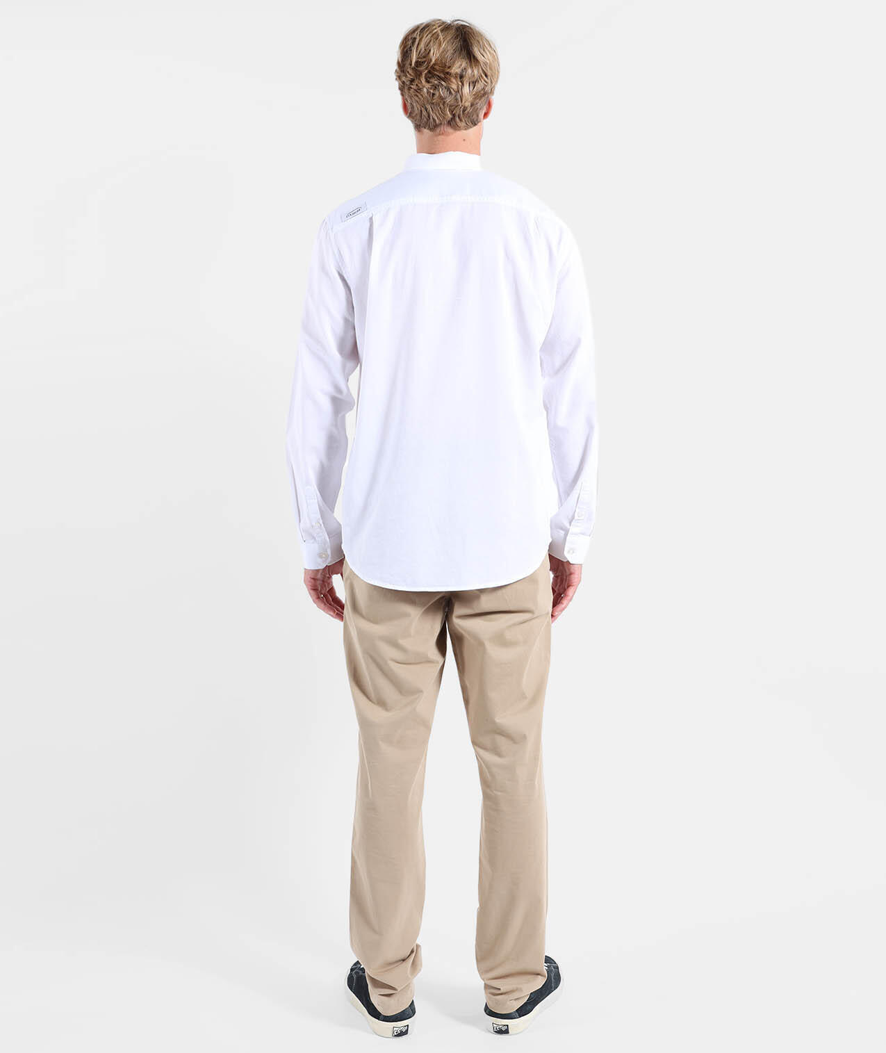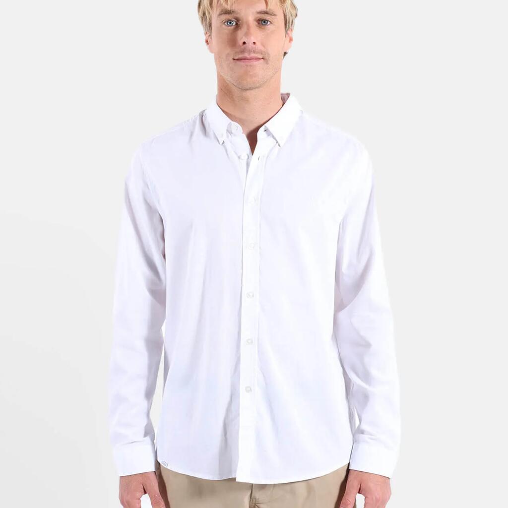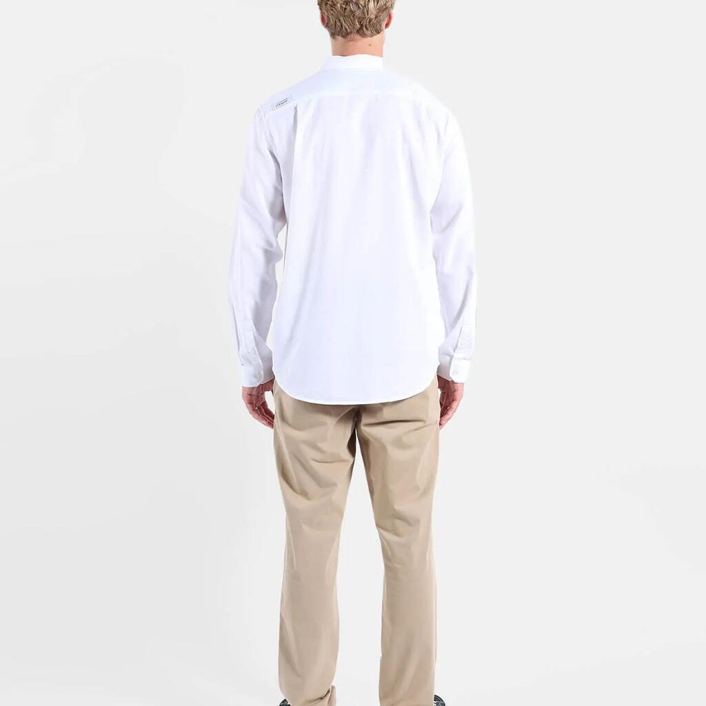Long-sleeve Italian collar shirt with collar stand, contrasting back yoke in striped poplin, 4flo chest embroidery, 120g/m² Oxford heathered cotton.