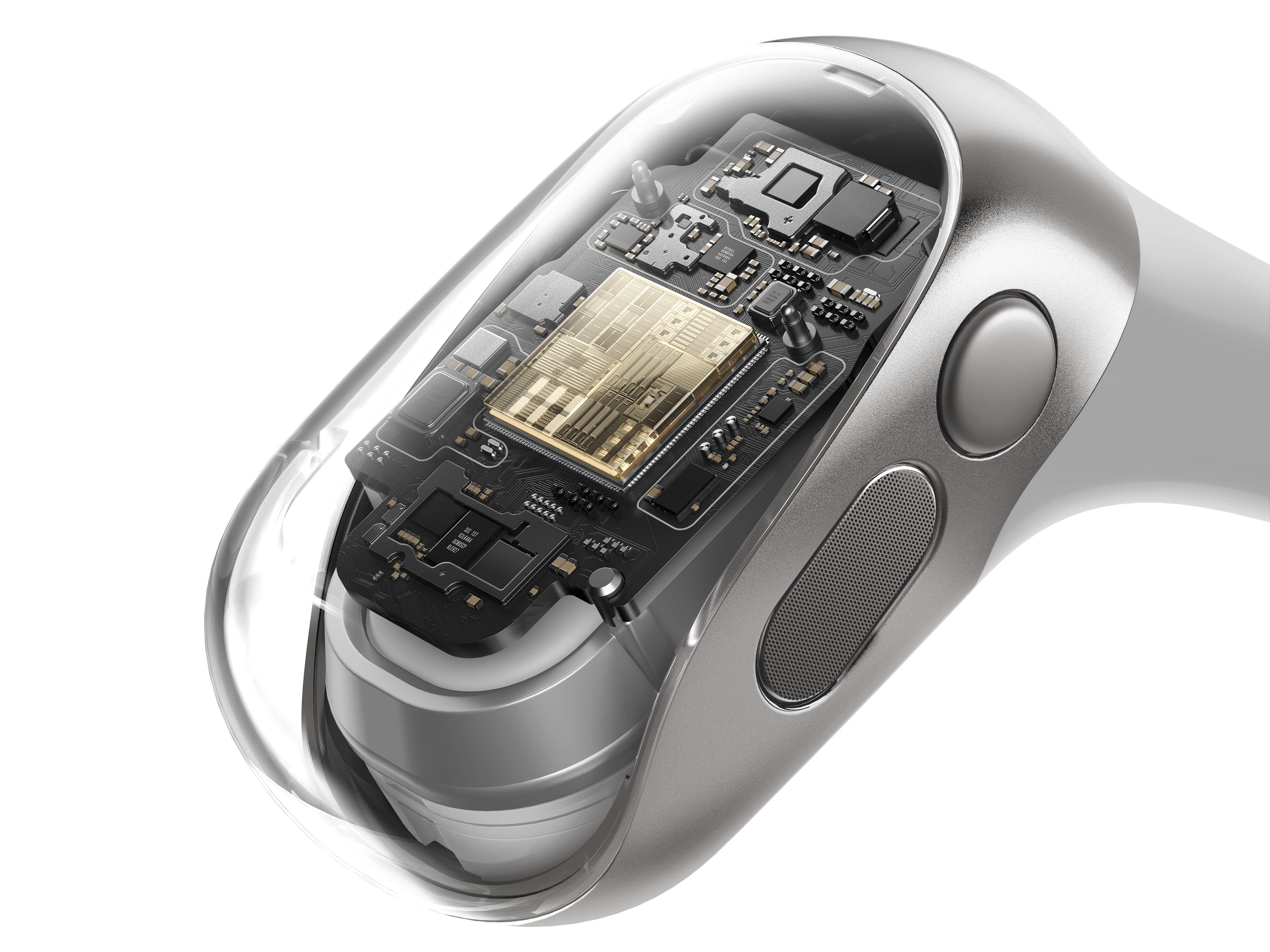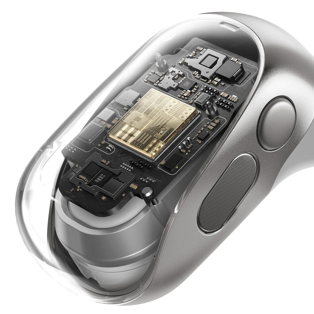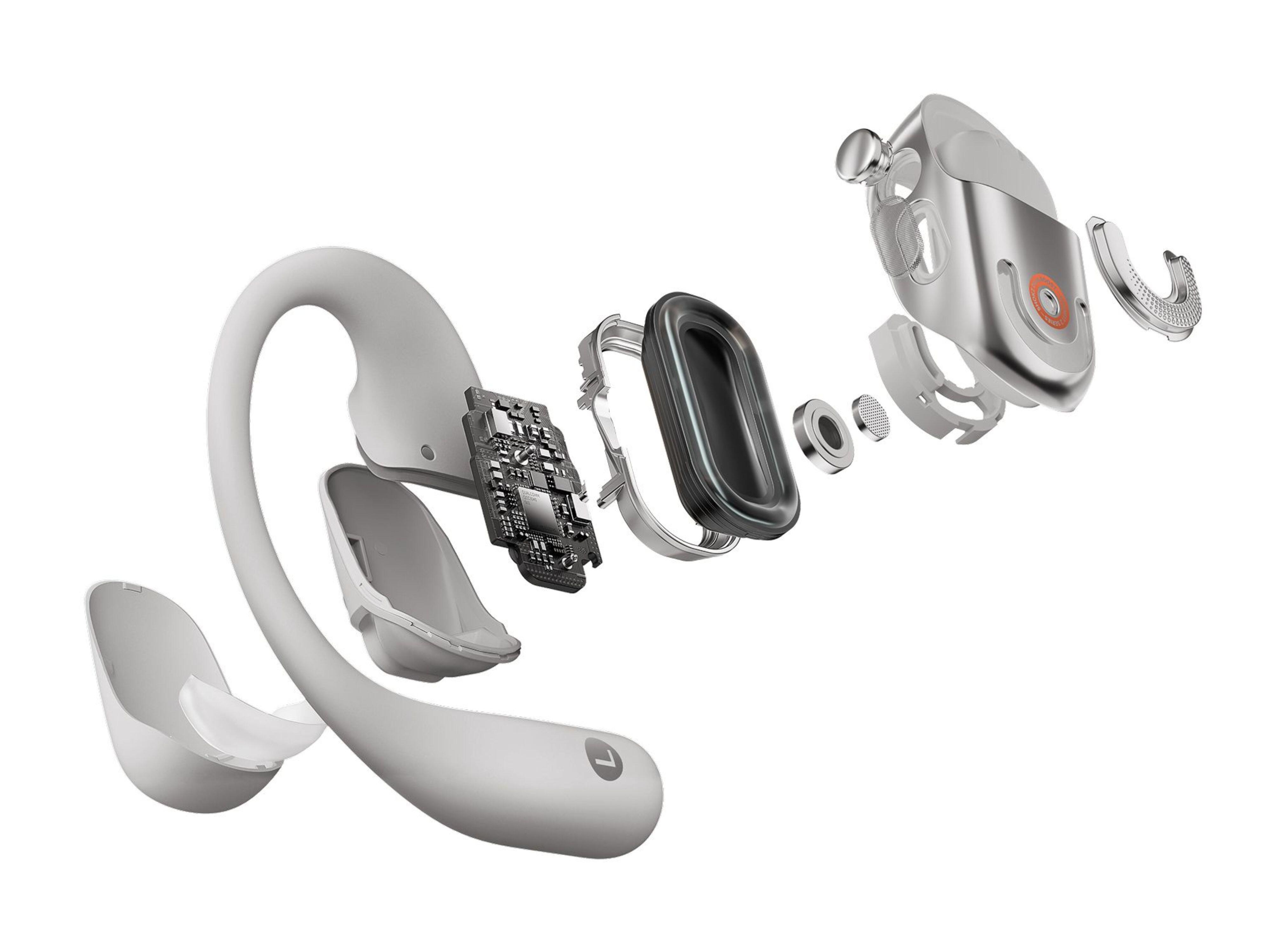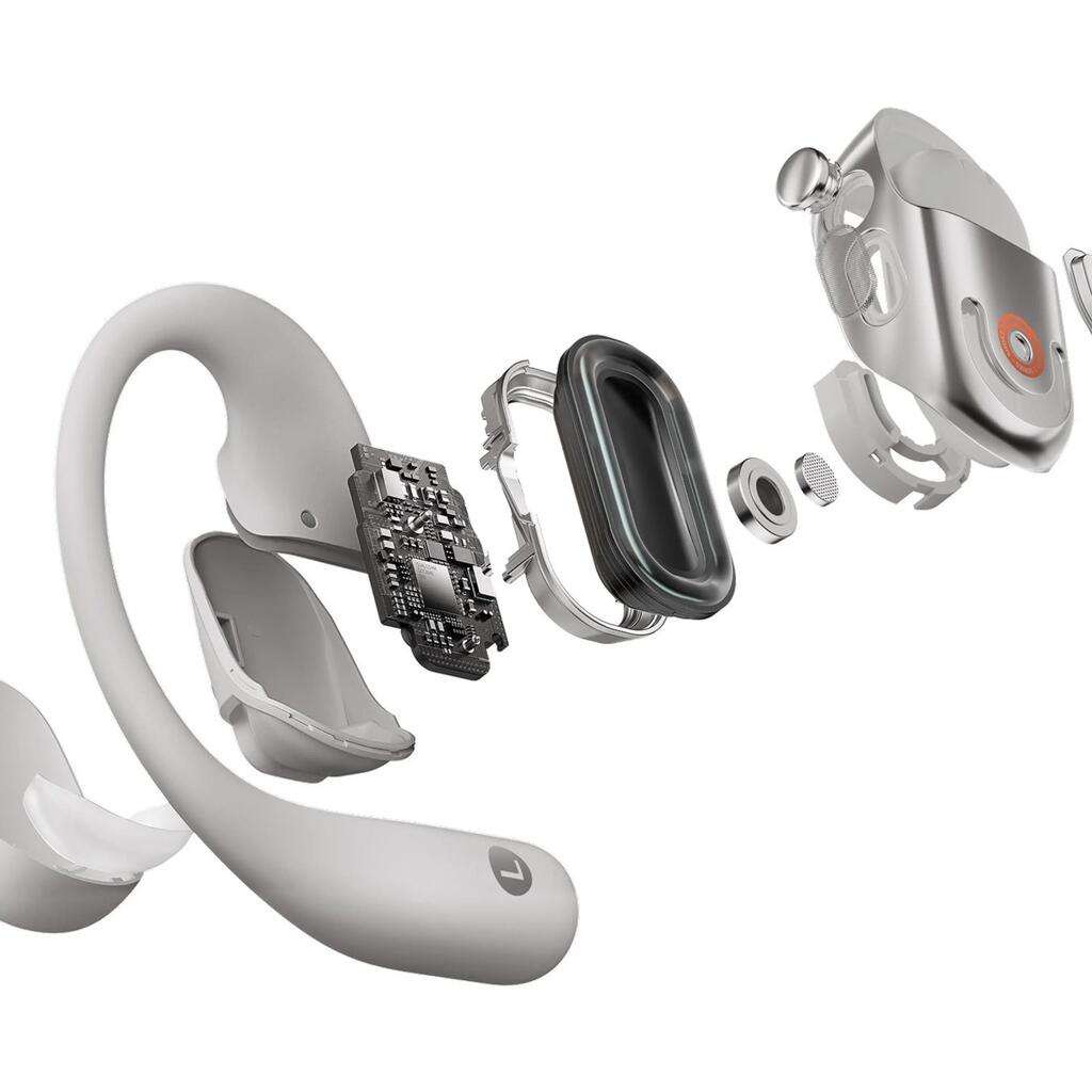 **Comfort and Ergonomics**: The around-the-ear design ensures a secure and comfortable fit, even during the most demanding workouts. The earphones weigh only **9.4 grams**, so you'll forget you're wearing them. The inner silicone layer also contributes to this, ensuring extended use without discomfort.