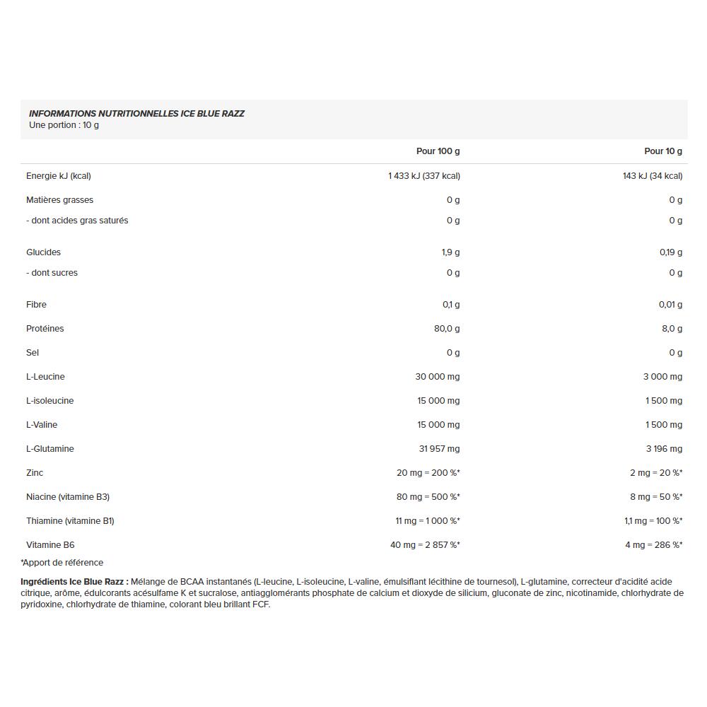 Nutritional information Mango One portion : 10 g Per 100 g Per 10 g Energy kJ (kcal) 1 433 kJ (337 kcal) 143 kJ (34 kcal) Fat - of which saturated fatty acids 0 g 0 g 0 g 0 g Carbohydrates - of which sugars 2.2 g 0.2 g 0.22 g 0.02 g Fibre 0 g 0 g Protein 79.7 g 8,0 g Salt 0 g 0 g L-Leucine 30 000 mg 3 000 mg L-Isoleucine 15 000 mg 1 500 mg L-Valine 15 000 mg 1 500 mg L-Glutamine 31 957 mg 3 196 mg Zinc 20 mg = 200 %* 2 mg = 20 %* Niacin (vitamin B3) 80 mg = 500 %* 8 mg = 50 %* Thiamine (vitamin B1) 11 mg = 1 000 %* 1,1 mg = 100 %* Vitamin B6 40 mg = 2 857 %* 4 mg = 286 %* *Reference intakeNutritional information Ice Blue Razz One portion : 10 g Per 100 g Per 10 g Energy kJ (kcal) 1,433 kJ (337 kcal) 143 kJ (34 kcal) Fat - of which saturated fatty acids 0 g 0 g 0 g 0 g Carbohydrates - of which sugars 1.9 g 0 g 0.19 g 0 g Fiber 0.1 g 0.01 g Protein 80.0 g 8,0 g Salt 0 g 0 g L-Leucine 30,000 mg 3,000 mg L-Isoleucine 15,000 mg 1,500 mg L-Valine 15,000 mg 1,500 mg L-Glutamine 31,9