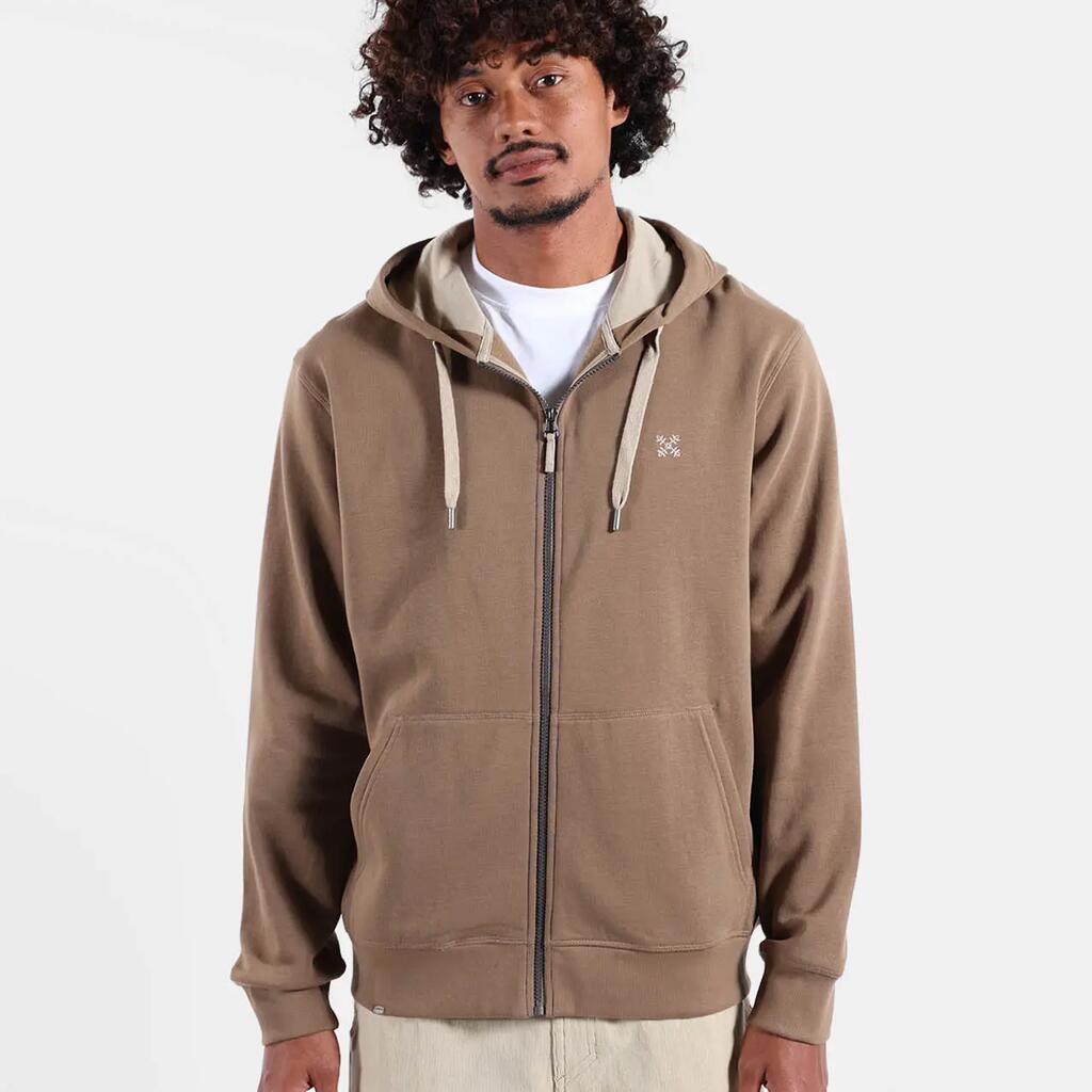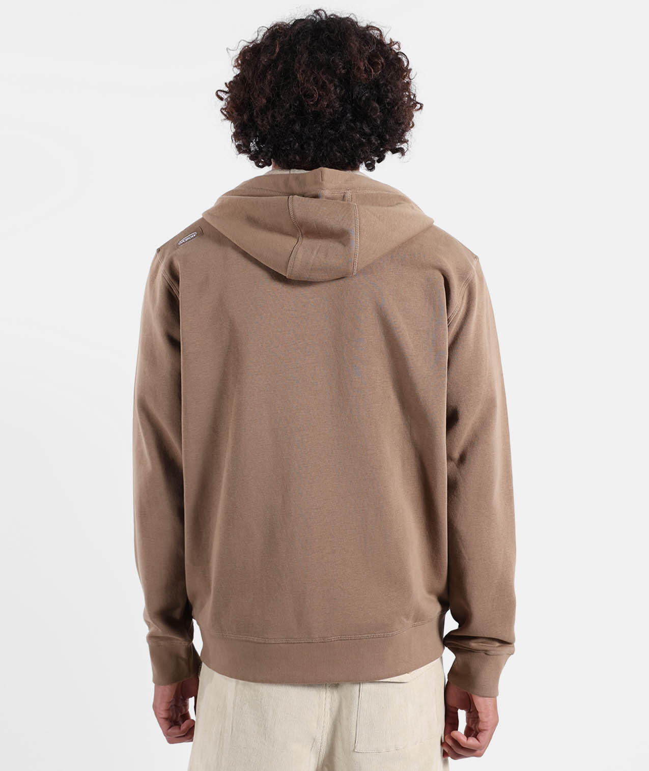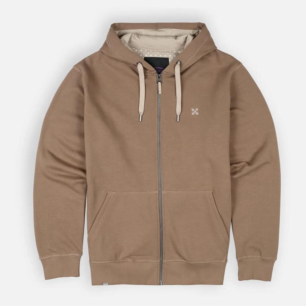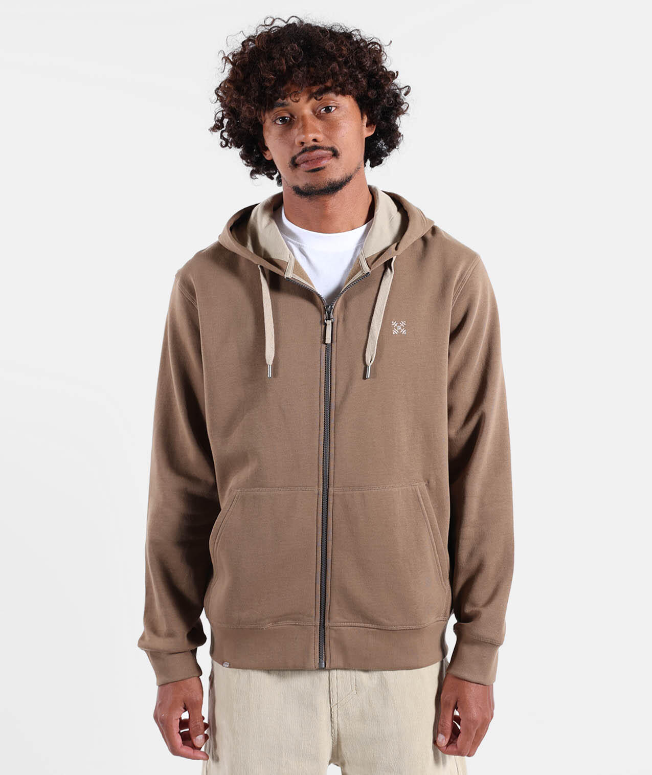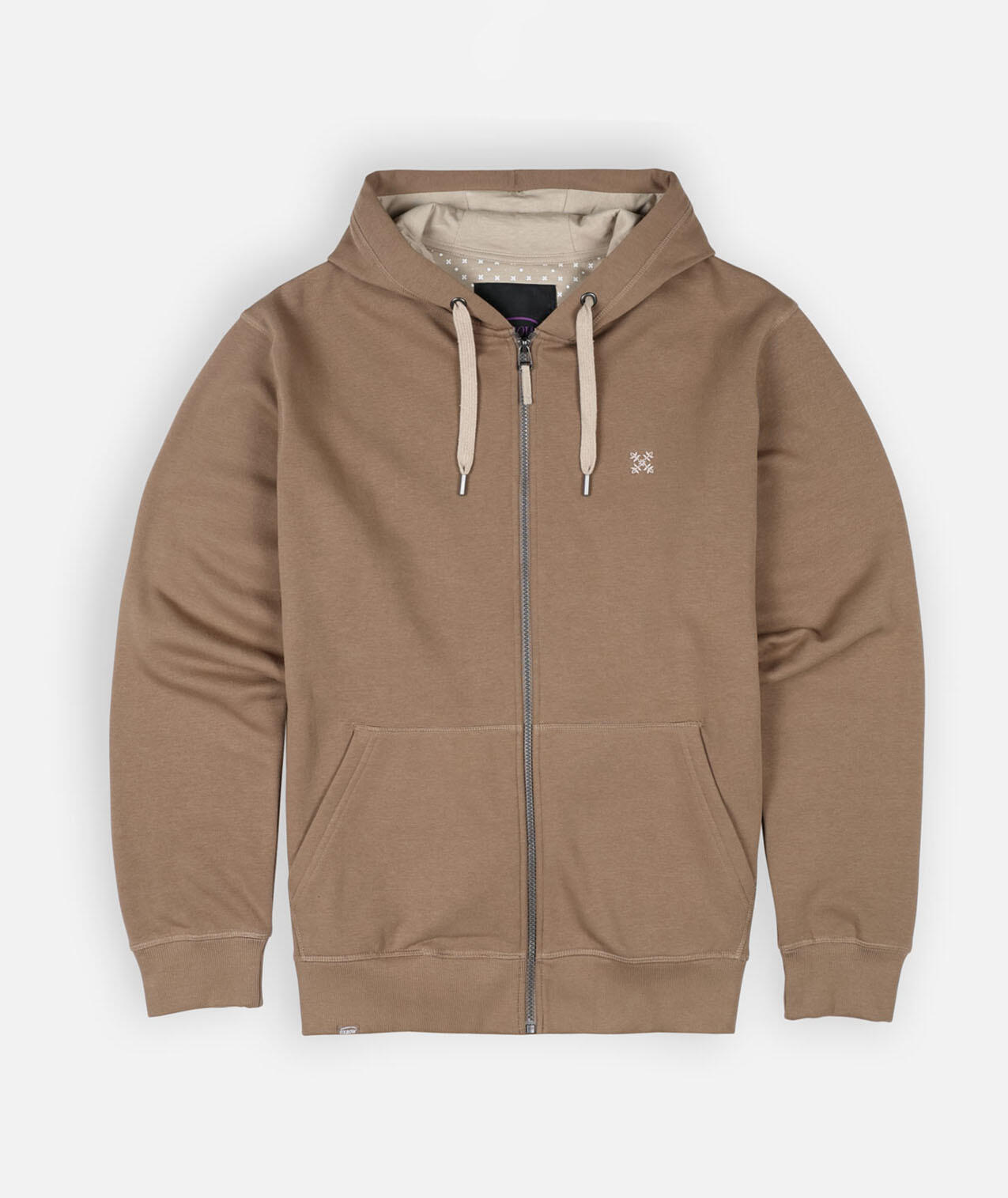 Fully zipped hooded sweatshirt, ribbed edges, contrast drawstring at hood, printed half-moon, contrast inner hood lining, kangaroo pocket, brushed fleece