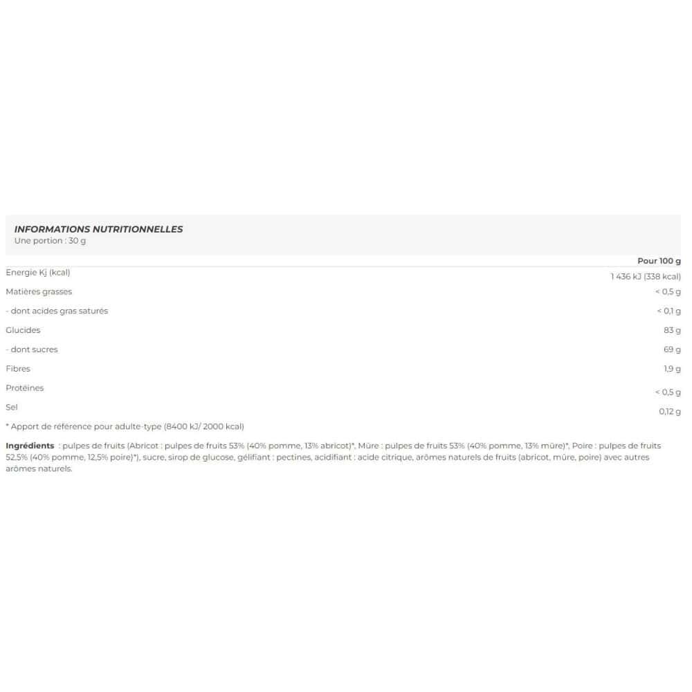 Fruit pastes (6x30g), the ultimate energy boost designed by Punch Power for endurance athletes.With 83g of carbohydrates per 100g, these pastes offer rapid assimilation, ideal for snacks during exercise or to satisfy a sudden craving and boost your performance.Made with over 50% fruit, they are both nutritious and easily digestible, providing essential carbohydrates for an immediate energy boost.Their practical format means you can take them everywhere, whether in a belt or a running vest. Unlike some gels and drinks, the texture of fruit pastes combined with their light sweetness limits the sensation of saturation when consumed.Preservative-free and made in France, these fruit pastes are suitable for all outdoor sports, whether trail running, triathlon or cycling.They'll become your essential ally in pushing back your limits!Available in refreshing flavours in packs of 6: Blackberry(x6) and Fruit Mix(x2 apricot, x2 pear, x2 blackberry).