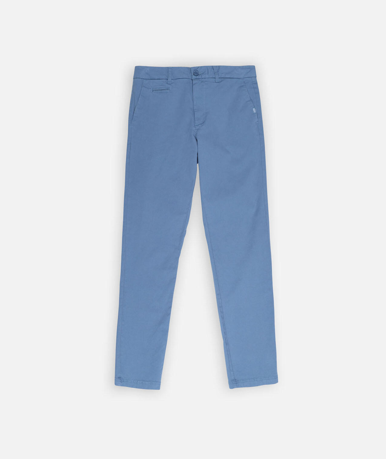 Solid stretch chino in peach-touch twill, zip fly, contrasting inner waistband, printed pockets, buttoned back pockets, length 81.5–84 cm depending on size.
