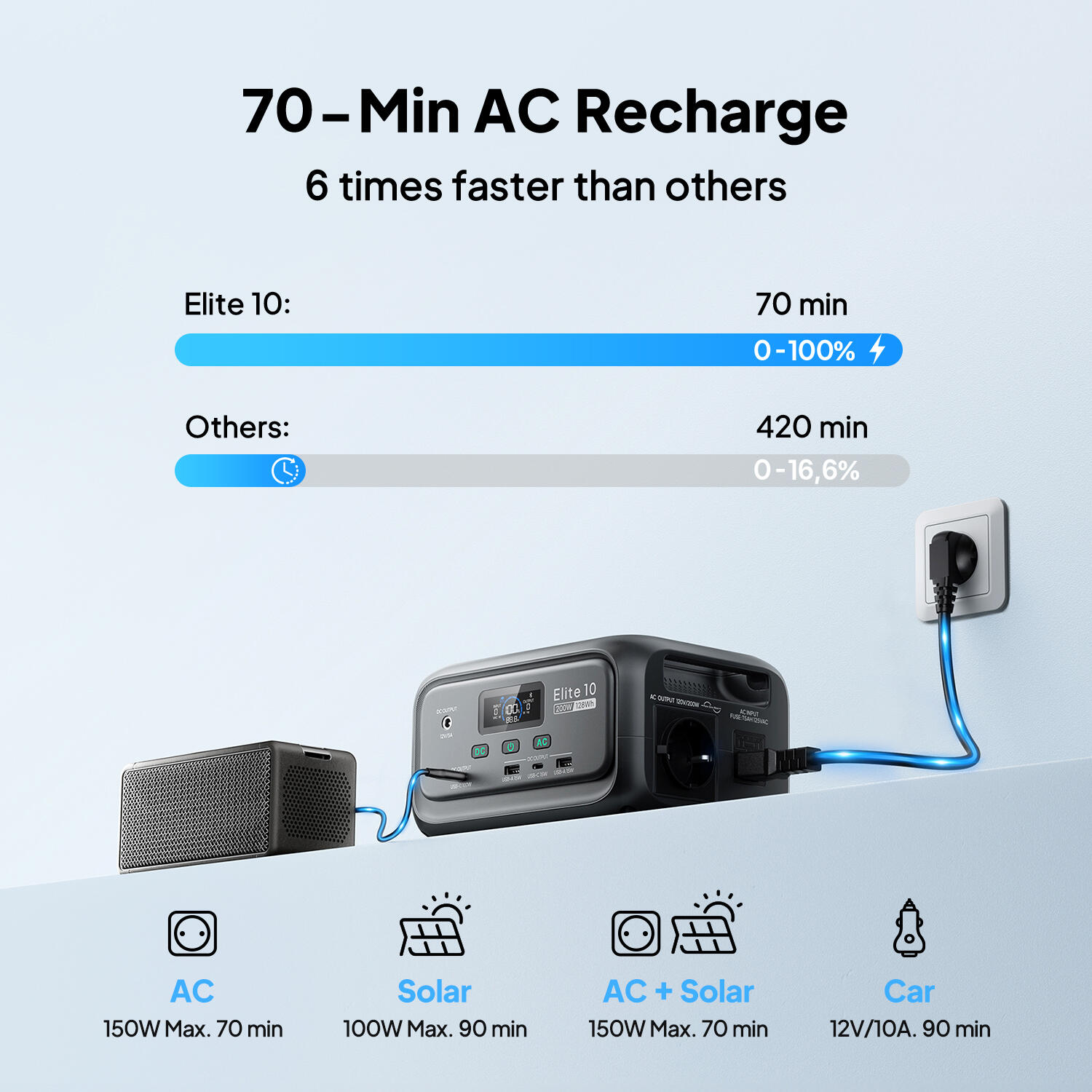[Fast & Flexible Recharge] - Elite 10 supports 3 charging methods to keep you powered anywhere: 150W AC charging (full in just 70 mins for urgent use), 100W solar charging (pair with BLUETTI PV60L/PV60F/PV100 panels for off-grid freedom), and 100W car charging via cigarette lighter. Whether at home, on the road, or outdoors, you’ll always have a fast and reliable way to top up—no more anxiety about running out of power.