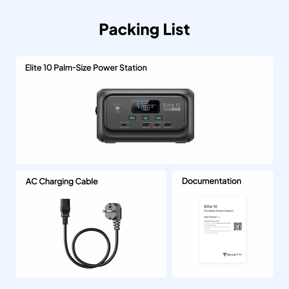 [Beyond a Power Bank] - More than a power bank, Elite 10 is a 128Wh portable power station with a 200W AC outlet, 100W USB-C fast charging, and multiple DC ports. Equivalent to 4 regular power banks, it easily powers laptops, drones, cameras, and other small devices during camping, travel, or unexpected outages—your compact generator for everyday backup.