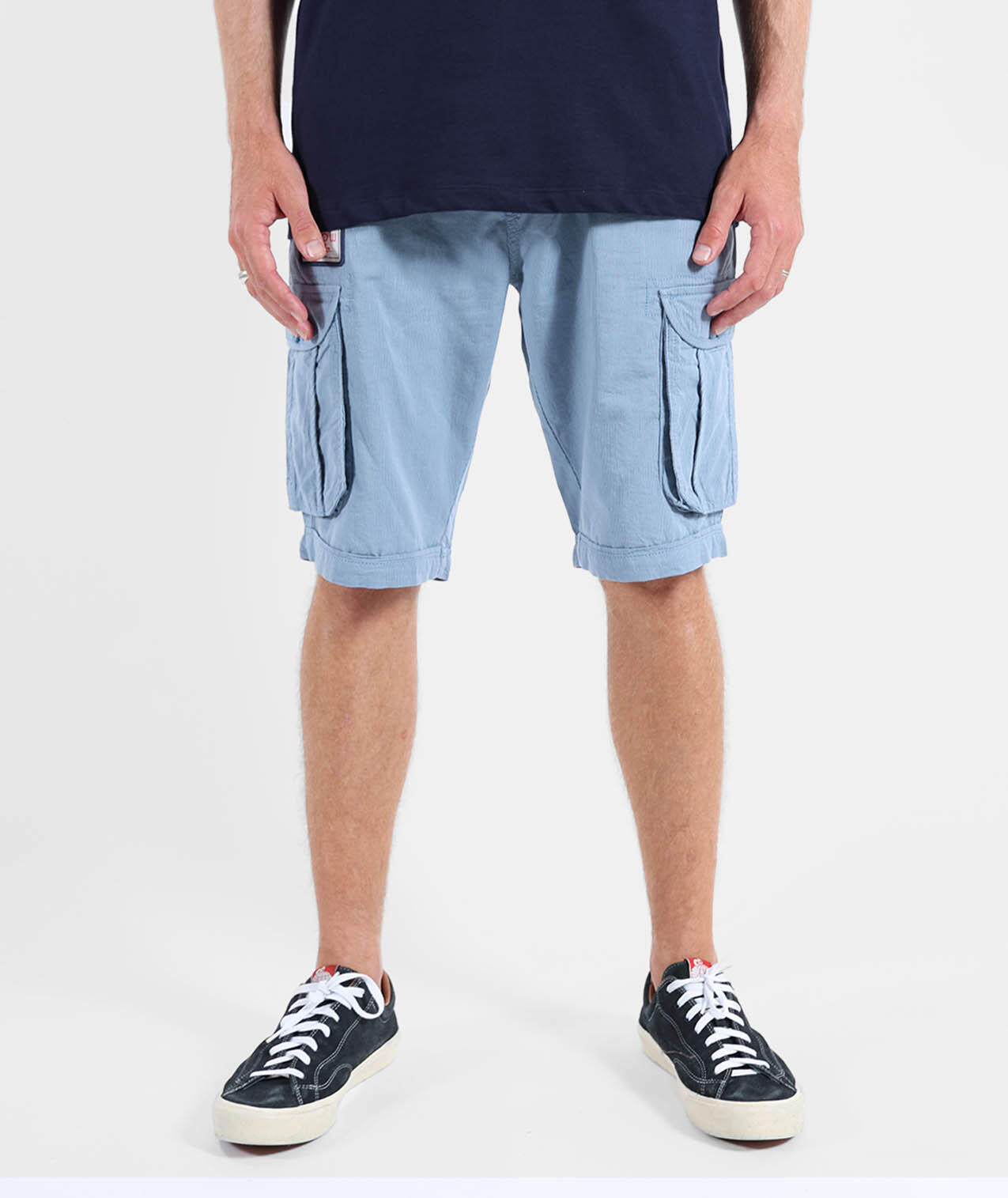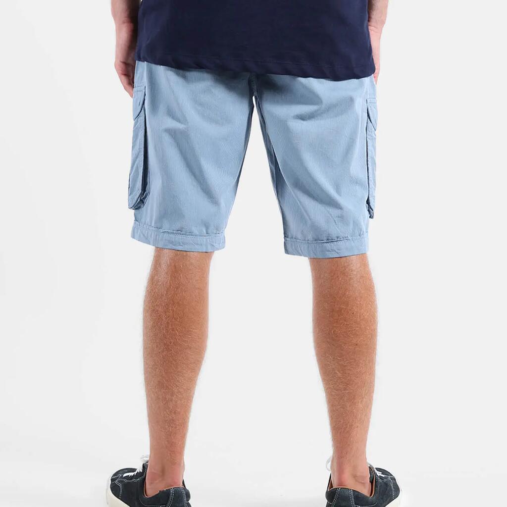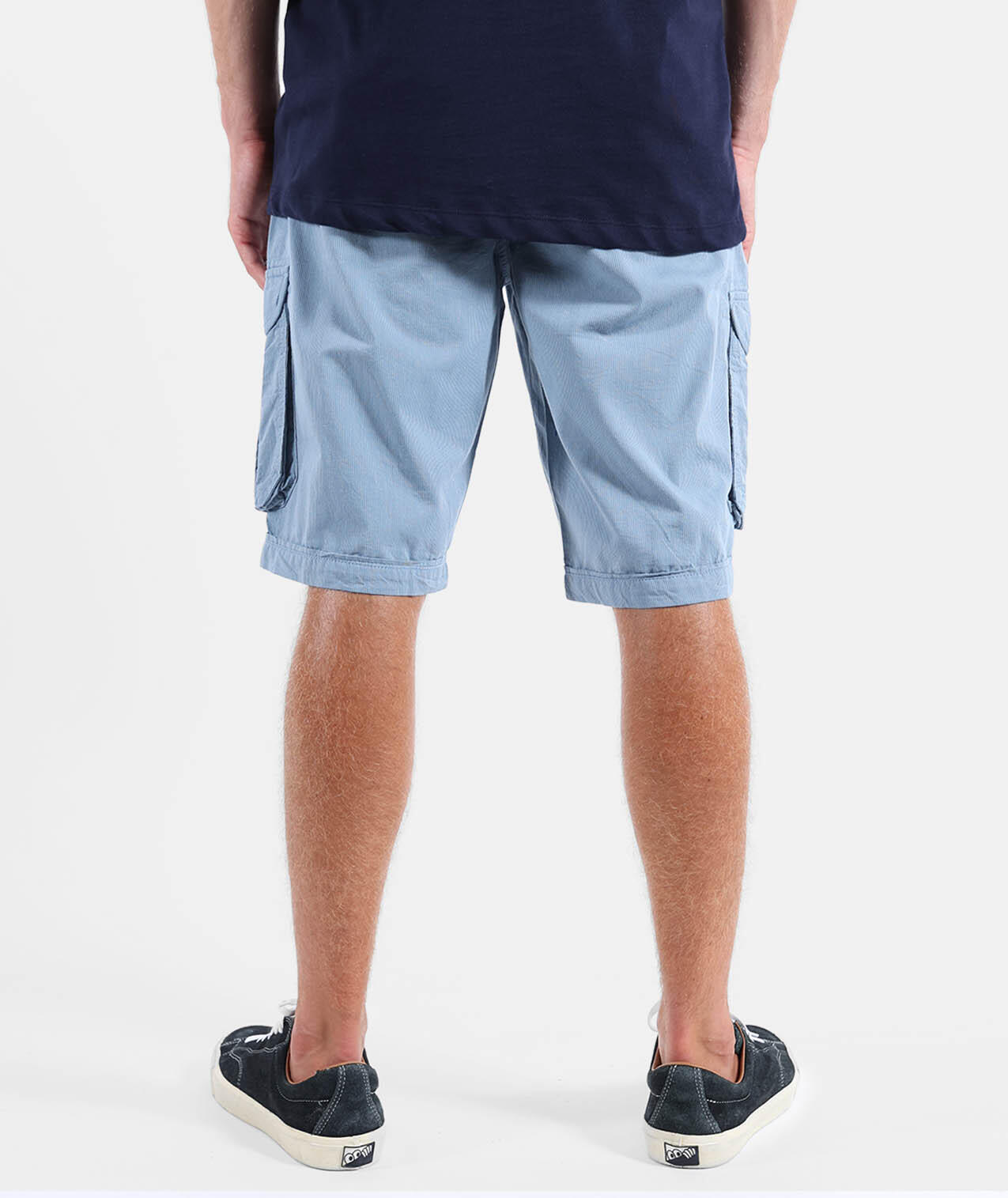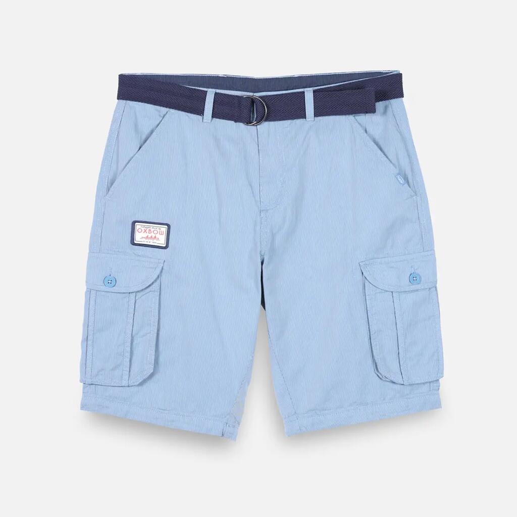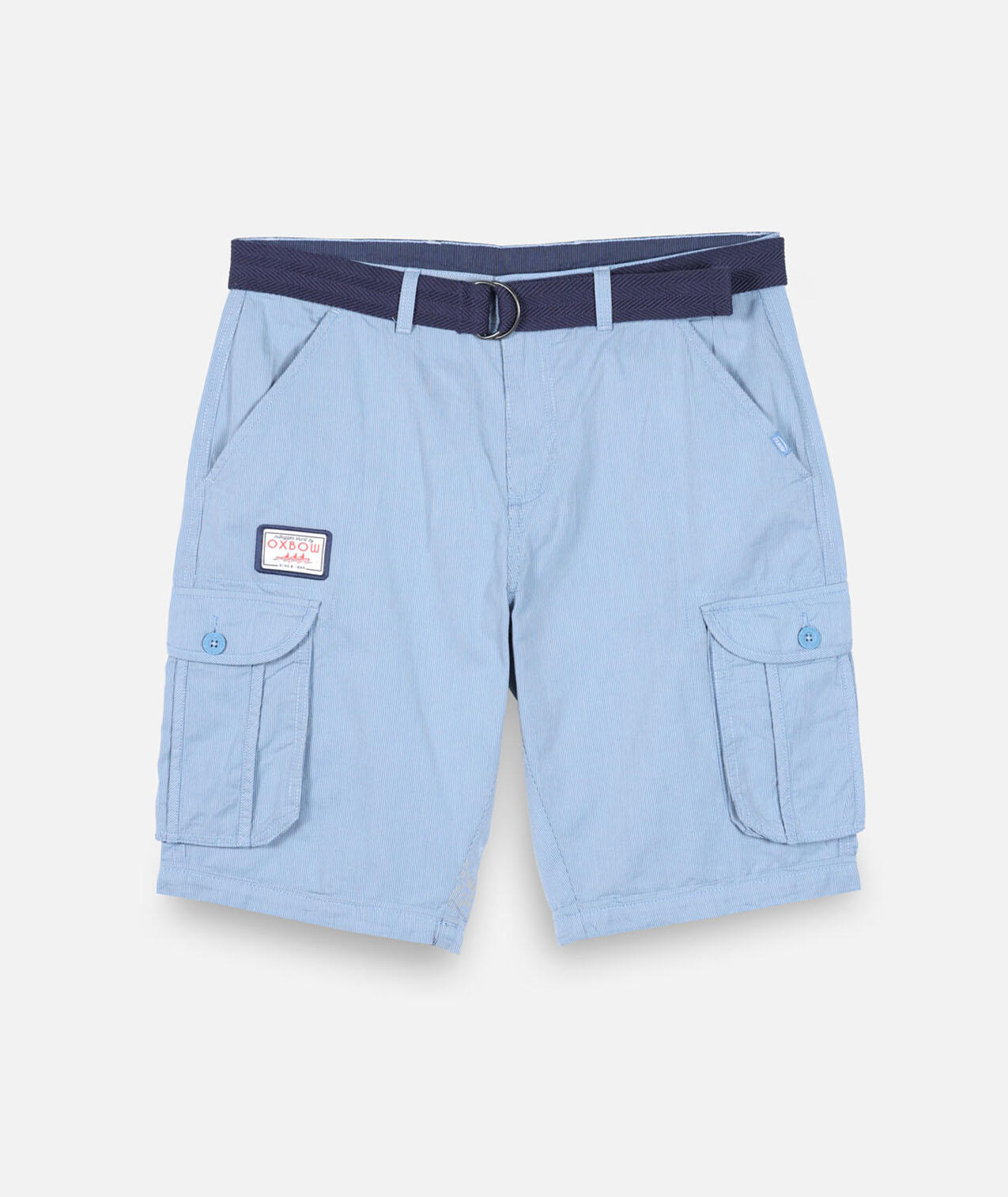 Striped bermuda shorts, braided belt with metal buckle, two back pockets and two buttoned cargo pockets, zip fly, drative label, woven stripe, length 21''/54cm
