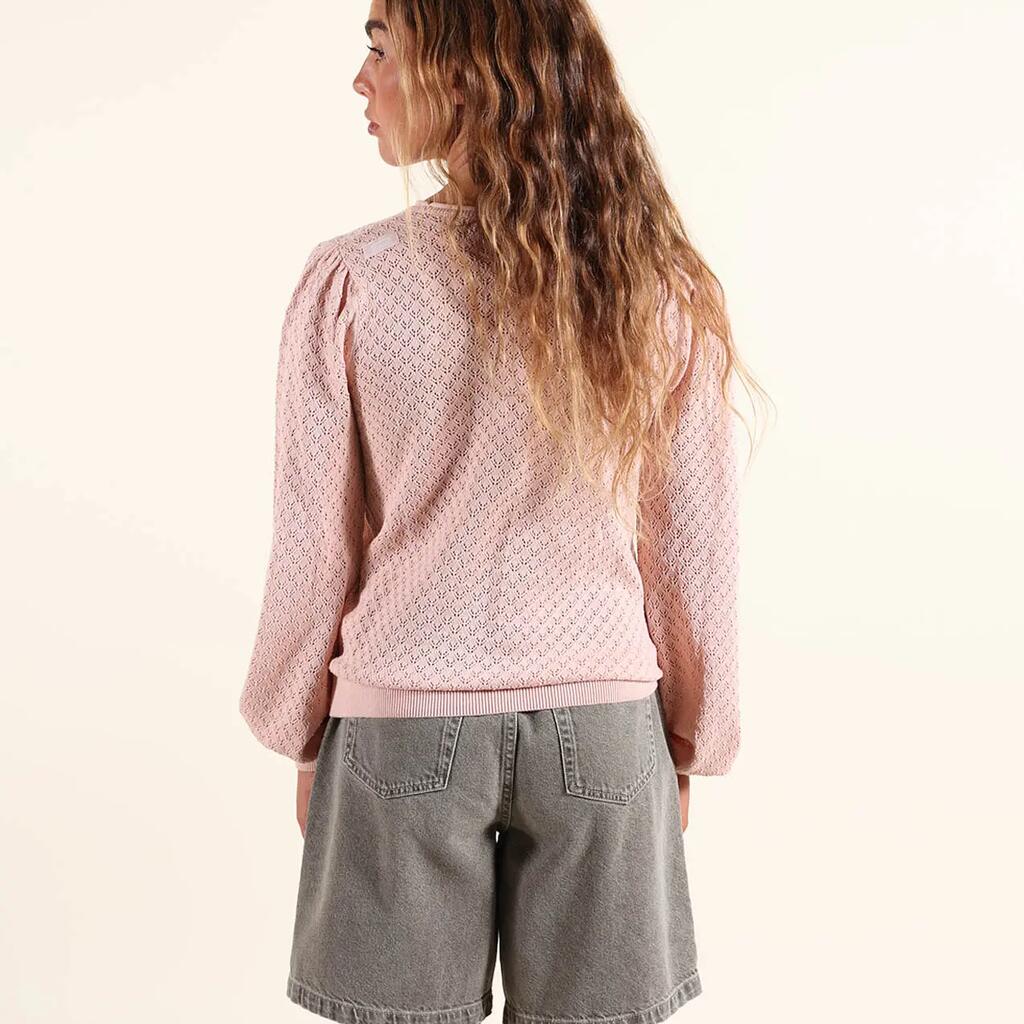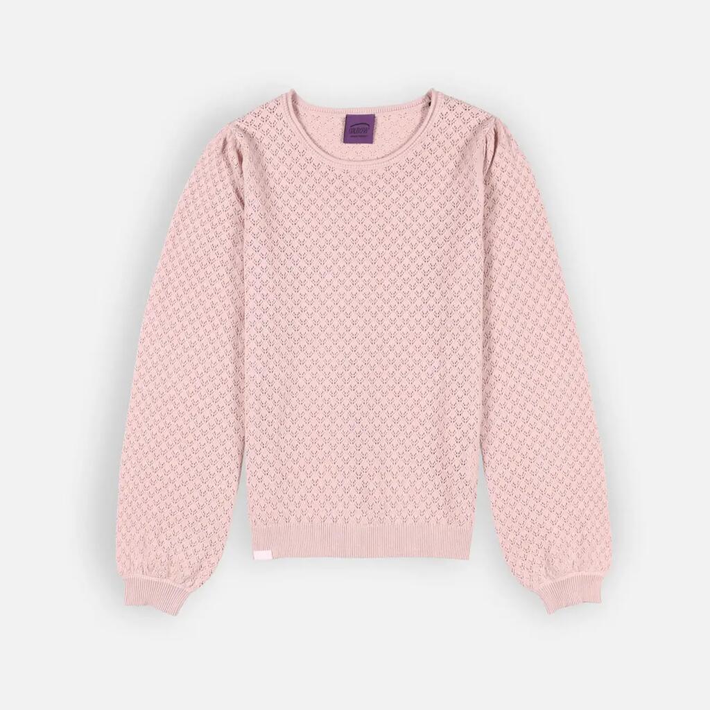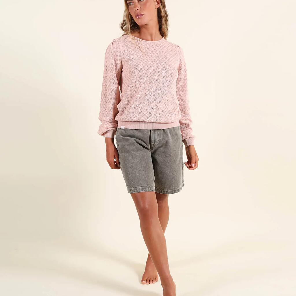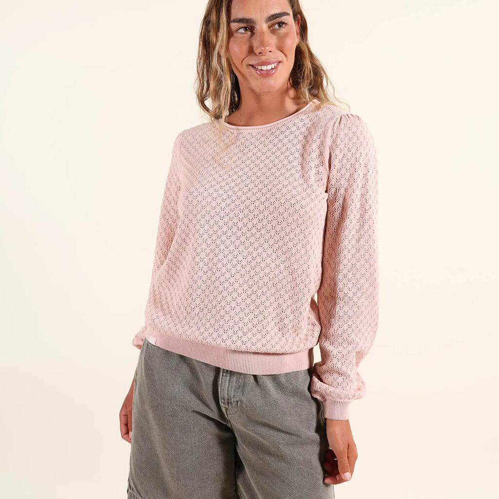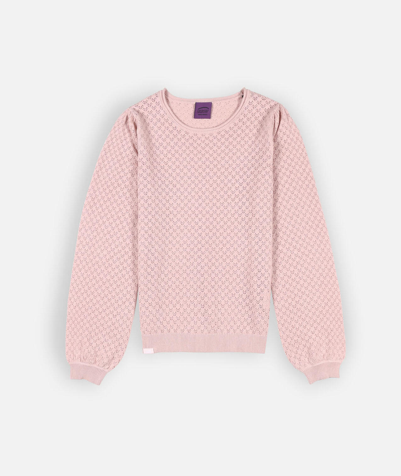 Lightweight gauge 12 sweater with round neck and fancy open stitch, embroidered patch on chest and Oxbow label on shoulder.