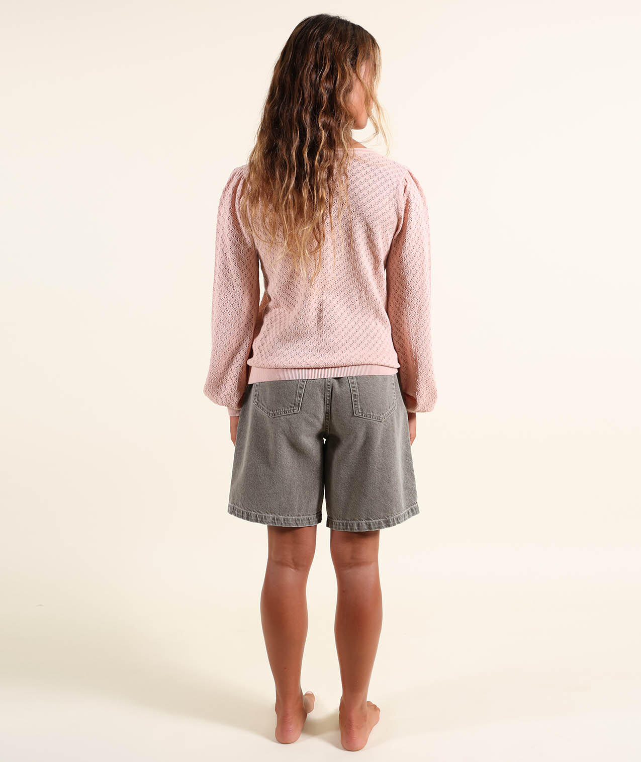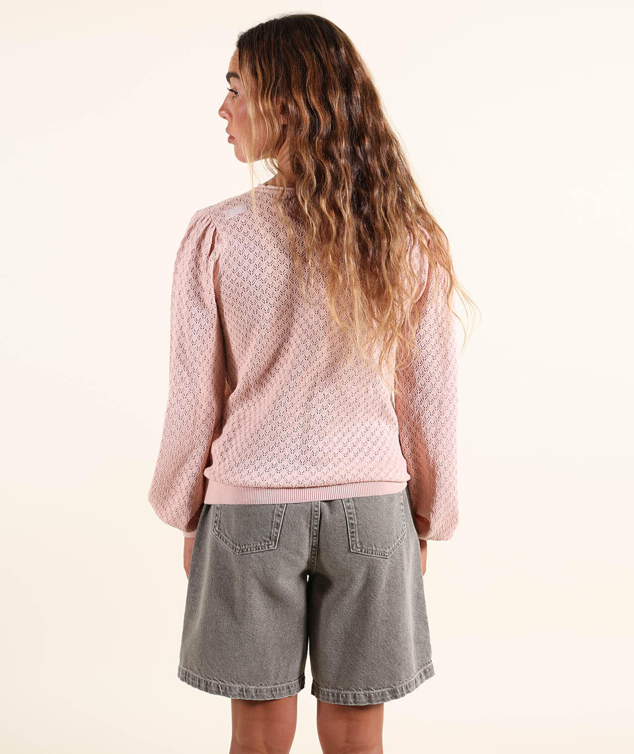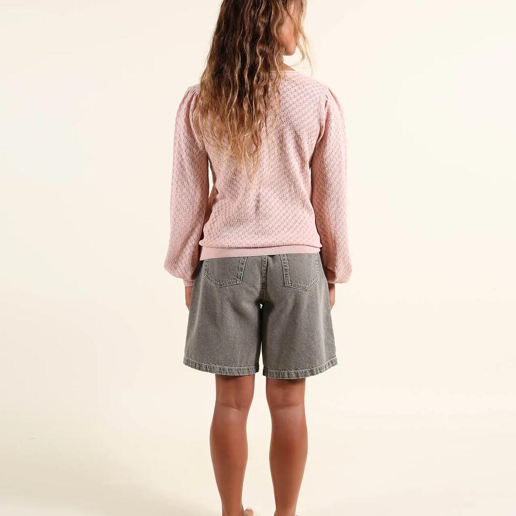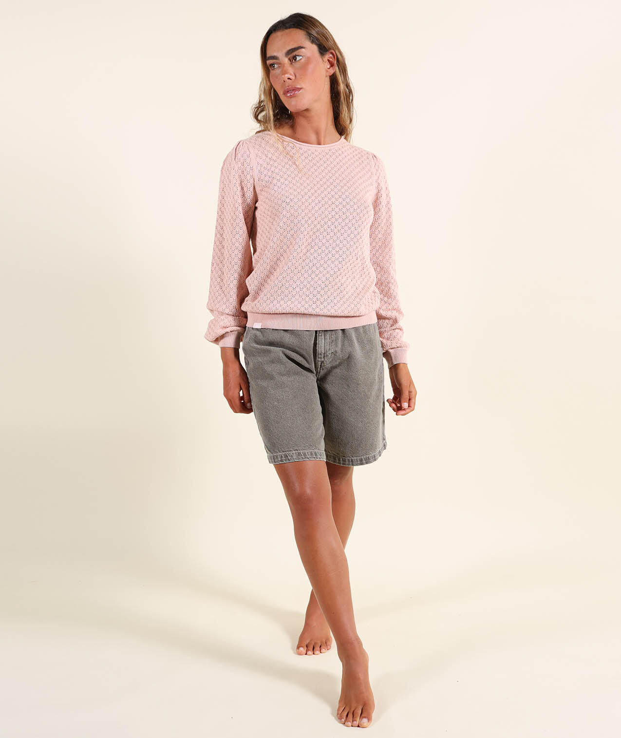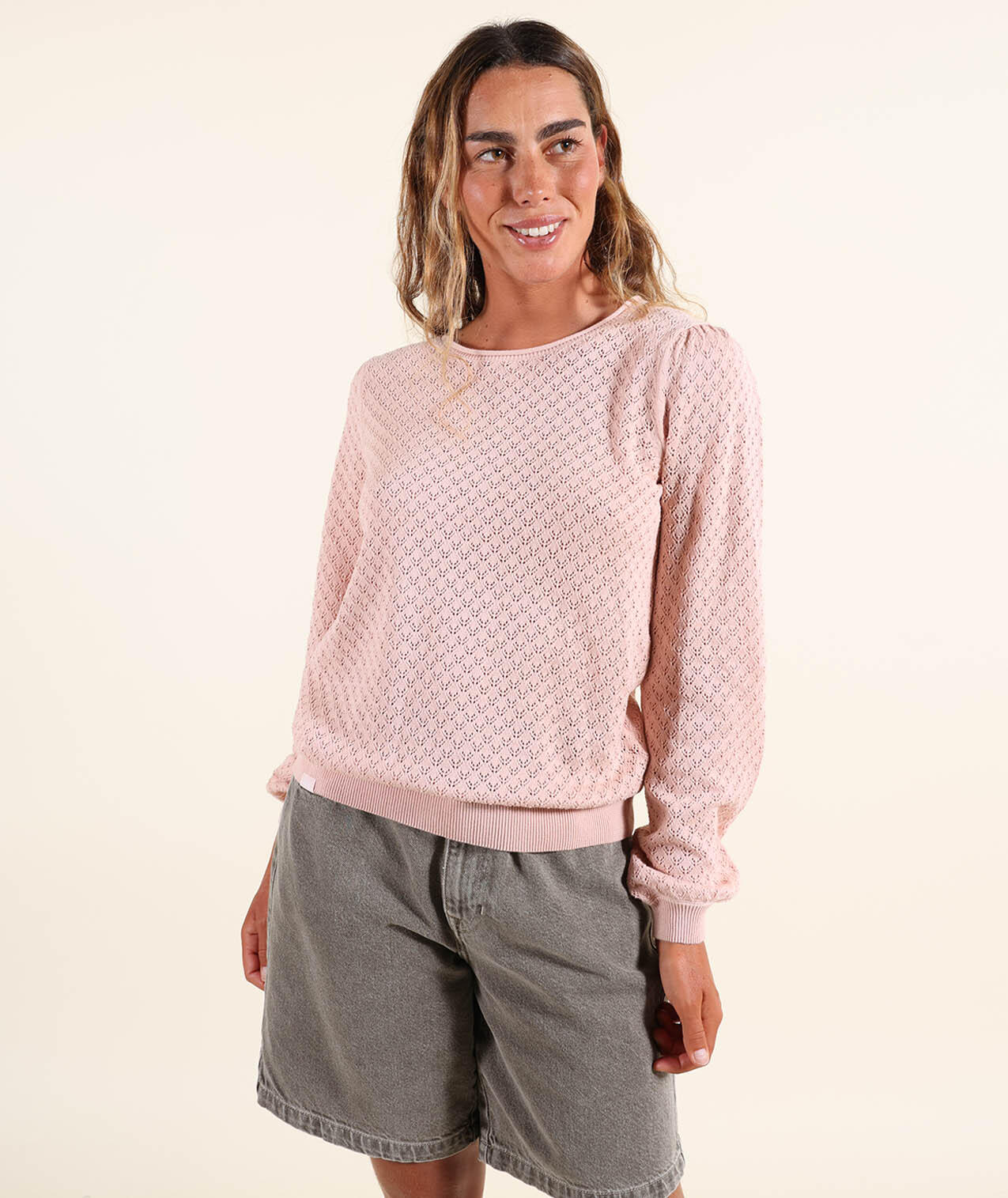 Lightweight gauge 12 sweater with round neck and fancy open stitch, embroidered patch on chest and Oxbow label on shoulder.