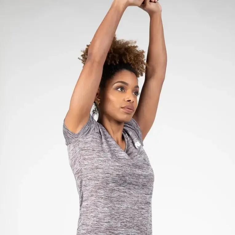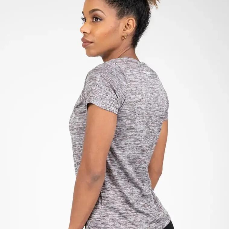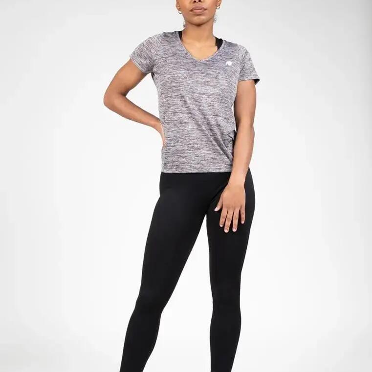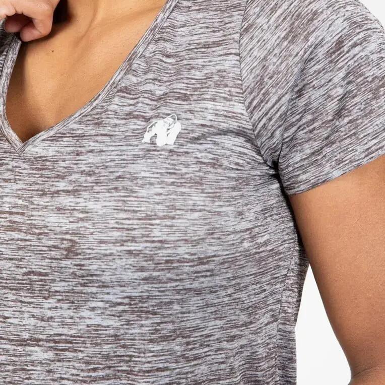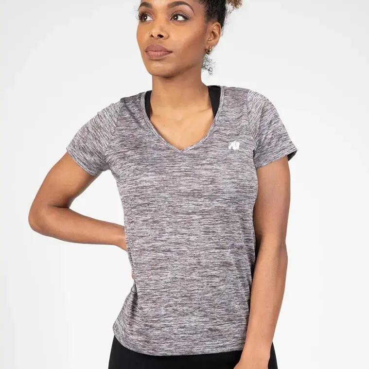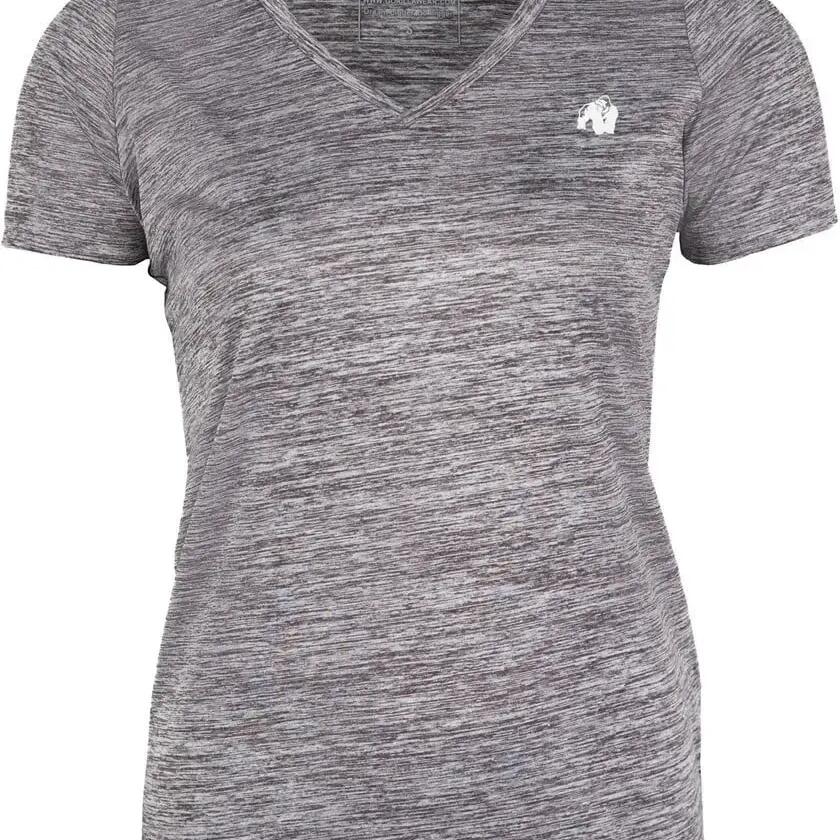 Tame the workout in style with the women's V-neck t-shirt Gorilla Wear Elmira, for a comfortable fit and soft feel in stretch polyester.