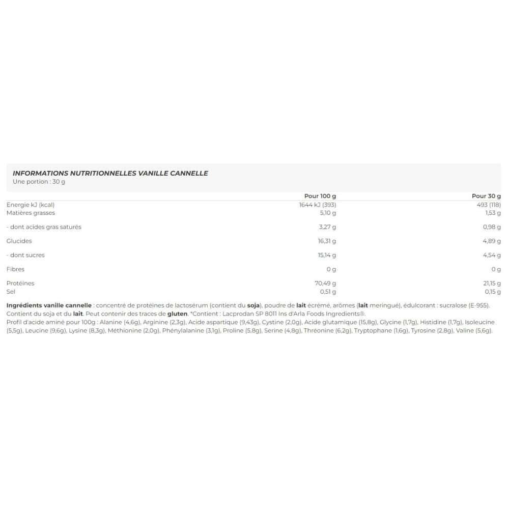 Strawberry ingredients: whey protein concentrate (contains soya), skimmed milk powder, strawberry flavouring, sweetener: sucralose (E-955). Contains soy and milk. May contain traces of gluten. *Contains : Lacprodan SP 8011 Ins from Arla Foods Ingredients®. Amino acid profile per 100g : Alanine (4.6g), Arginine (2.3g), Aspartic acid (9.43g), Cystine (2.0g), Glutamic acid (15.8g), Glycine (1.7g), Histidine (1.7g), Isoleucine (5.5g), Leucine (9,6g), Lysine (8,3g), Methionine (2,0g), Phenylalanine (3,1g), Proline (5,8g), Serine (4,8g), Threonine (6,2g), Tryptophan (1,6g), Tyrosine (2,8g), Valine (5,6g).Chocolate ingredients : whey protein concentrate (contains soya), defatted cocoa powder (theobroma cocoa), flavouring (dark chocolate), sweetener: sucralose (E-955). Contains soy and milk. May contain traces of gluten. *Contains : Lacprodan SP 8011 Ins from Arla Foods Ingredients®.Amino acid profile per 100g : Alanine (4.6g), Arginine (2.3g), Aspartic acid (9.43g), Cystine (2.0g), Glutamic acid (15.8g), Glycine (1.7g), Histidine (1.7g), Isoleucine (5.5g), Leucine (9,6g), Lysine (8,3g), Methionine (2,0g), Phenylalanine (3,1g), Proline (5,8g), Serine (4,8g), Threonine (6,2g), Tryptophan (1,6g), Tyrosine (2,8g), Valine (5,6g).Vanilla-cinnamon ingredients : whey protein concentrate (contains soya), skimmed milk powder, flavouring( meringuemilk ), sweetener: sucralose (E-955). Contains soy and milk. May contain traces of gluten. *Contains : Lacprodan SP 8011 Ins from Arla Foods Ingredients®.Amino acid profile per 100g : Alanine (4.6g), Arginine (2.3g), Aspartic acid (9.43g), Cystine (2.0g), Glutamic acid (15.8g), Glycine (1.7g), Histidine (1.7g), Isoleucine (5.5g), Leucine (9,6g), Lysine (8,3g), Methionine (2,0g), Phenylalanine (3,1g), Proline (5,8g), Serine (4,8g), Threonine (6,2g), Tryptophan (1,6g), Tyrosine (2,8g), Valine (5,6g).Cookie ingredients : whey protein concentrate (contains soy), milk powder, flavoring ((cookie on cookie flavor) (defatted cocoa powder on chocolate flavor) ), sweetener: sucralose (E-955). Contains soy and milk. May contain traces of gluten. *Contains : Lacprodan SP 8011 Ins from Arla Foods Ingredients®.Amino acid profile per 100g : Alanine (4.6g), Arginine (2.3g), Aspartic acid (9.43g), Cystine (2.0g), Glutamic acid (15.8g), Glycine (1.7g), Histidine (1.7g), Isoleucine (5.5g), Leucine (9,6g), Lysine (8,3g), Methionine (2,0g), Phenylalanine (3,1g), Proline (5,8g), Serine (4,8g), Threonine (6,2g), Tryptophan (1,6g), Tyrosine (2,8g), Valine (5,6g).White chocolate ingredients : whey protein concentrate (contains soya), skimmed milk powder (white chocolate mix, contains milk), flavourings (cream), sweetener: sucralose (E-955). Contains soy and milk. May contain traces of gluten. *Contains : Lacprodan SP 8011 Ins from Arla Foods Ingredients®.Amino acid profile per 100g : Alanine (4.6g), Arginine (2.3g), Aspartic acid (9.43g), Cystine (2.0g), Glutamic acid (15.8g), Glycine (1.7g), Histidine (1.7g), Isoleucine (5.5g), Leucine (9,6g), Lysine (8.3g), Methionine (2.0g), Phenylalanine (3.1g), Proline (5.8g), Serine (4.8g), Threonine (6.2g), Tryptophan (1.6g), Tyrosine (2.8g), Valine (5.6g).