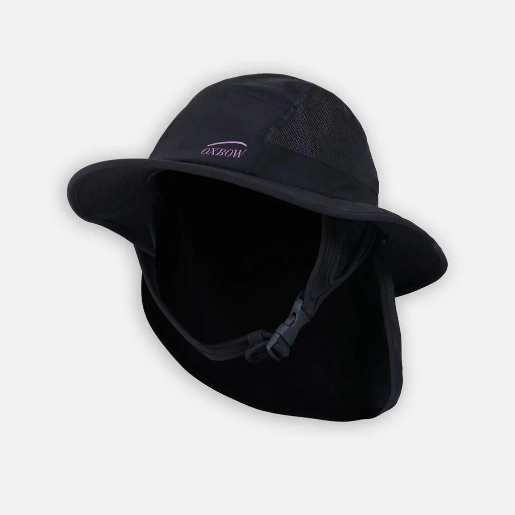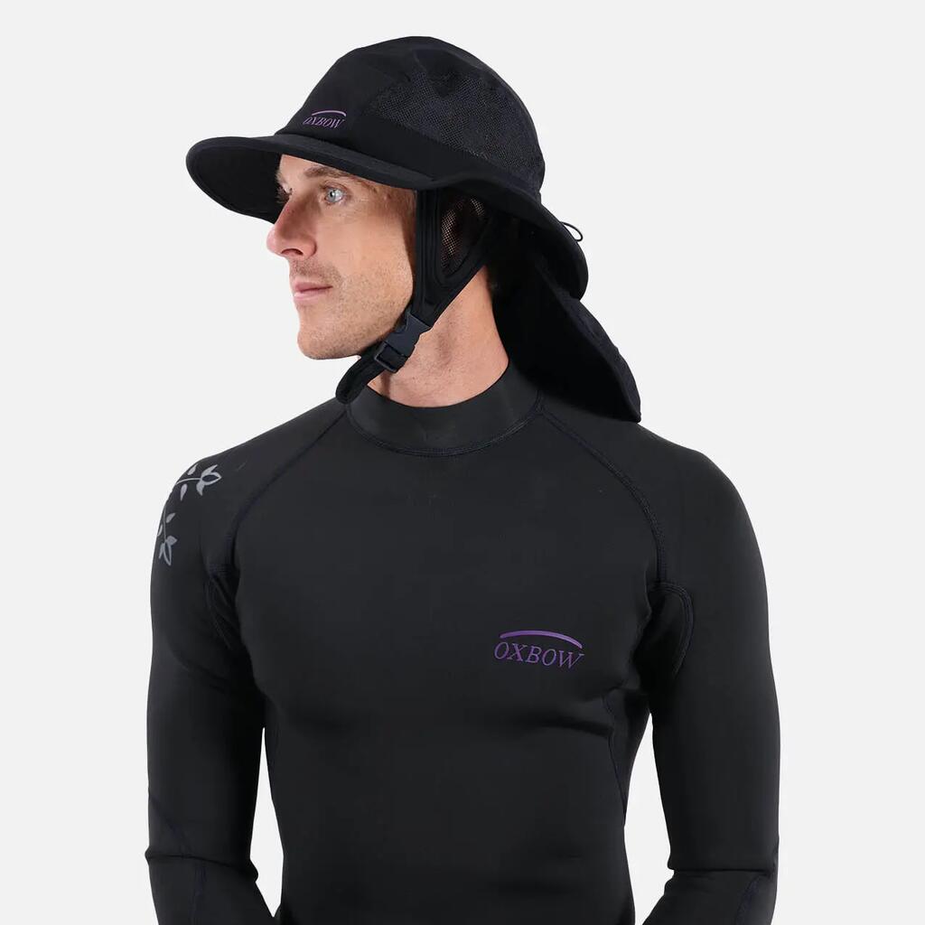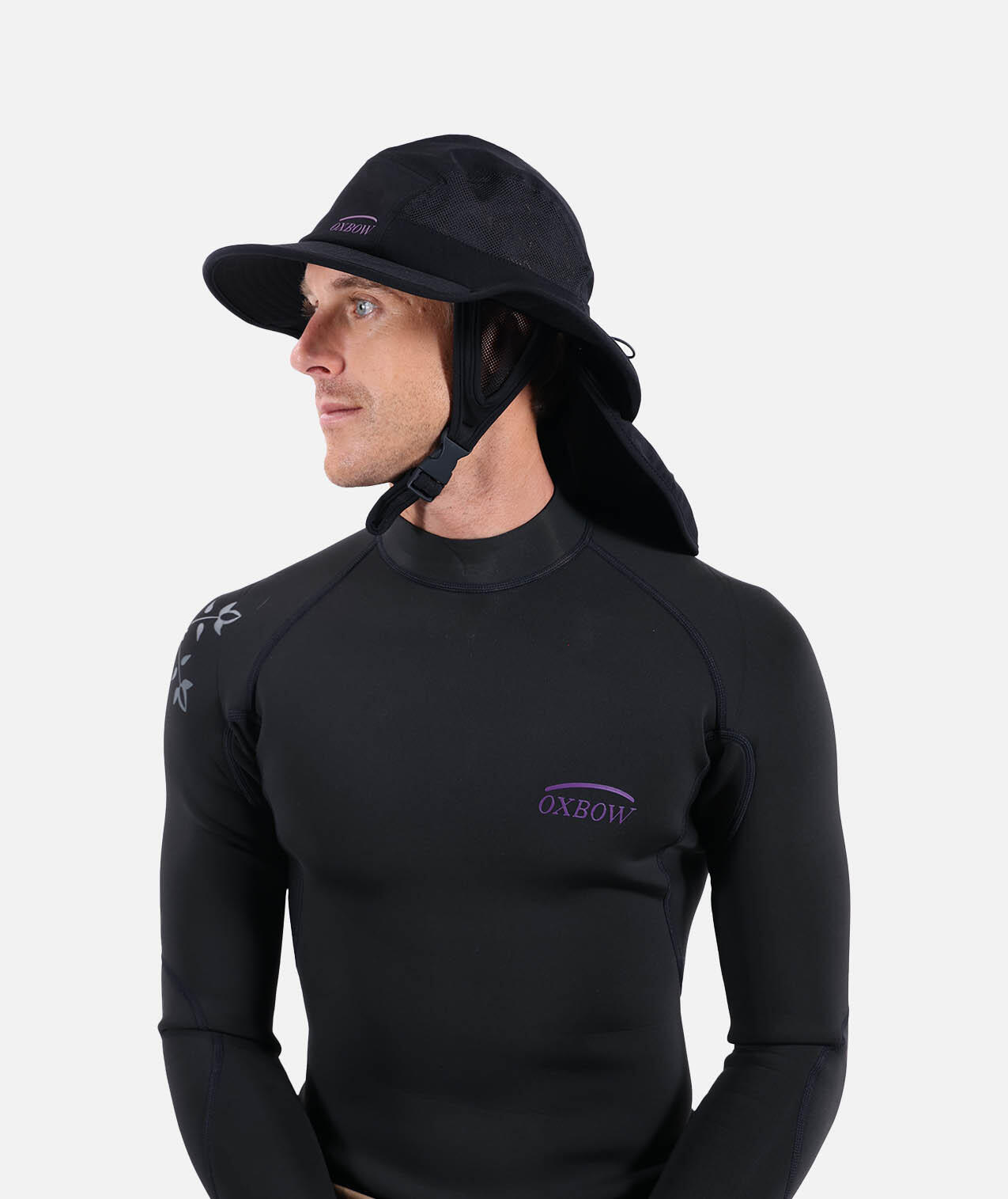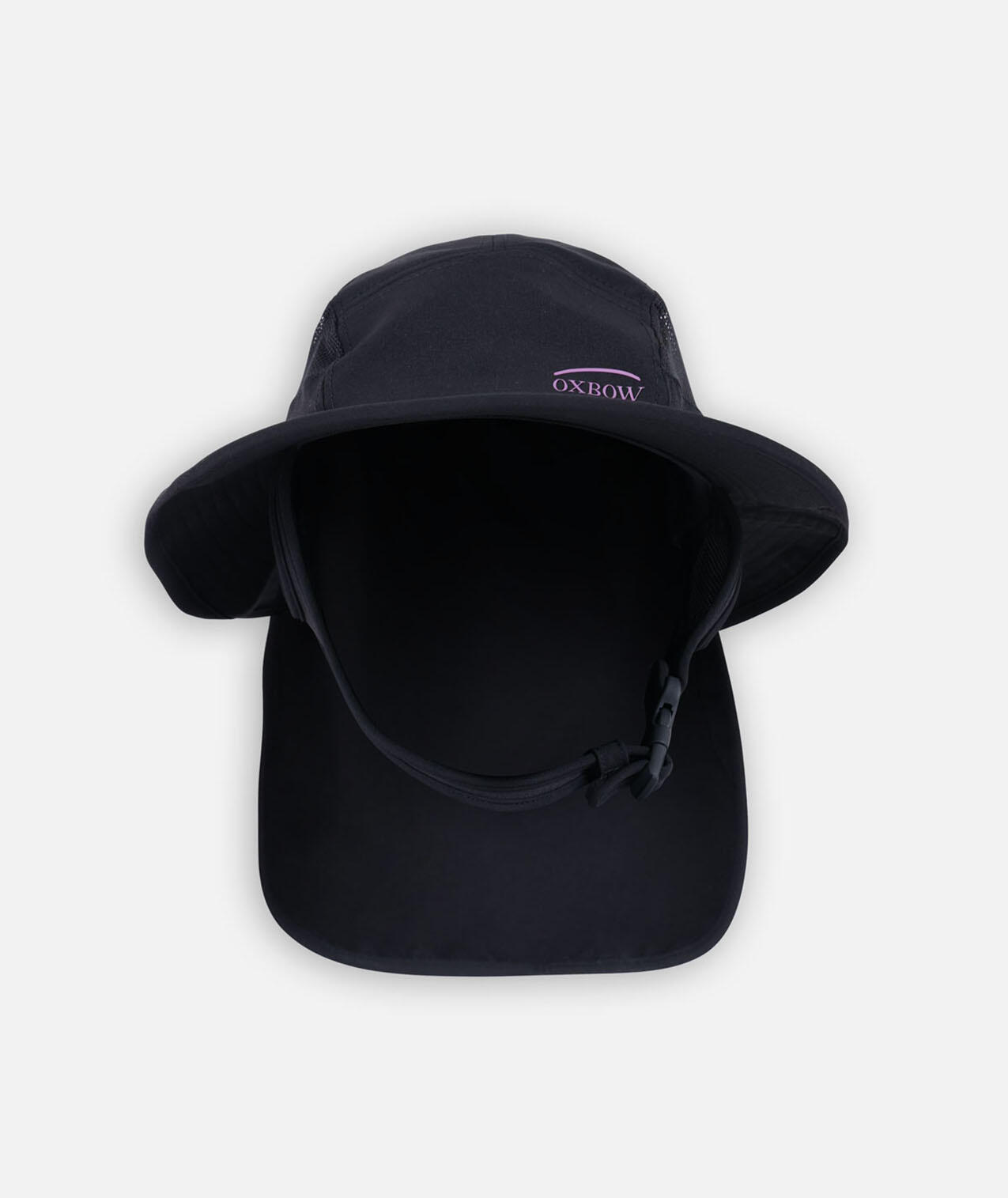 Light surf hat with neoprene chin strap, quick-drying, mesh panels for water drainage, reinforced visor, and UV 50+ protection.