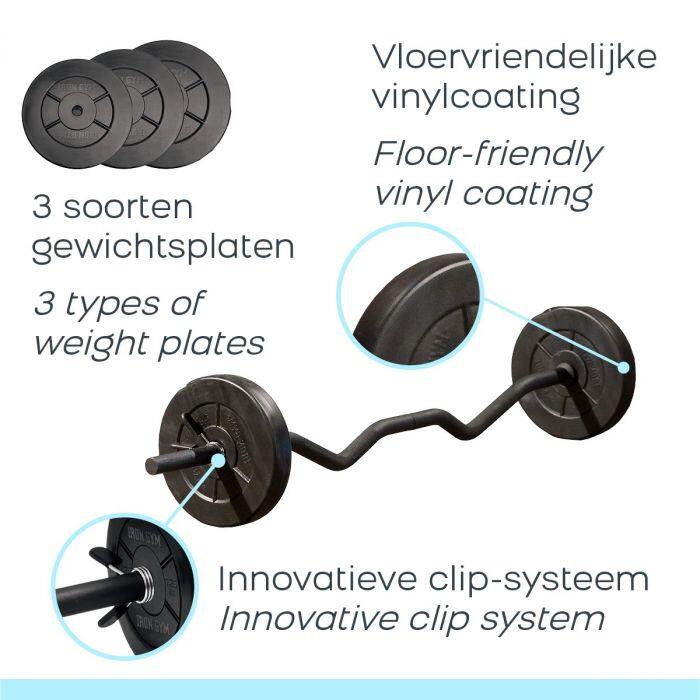 Easily train your entire body with the 23 kg adjustable curl bar set and quickly change your weight with the Spring Locks!