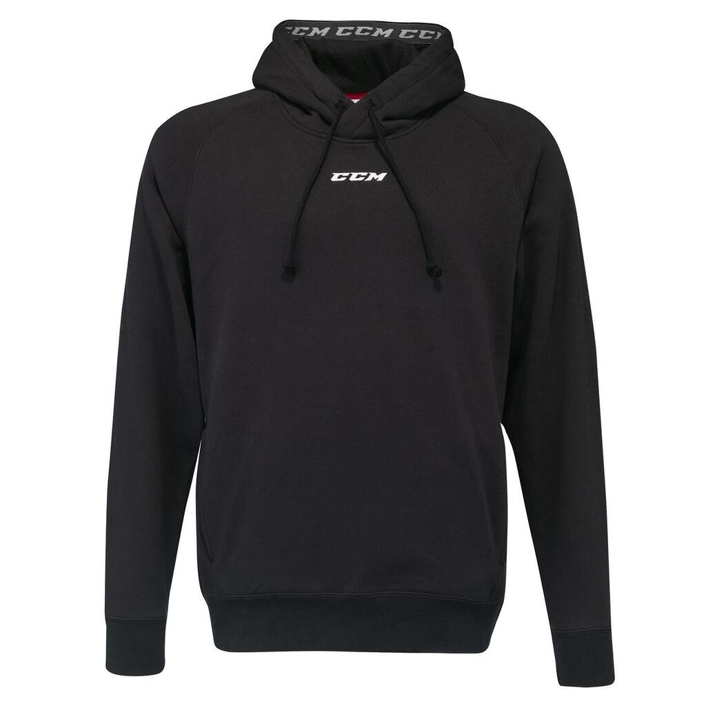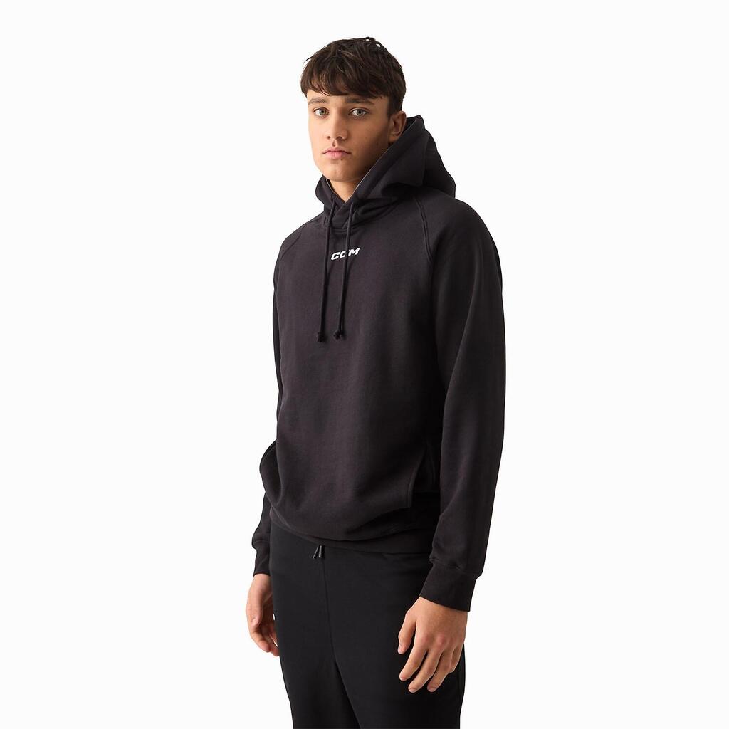 The CCM Team Pullover Hoodie for juniors is a stylish, durable black pullover that is ideal for sporting activities.