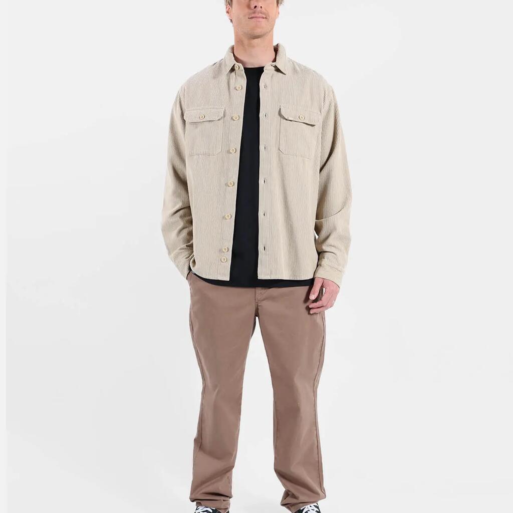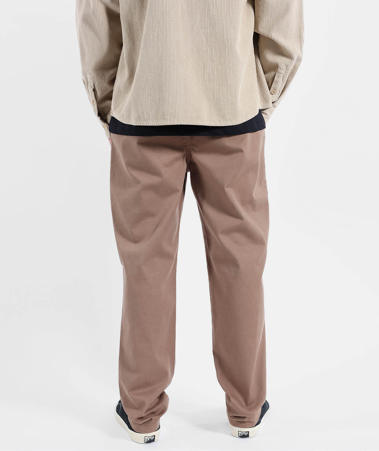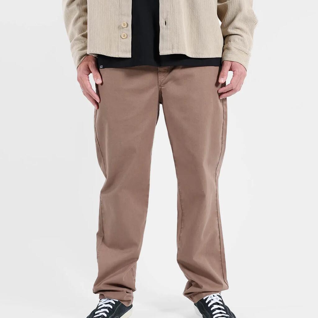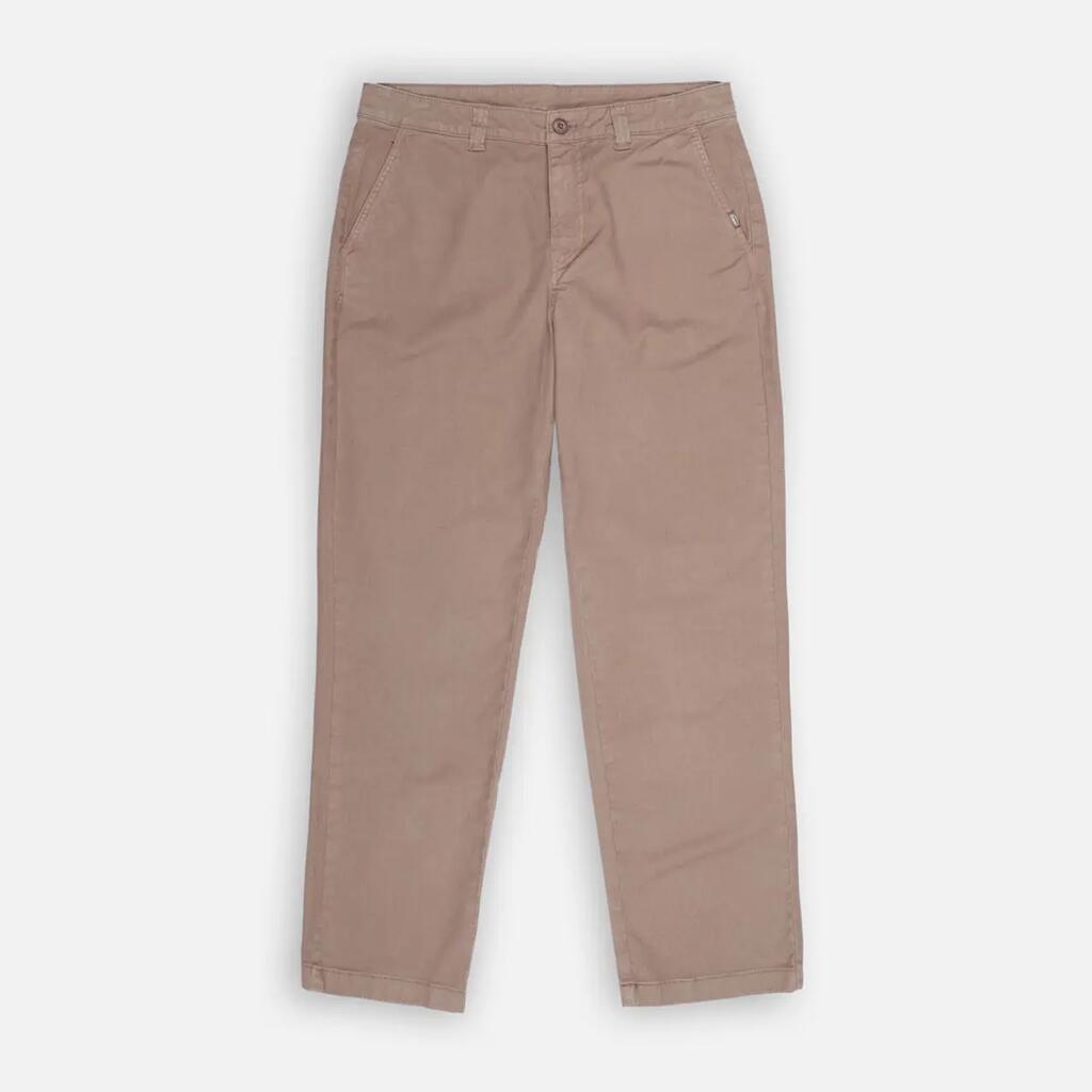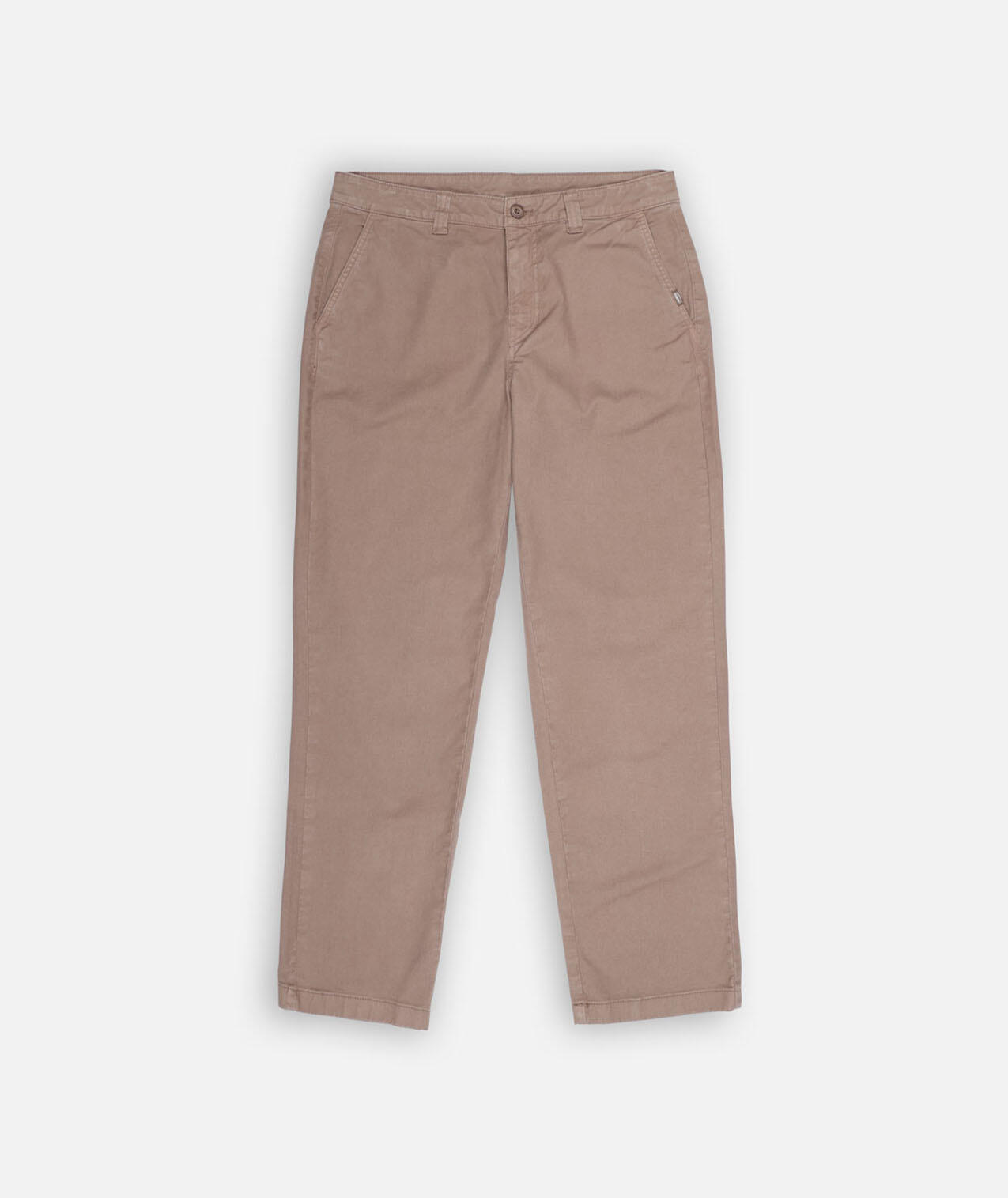 Comfort chino in 310 g/m² stretch cotton twill, dip-dyed, zip fly, flat waistband, welted back pockets, length 76–79.5 cm depending on size.