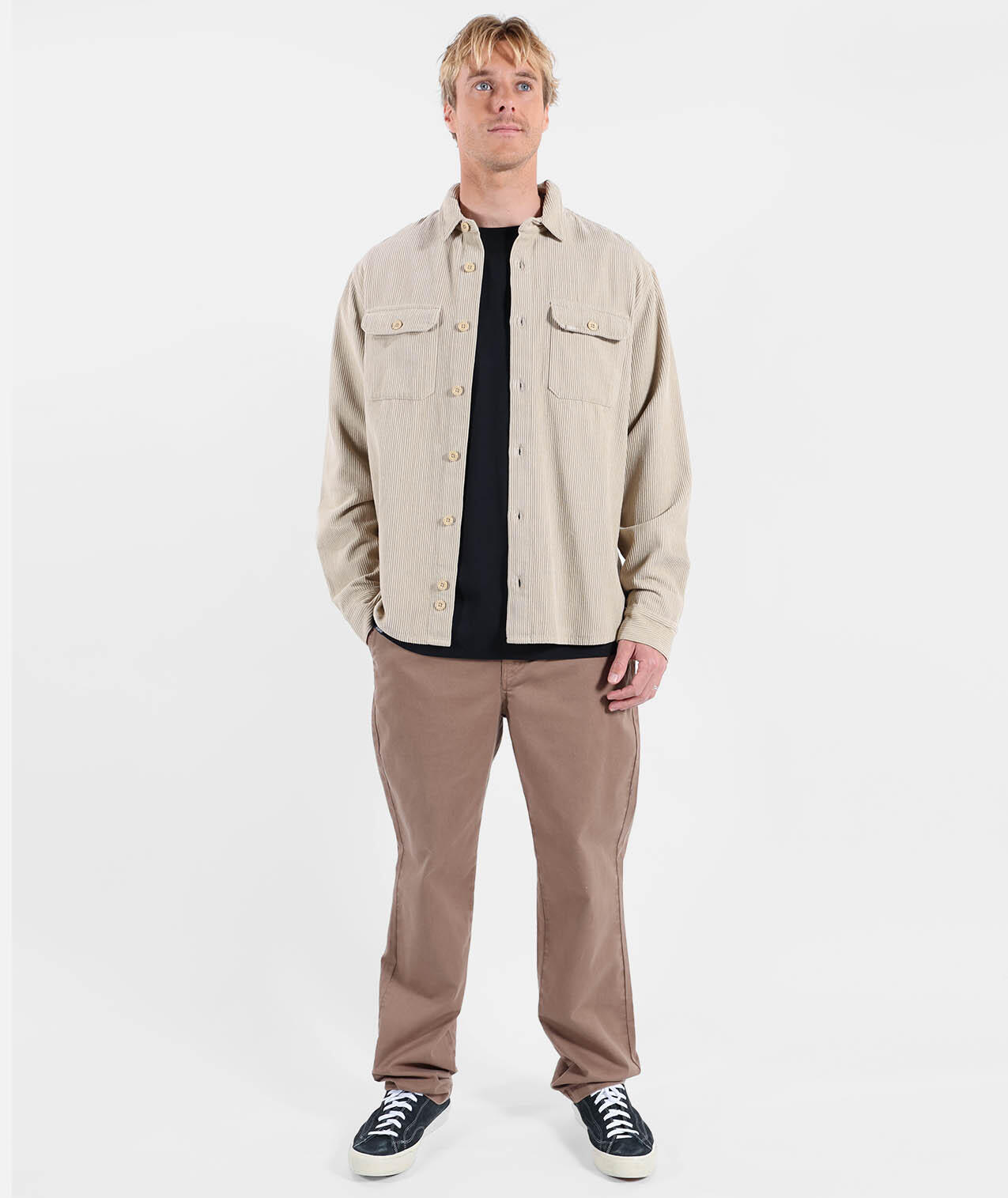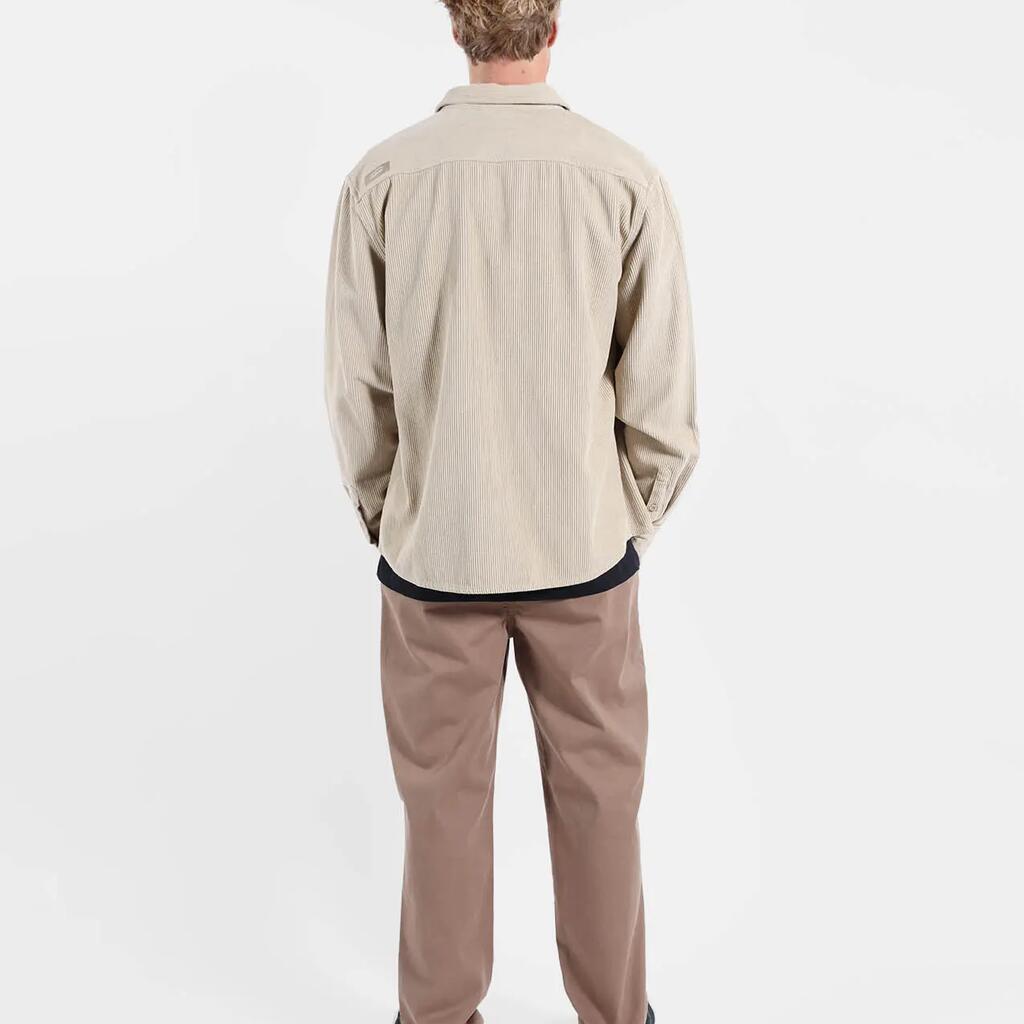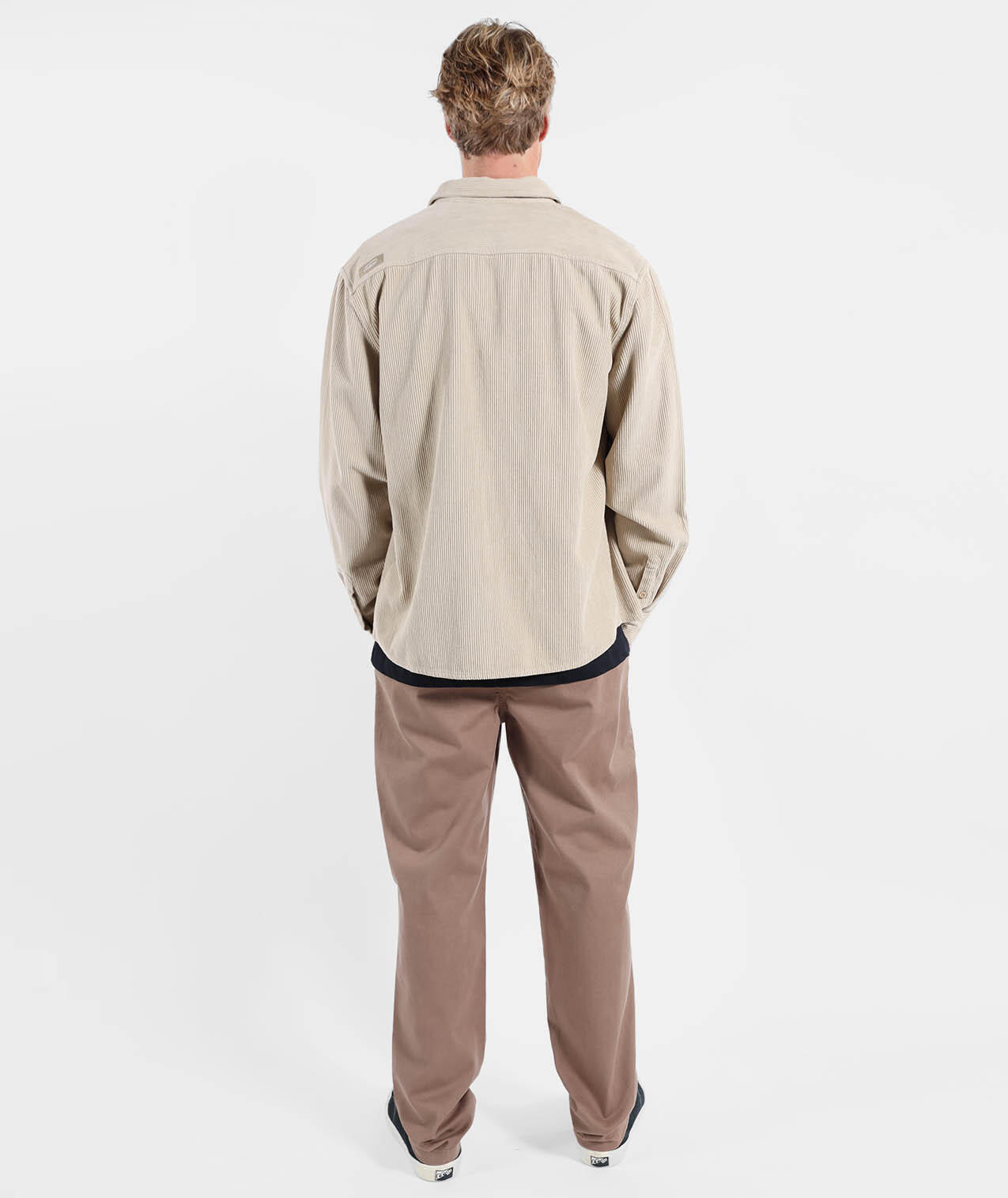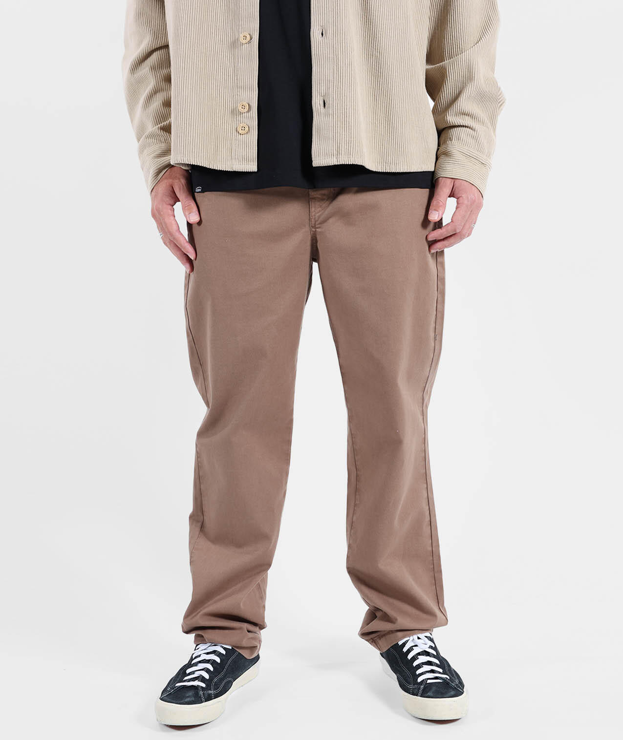 Comfort chino in 310 g/m² stretch cotton twill, dip-dyed, zip fly, flat waistband, welted back pockets, length 76–79.5 cm depending on size.