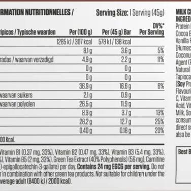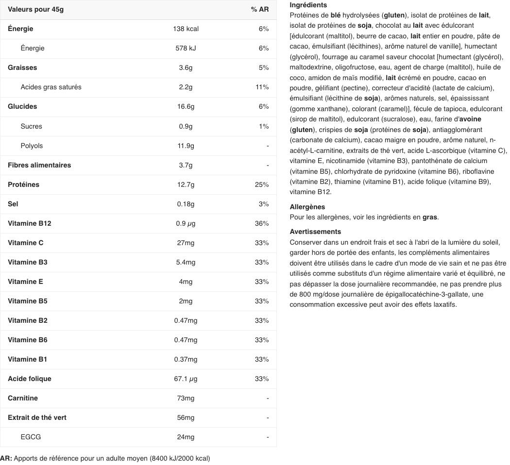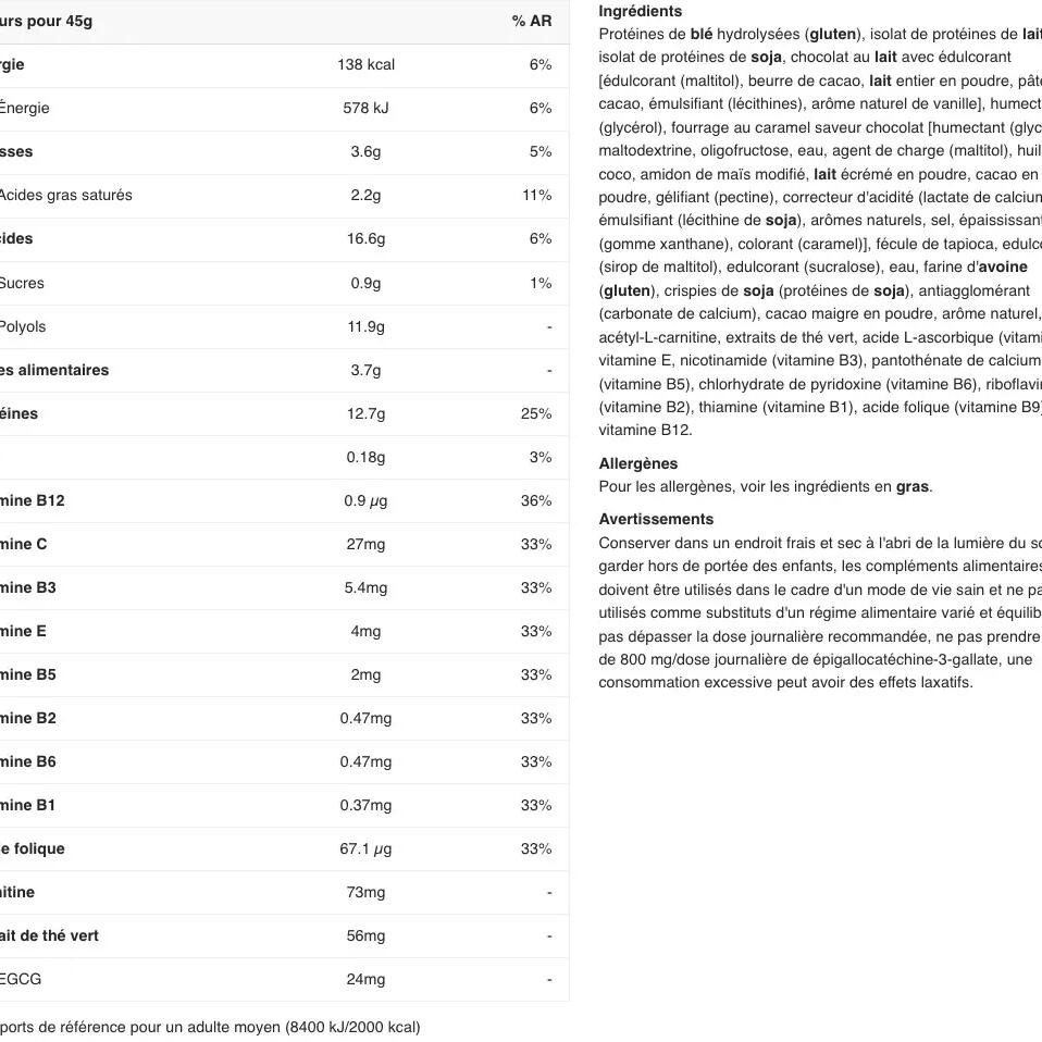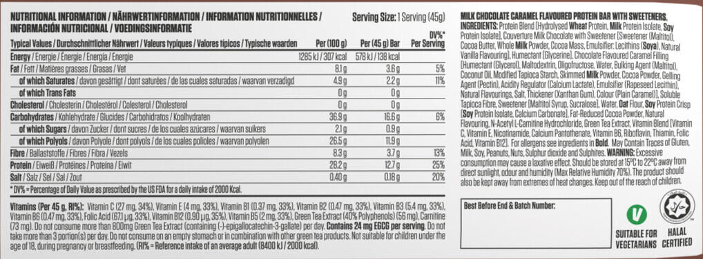 protein blend( HYDROLYSED WHEAT PROTEIN, MILK PROTEIN ISOLATE, SOYA PROTEIN ISOLATE), couverture milk chocolate with sweetener( sweetener( maltitol), cocoa butter, WHOLE MILK POWDER, cocoa mass, emulsifier( SOYA LECITHIN), natural vanilla flavouring), humectant( glycerin), chocolate flavoured caramel filling( humectant( glycerol), maltodextrin, oligofructose, water, bulking agent( maltitol), coconut oil, modified tapioca starch, SKIMMED MILK POWDER, cocoa powder, gelling agent( pectin), acidity regulator( calcium lactate), emulsifier( rapeseed lecithin), natural flavouring, salt, thickener( xanthan gum), colour( plain caramel)), soluble tapioca fibre, sweeteners( maltitol syrup, sucralose), water, OAT FLOUR, soya protein crisps( SOYA PROTEIN ISOLATE, calcium carbonate), fat-reduced cocoa powder, natural flavouring, N-acetyl L-carnitine hydrochloride, green tea extract, vitamin blend( Vitamin C, Vitamin E, nicotinamide, calcium D-pantothenate, Vitamin B6, riboflavin, thiamin, folic acid, Vitamin B12)
