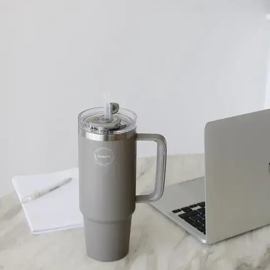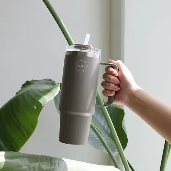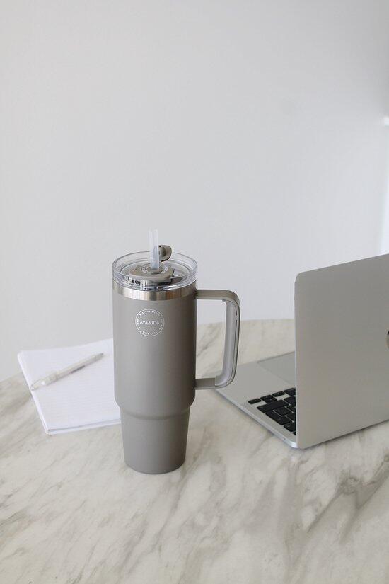 Generous 885 ml thermocup with straw – perfect for enjoying cold and hot drinks anywhere.