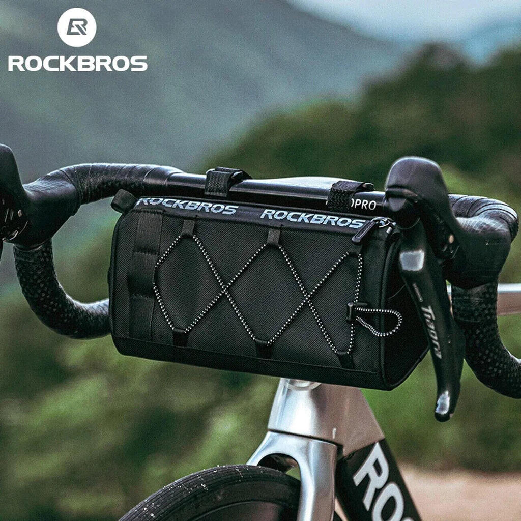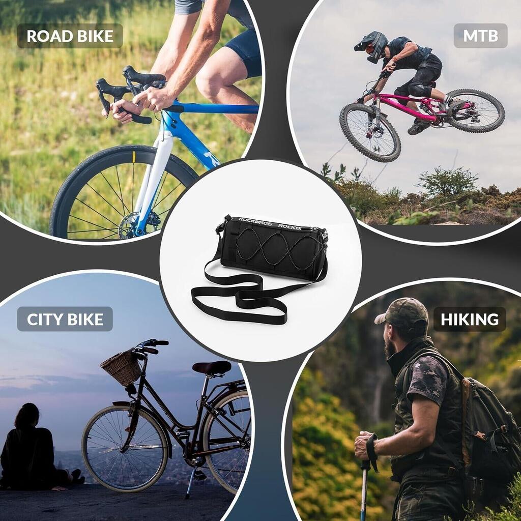 Rockbros 1.5 L handlebar bag in black polyester, waterproof and reflective, convertible to a shoulder bag for organised and secure storage.
