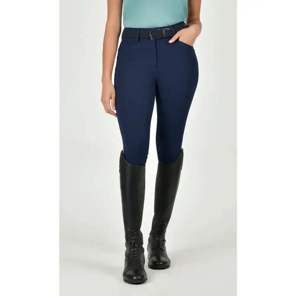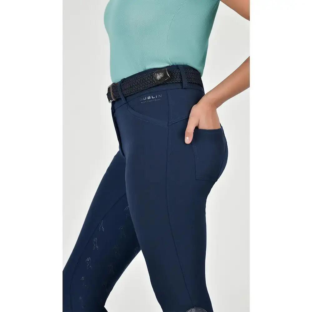 The Dublin Cammy Comfort Twill Breeches are classic style fitted trousers that feature a four-way stretch twill fabric, perfect for all-day comfort in the saddle or while working around the yard/stables, with a very stretchy knit panel at the bottom of the leg to ensure a smooth and comfortable fit under your chaps/gaiters or inside your boots. The full seat is designed in the silhouette of a horse, providing extra stability in the saddle during rides, at-home training, or in the competition ring. A wide mid-rise elasticated waistband, with a front zipper and double hook and bar, as well as belt loops, combine for a flattering finish. With front and back pockets for style and to carry your mobile phone and essentials. Available in Beige and Navy, with adult, children's, and curvy sizes available in some colours.