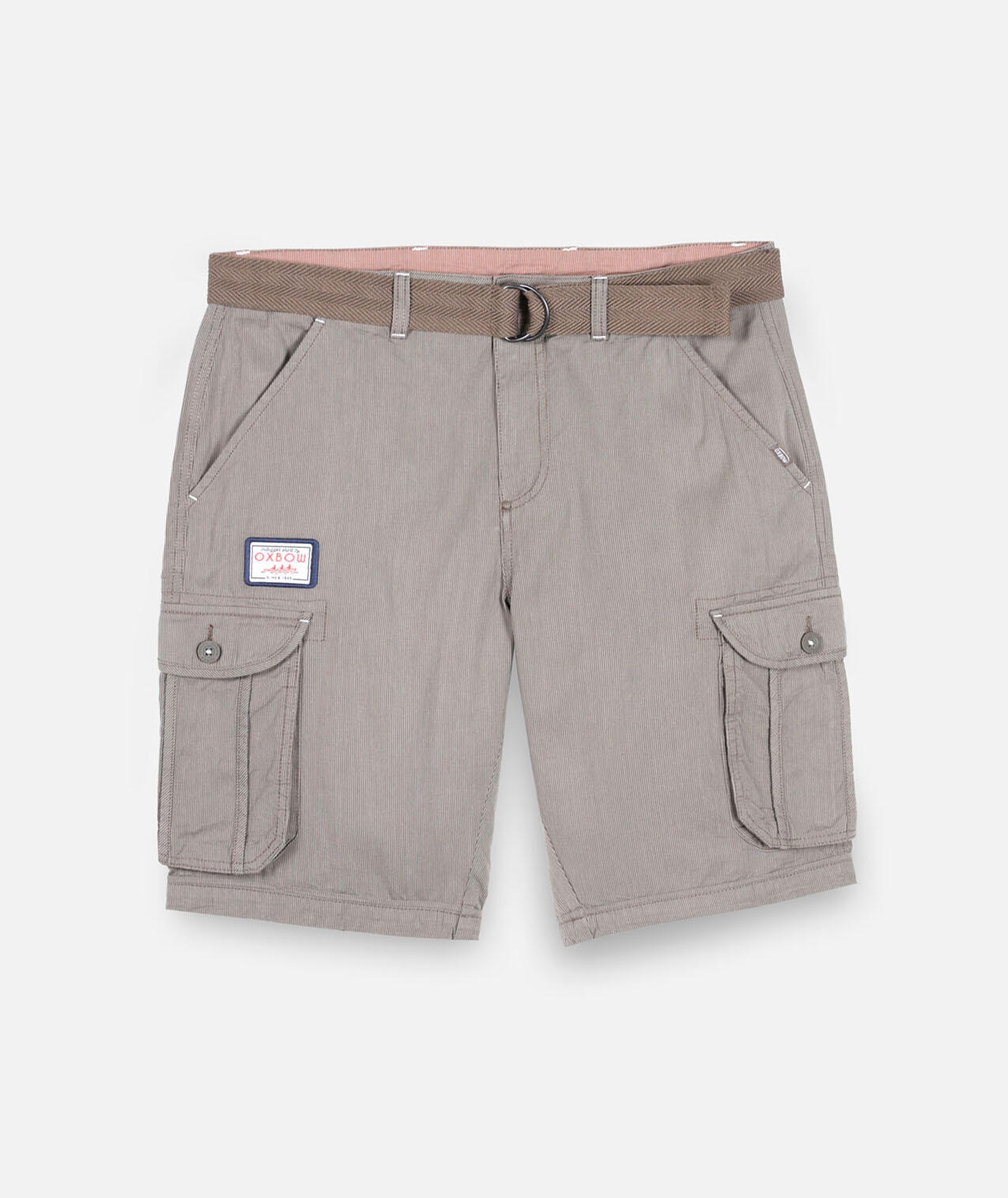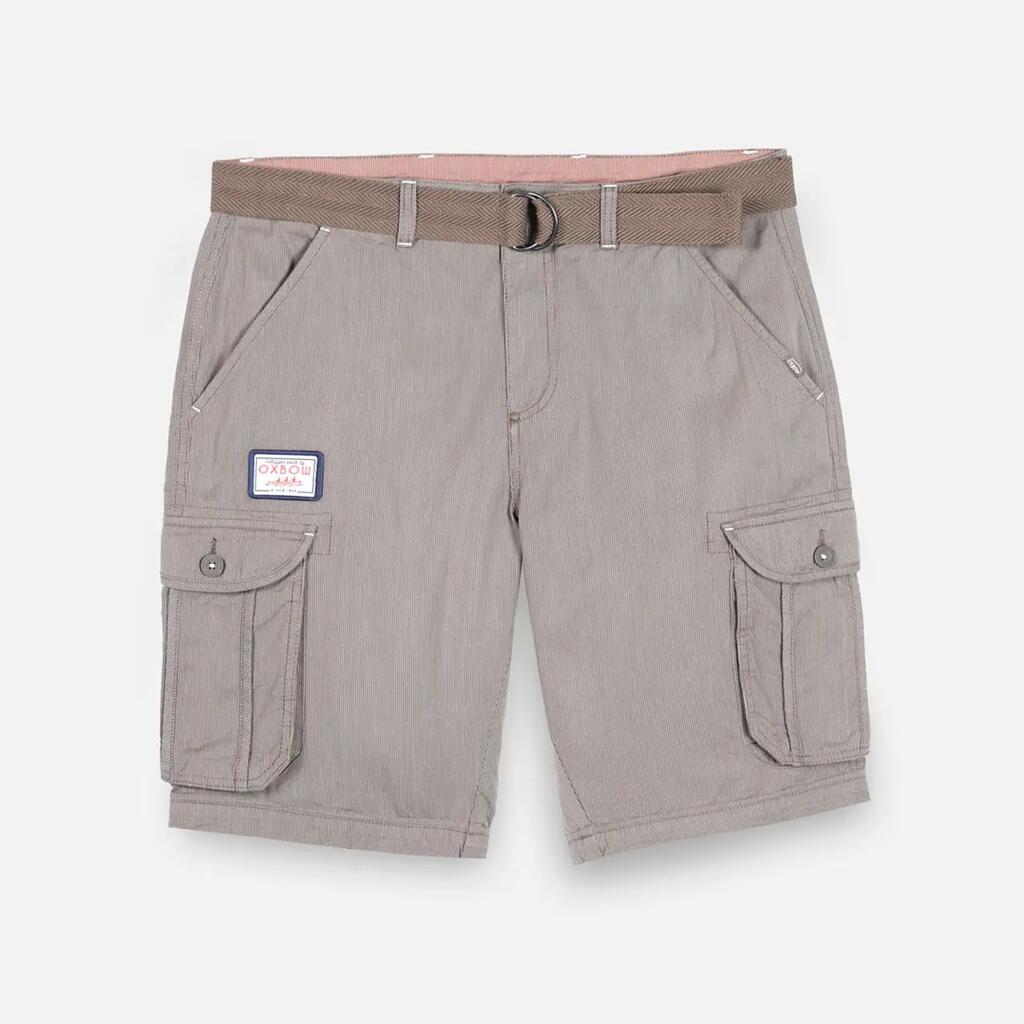 Striped bermuda shorts, braided belt with metal buckle, two back pockets and two buttoned cargo pockets, zip fly, drative label, woven stripe, length 21''/54cm