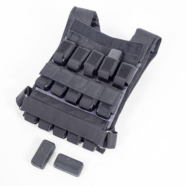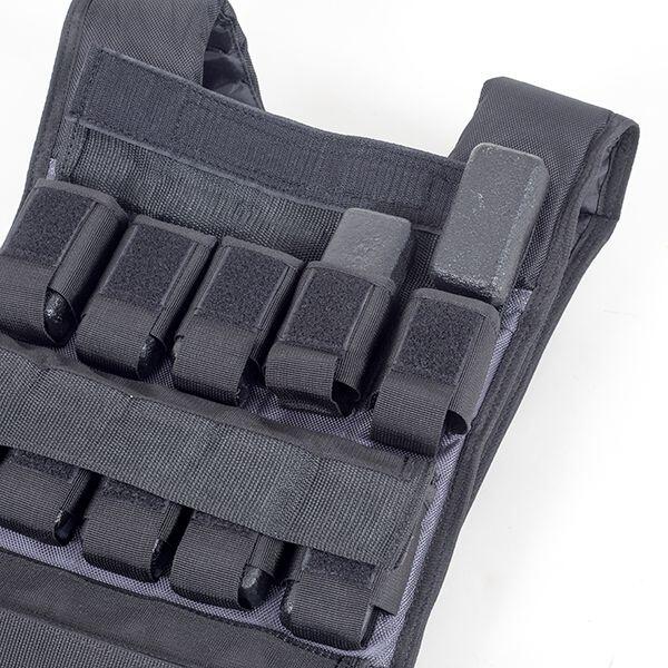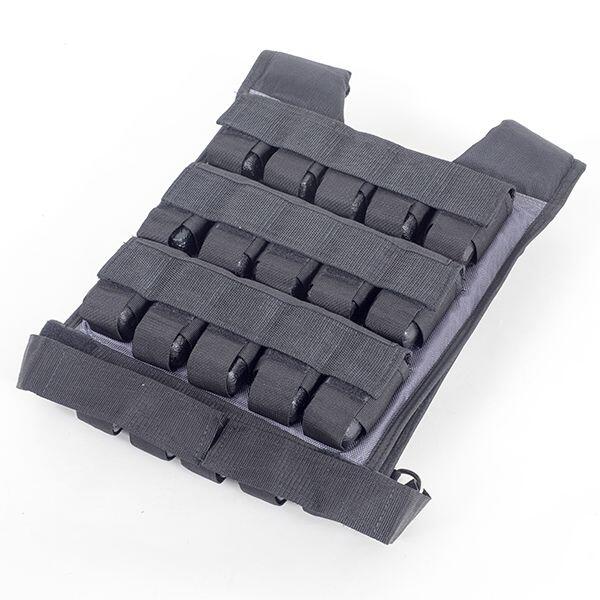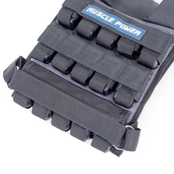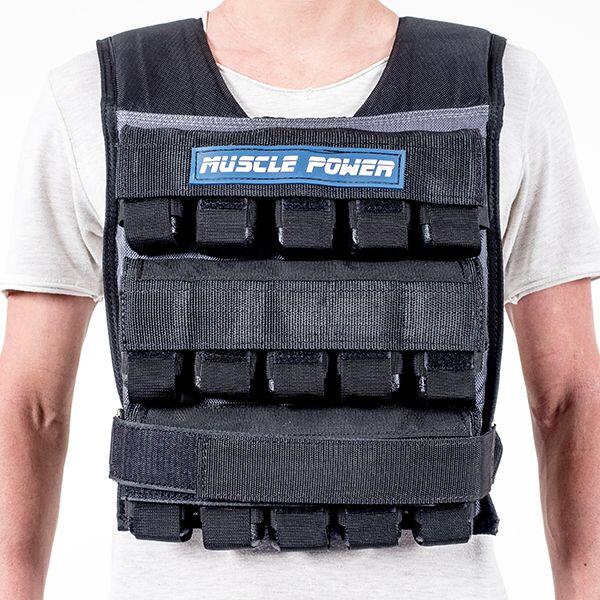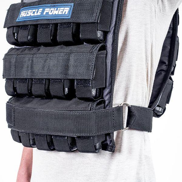 This 30 kg weight vest from Muscle Power has 30 individual weights that you can remove or add to create your ideal load. The pockets for these weights are evenly distributed over the front and back of the vest, so you can easily maintain balance. You hang the weight vest over your shoulders and then fasten it with a strap that goes over your chest and back. This strap ensures that the vest does not move during exercises. The vest is quite short and will not get in the way of the abdominal muscles for most people.