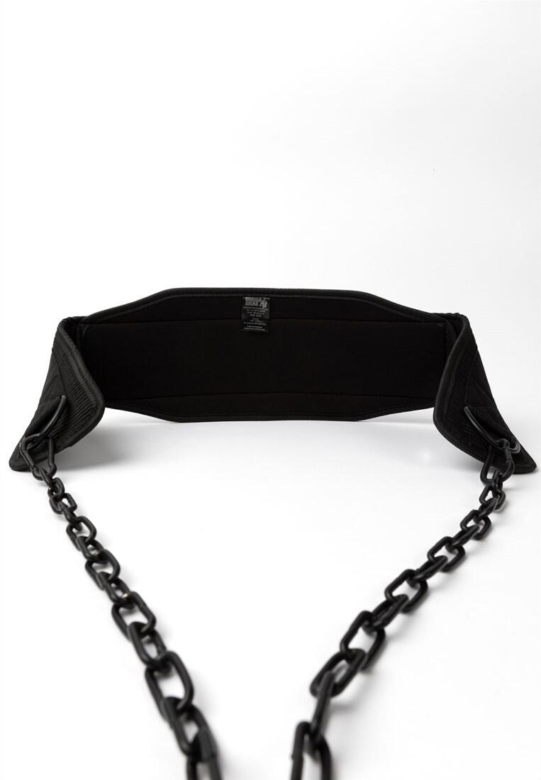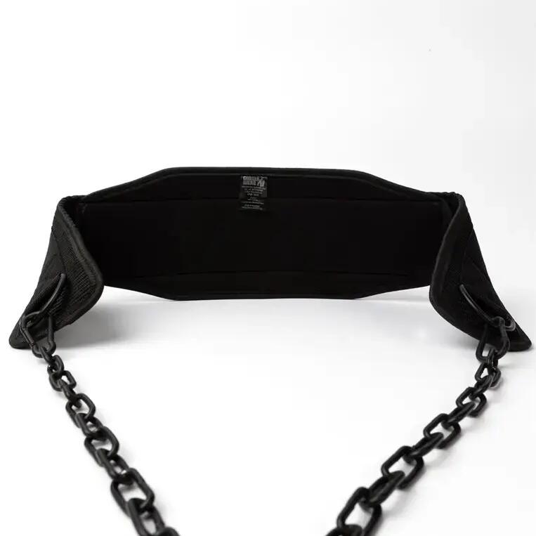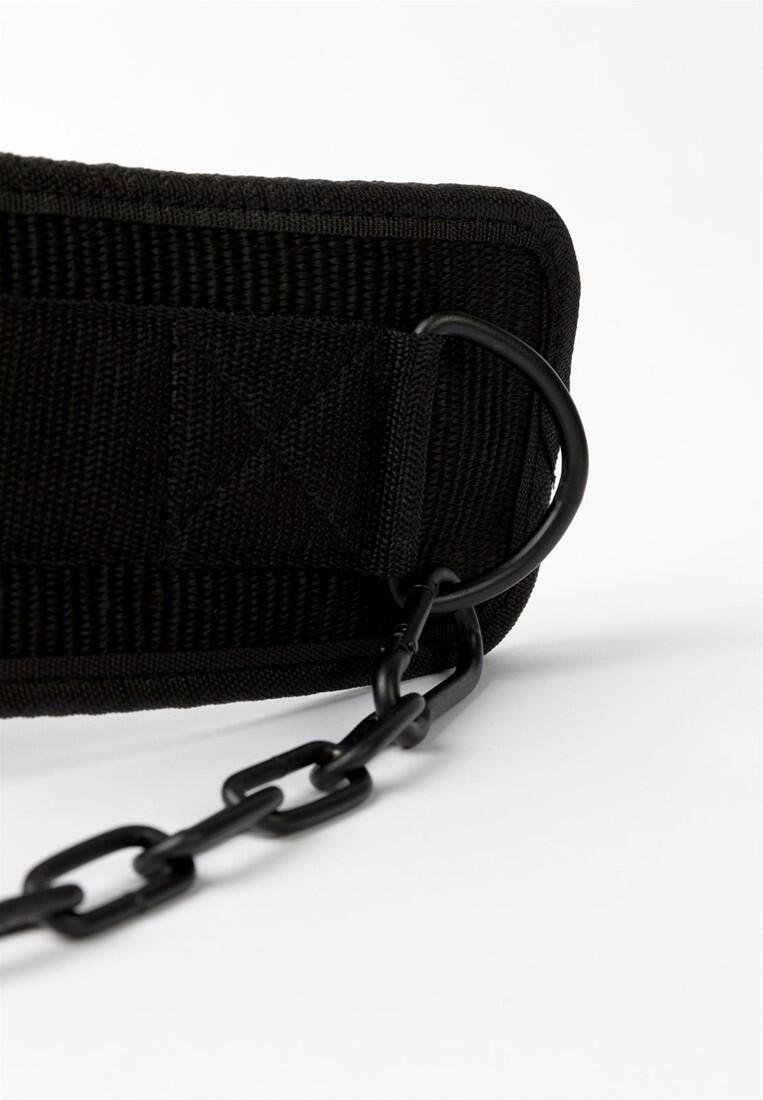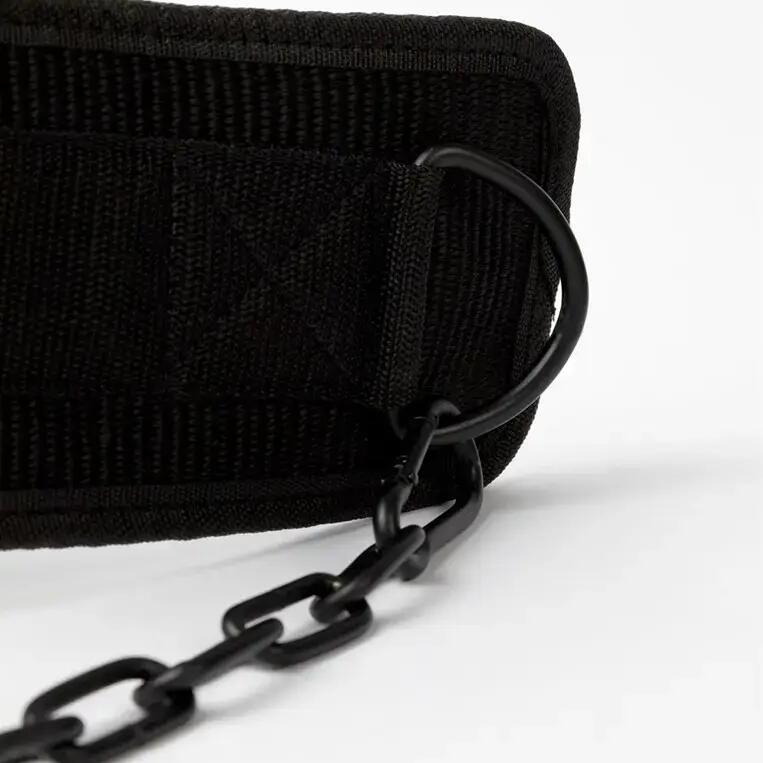Durable black nylon dip belt with 105 cm steel chain, supports up to 100 kg for enhanced bodyweight training like dips, pull-ups, and squats.