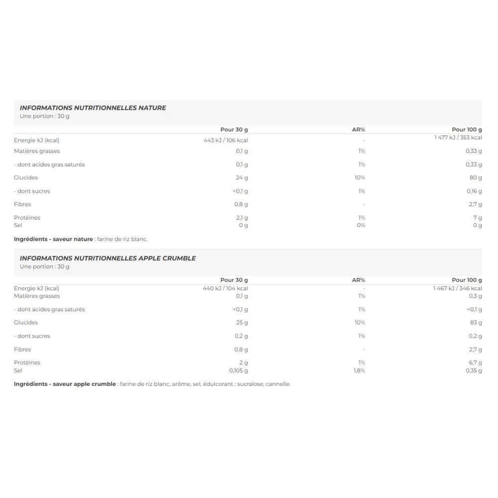 Ingredients - golden syrup flavor: white rice flour, flavor, salt, color (plain caramel), sweetener: sucralose.Ingredients - raspberry ripple flavor : white rice flour, flavor, salt, sweetener: sucralose.Ingredients - toffee cookie flavor: white rice flour, flavor, skim milk powder, salt, color (plain caramel), sweetener: sucralose.Ingredients - plain flavor: white rice flour.Ingredients - apple crumble flavor: white rice flour, flavor, salt, sweetener: sucralose, cinnamon.