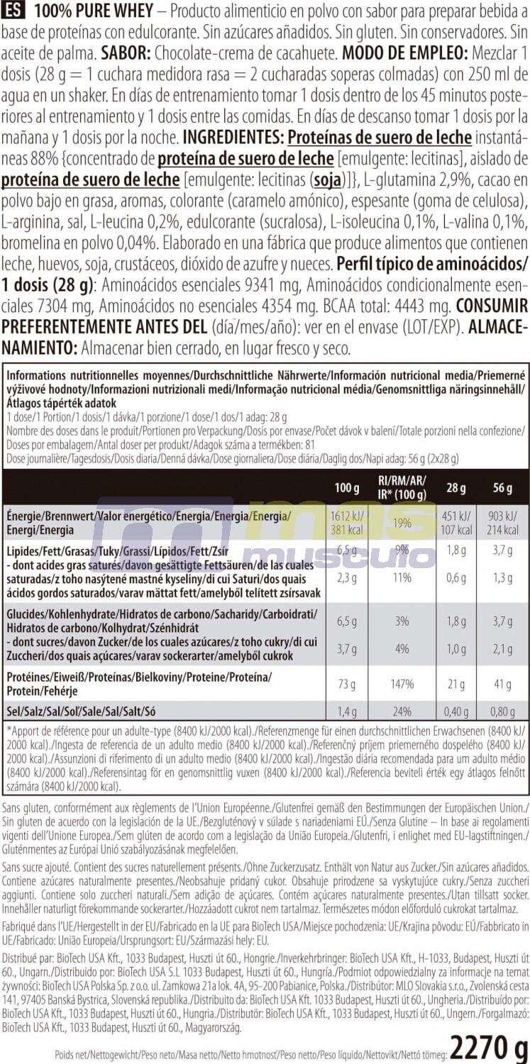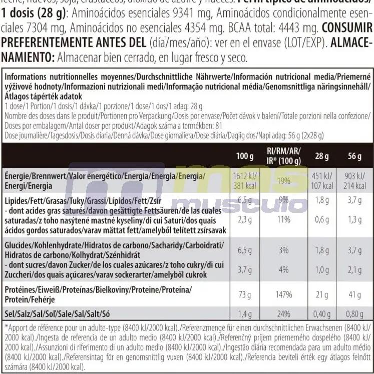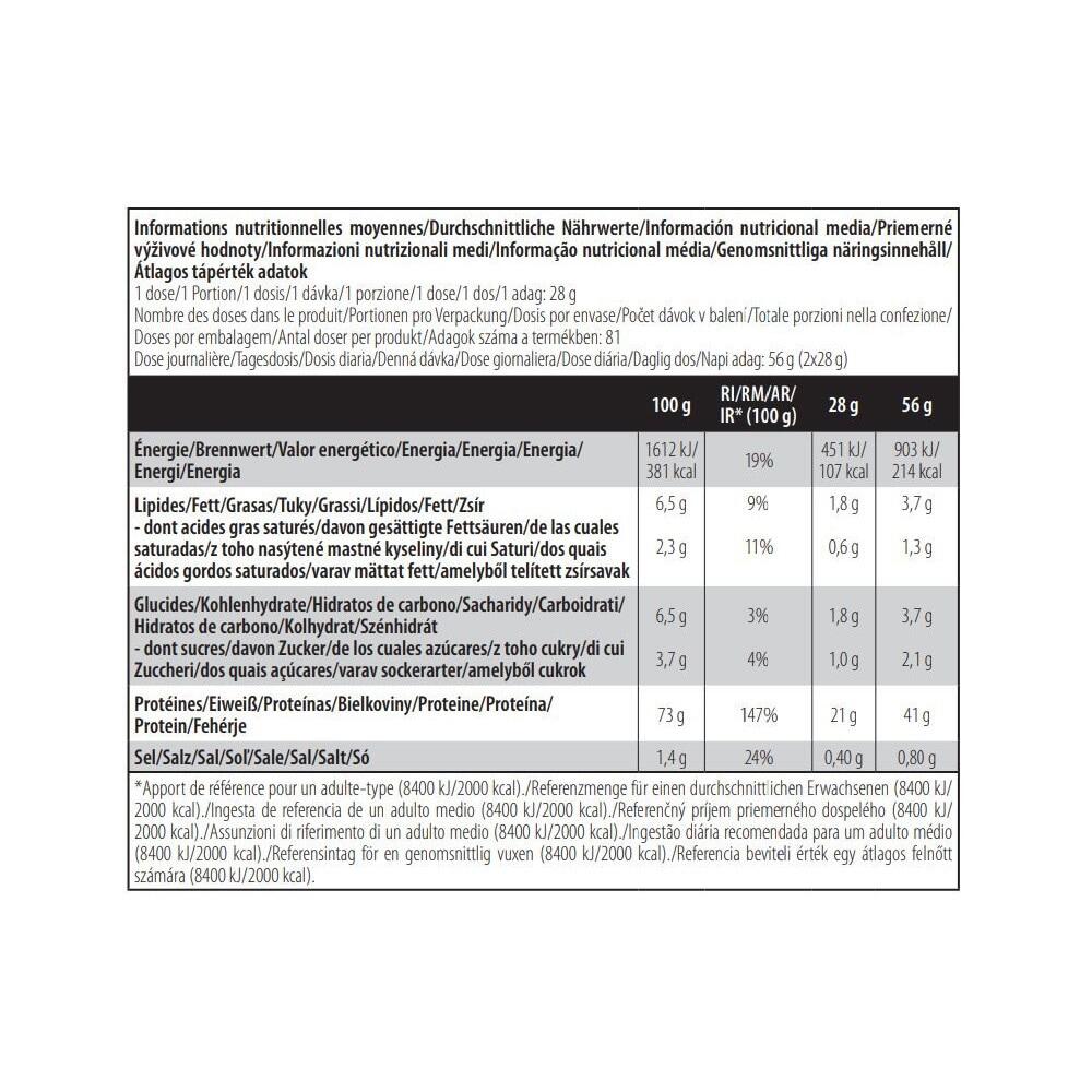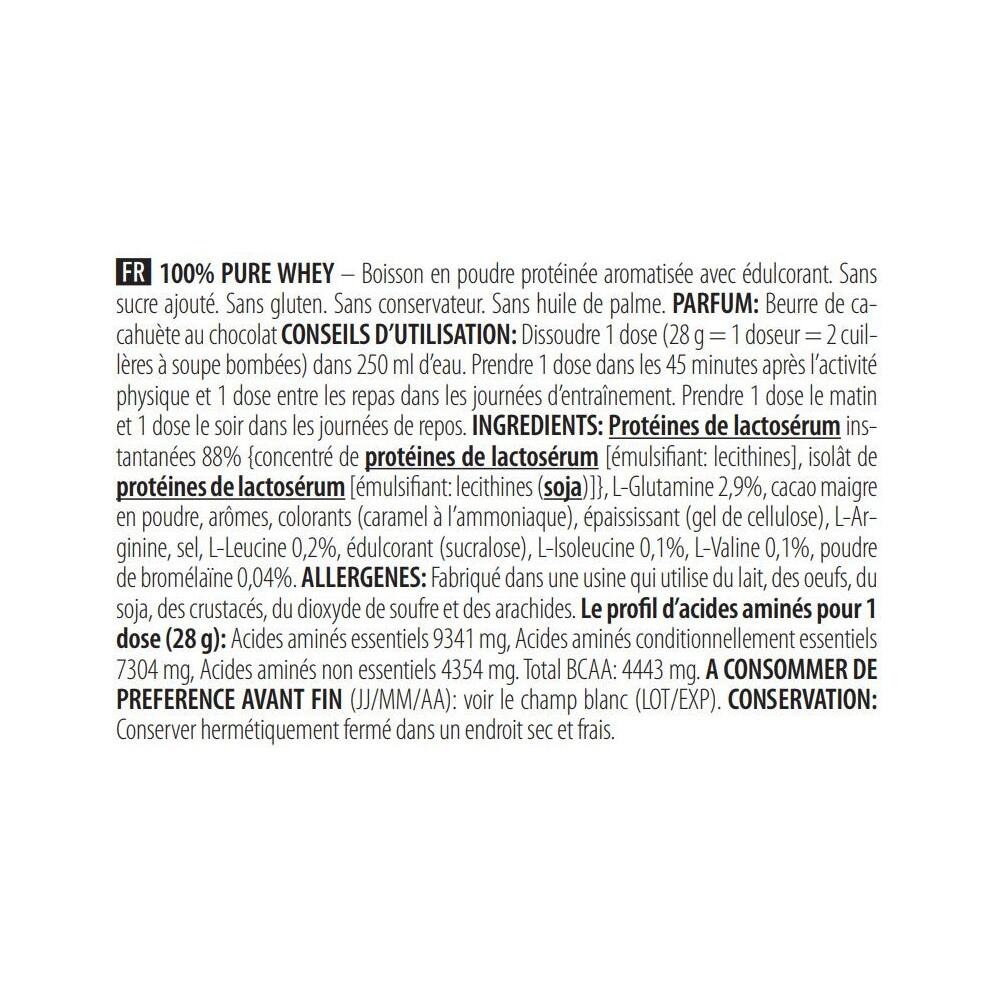 Chocolate ingredients: Instant whey protein 84% {whey protein concentrate [émulsifiant : lécithines], whey protein isolate [emulsifier : lecithin(soya)]}, low-fat cocoa powder, L-Glutamine 4.6%, flavourings, thickener (cellulose gel), L-Arginine, salt, L-Leucine 0.2%, sweetener (sucralose), L-Isoleucine 0.1%, L-Valine 0.1%, bromelain powder 0.04%.Ingredients Vanille Bourbon: Instant whey protein 92% {whey protein concentrate [émulsifiant : lécithines], whey protein isolate [emulsifier : lecithin(soya)]}, L-glutamine 3%, flavourings, thickener (cellulose gel), L-Arginine, L-Leucine 0.2%, salt, sweetener (sucralose), L-Isoleucine 0.1%, L-Valine 0.1%, bromelain powder 0.04%, color (tartrazine*).Ingredients Strawberry: Instant whey protein 89% {whey protein concentrate [émulsifiant : lécithines], whey protein isolate [emulsifier : lecithin(soya)]}, flavourings, L-glutamine 2.9%, thickener (cellulose gel), L-Arginine, acidifier (citric acid), salt, L-Leucine 0.2%, sweetener (sucralose), L-Isoleucine 0.1%, L-Valine 0.1%, bromelain powder 0.04%, color (Rouge allura AC*).Ingredients Banana: Instant whey protein 91% {whey protein concentrate [émulsifiant : lécithines], whey protein isolate [emulsifier : lecithin(soya)]}, L-Glutamine 3%, flavourings, thickener (cellulose gel), L-Arginine, acidifier (citric acid), L-Leucine 0.2%, salt, sweetener (sucralose), L-Isoleucine 0.1%, L-Valine 0.1%, bromelain powder 0.04%, color (tartrazine*).Ingredients Hazelnut: Instant whey protein 86% {whey protein concentrate [émulsifiant : lécithines], whey protein isolate [emulsifier : lecithins(soya)]}, low-fat cocoa powder, L-Glutamine 4.7%, L-Arginine, flavourings, thickener (cellulose gel), salt, L-Leucine 0.2%, sweetener (sucralose), L-Isoleucine 0.1%, L-Valine 0.1%, bromelain powder 0.04%.Cookie & creamingredients : Instant whey protein 90% {whey protein concentrate [émulsifiant : lécithines], whey protein isolate [emulsifier: lecithins(soya)]}, L-Glutamine 2.9%, flavourings, chocolate powder [cocoa mass, cocoa butter, low-fat cocoa powder, emulsifier: lecithin(soya), flavouring], L-Arginine, thickener (cellulose gel), cinnamon, salt, L-Leucine 0.2%, L-Isoleucine 0.1%, L-Valine 0.1%, sweetener (sucralose), bromelain powder 0.04%.Ingredients Coconut Chocolate: 86% instant whey protein {whey protein concentrate [émulsifiant : lécithines], whey protein isolate [emulsifier : lecithin(soya)]}, low-fat cocoa powder, L-Glutamine 4.7%, flavourings, L-Arginine, thickener (cellulose gel), salt, L-Leucine 0.2%, sweetener (sucralose), L-Isoleucine 0.1%, L-Valine 0.1%, bromelain powder 0.04%.Cookie ingredients: instant whey protein 91% {whey protein concentrate [émulsifiant : lécithines], whey protein isolate [emulsifier : lecithin(soya)]}, L-Glutamine 2.9%, flavoring, thickener (cellulose gel), L-Arginine, salt, colorants (ammonia caramel, tartrazine1 ), L-Leucine 0.2%, sweetener (sucralose), L-Isoleucine 0.1%, L-Valine 0.1%, bromelain powder 0.04%.Ingredients Chocolate Peanut Butter: instant whey protein 88% {whey protein concentrate [émulsifiant : lécithines], whey protein isolate [emulsifier : lecithins(soya)]}, L-Glutamine 2.9%, low-fat cocoa powder, flavourings, colourings (ammonia caramel), thickener (cellulose gel), L-Arginine, salt, L-Leucine 0.2%, sweetener (sucralose), L-Isoleucine 0.1%, L-Valine 0.1%, bromelain powder 0.04%.Ingredients Caramel Cappuccino: instant whey protein 87% {whey protein concentrate [émulsifiant : lécithines], whey protein isolate [emulsifier : lecithin(soya)]}, L-Glutamine 4.7%, low-fat cocoa powder, flavourings, L-Arginine, instant coffee 1%, thickener (cellulose gel), salt, L-Leucine 0.2%, sweetener (sucralose), L-Isoleucine 0.1%, L-Valine 0.1%, bromelain powder 0.04%.*Tartrazine may have adverse effects on activity and attention in children.**Red Allura AC may have adverse effects on activity and attention in children.