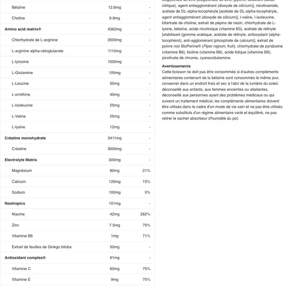 Orange ingredients: maltodextrin, creatine monohydrate 13.6%, dextrose, L-arginine hydrochloride, beta-alanine, bulking agent : polydextrose, arginine alpha-ketoglutarate (AAKG), l-citrulline, l-tyrosine, acidifier (citric acid), flavour, acidifier (malic acid), calcium salts of orthophosphoric acid, sodium citrate, magnesium carbonate, anti-caking agent (silicon dioxide), acetyl-L-carnitine hydrochloride, sweeteners (acesulfame-K, sucralose), l-glutamine, cayenne pepper extract powder (Capsicum annuum, fruit) (maltodextrin, pepper extract, emulsifier : citric esters of mono- and diglycerides of fatty acids, humectant: glycerol, antioxidants: ascorbic acid fatty acid esters, alpha-tocopherol), L-ascorbic acid (vitamin C), ginger extract (ginger rhizome extract, maltodextrin), l-ornithine hydrochloride, l-leucine, calcium ?-hydroxy-?-methylbutyrate (HMB), l-carnitine-L-tartrate, ginkgo leaf extract (Ginkgo biloba L.), acidity regulator (sodium carbonate), zinc bisglycinate [bisglycinate de zinc, glycine, acidifiant (acide citrique), agent antiagglomérant (dioxyde de silicium)], nicotinamide, DL-alpha-tocopheryl acetate [acétate de DL-alpha-tocophéryle, agent antiagglomérant (dioxyde de silicium)], l-valine, l-isoleucine, choline bitartrate, grape-seed extract, L-lysine hydrochloride, betaine, nicotinic acid (vitamin B3), retinyl acetate [stabilisant (gomme arabique, acétate de rétinyle, antioxydant (alpha-tocophérol), anti-agglomérant (phosphate de calcium)], BioPerine® black pepper extract (Piper nigrum, fruit) 0.007%, pyridoxine hydrochloride (vitamin B6), biotin (vitamin B8), folic acid (vitamin B9), chromium picolinate, cyanocobalamin.