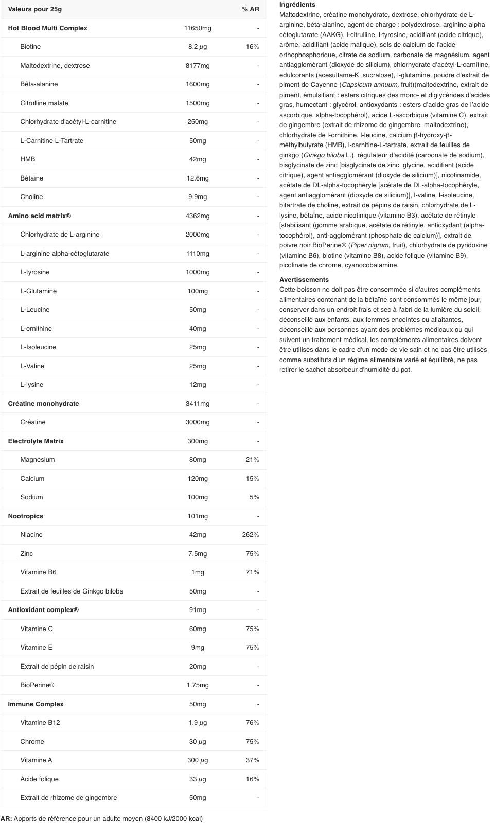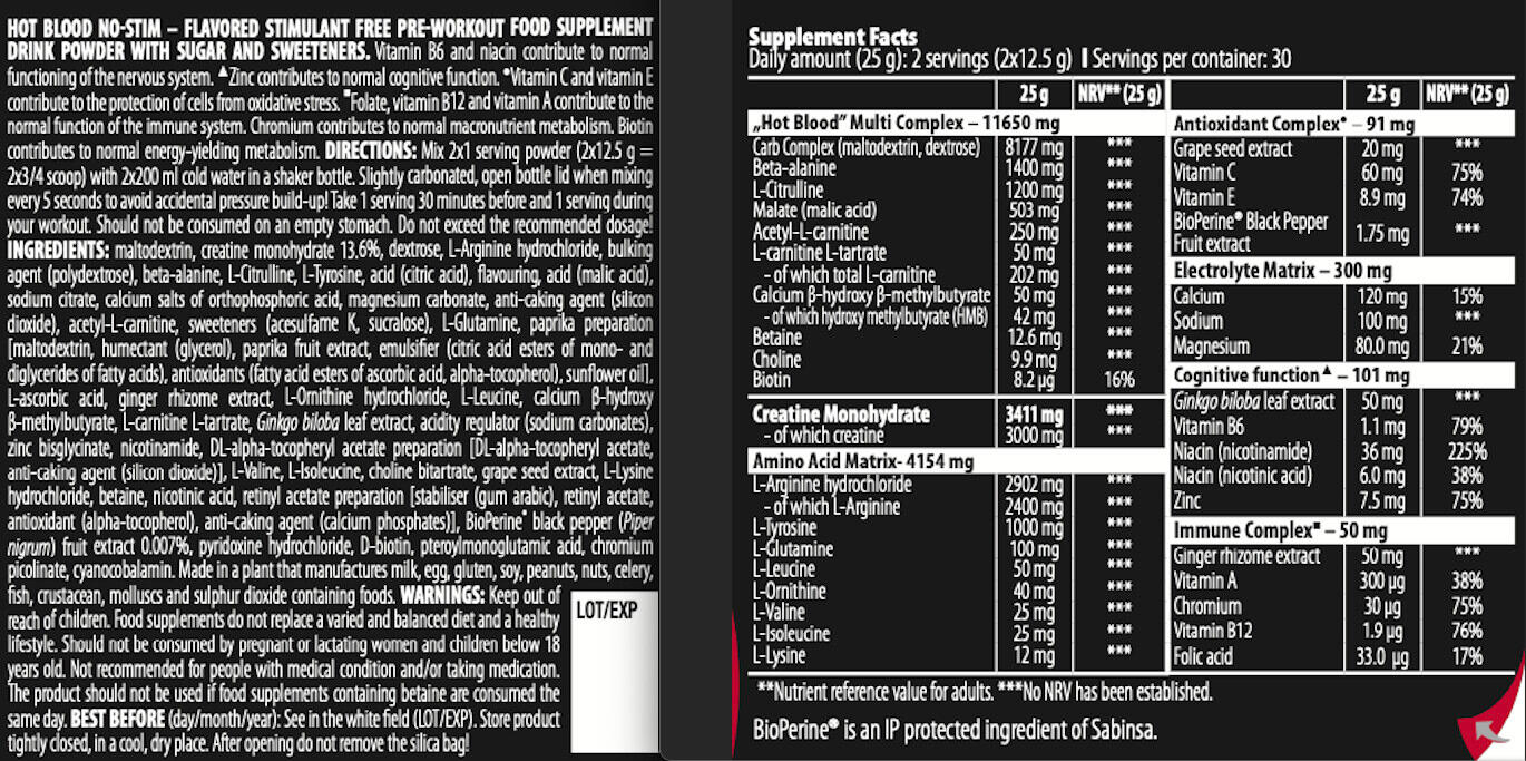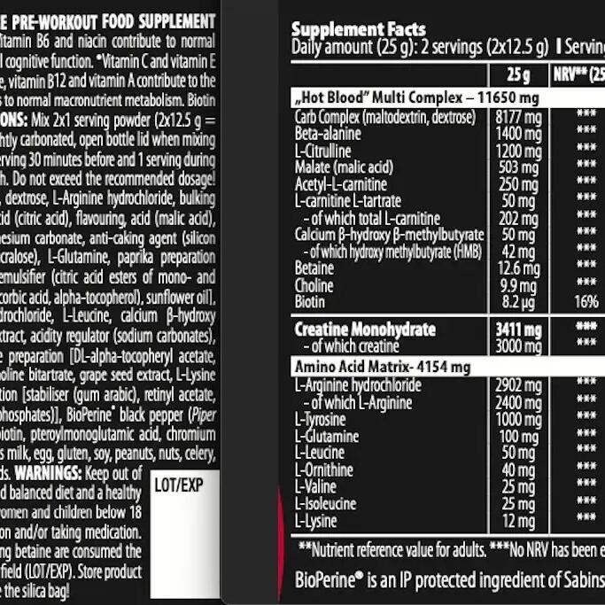 NUTRITIONAL INFORMATIONServing size: 12.5 gPer 12.5 g AR%'Hot Blood multi-complex 5875 mgCarbohydrate complex (maltodextrin, dextrose) Calcium -Hydroxy -Methylbutyrate (50 mg) - including hydroxy methylbutyrate (HMB) (42 mg), Betain, (12,6 mg), Choline (9,9 mg), Biotine ( 8,2 mcg)4088 mg***Beta-alanine700 mg***L-citrulline600 mg ***Malate (malic acid)251 mg ***Acetyl L-carnitine125 mg *** L-carnitine L-tartrate- of which total L-Carnitine25 mg101 mg ******calcium ?-hydroxy-?-methylbutyrate- of which hydroxymethylbutyrate (HMB)25 mg21 mg******Betaine6.3 mg ***Choline5 mg ***Sodium50 mg ***Creatine monohydrate- Of which creatine1705 mg1500 mg ******Amino acid matrixL-Arginine hydrochloride (1451 mg), including L-Arginine (1200 mg), L-Tyrosine (500 mg), L-Glutamine (50 mg), L-Leucine (25 mg), L-Ornithine (20 mg), L-Valine (12.5 mg), L-Isoleucine (12.5 mg), L-Lysine (6 mg)2077 mg***Antioxidant ComplexGrape seed extract (10 mg), vitamin C (30 mg) 38%**,vitamin E (4.5 mg) 38%**, Bioperine® b