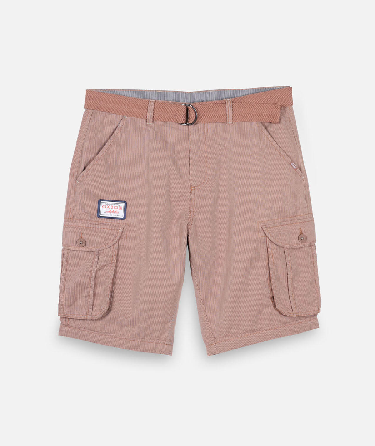 Striped bermuda shorts, braided belt with metal buckle, two back pockets and two buttoned cargo pockets, zip fly, drative label, woven stripe, length 21''/54cm