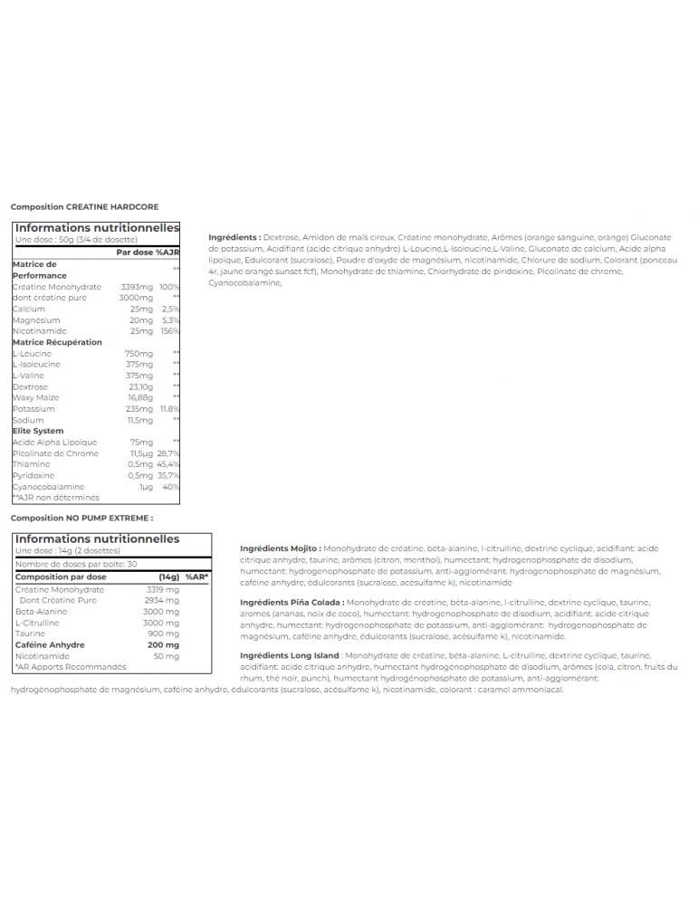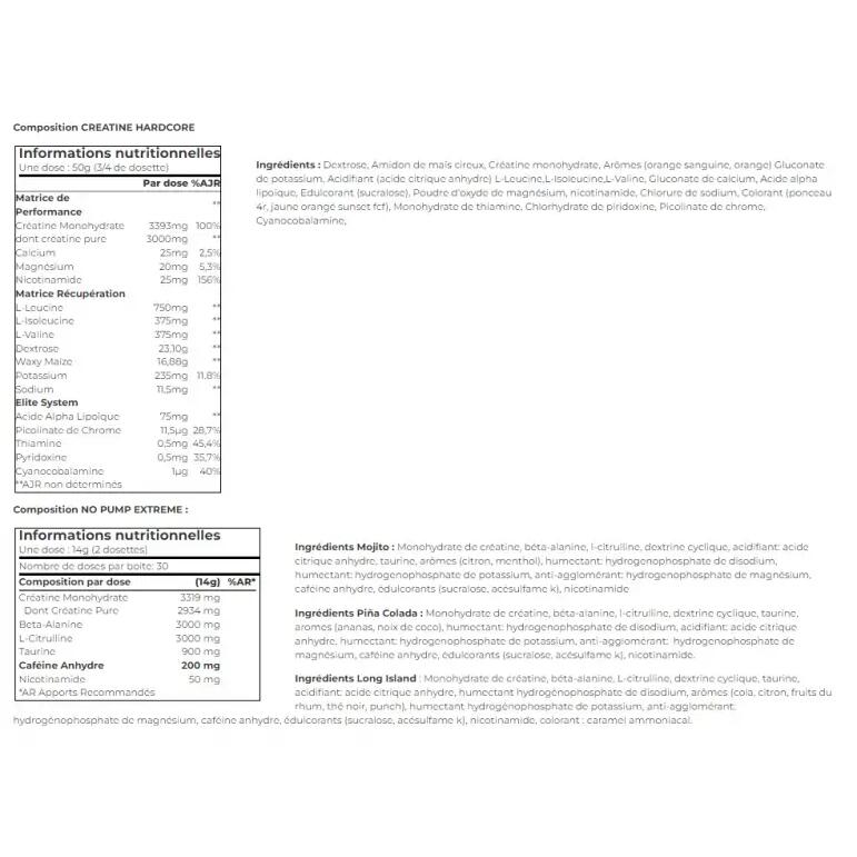 The Volume & Strength program provides a rapid increase in muscle volume and an express gain in strength. The presence of Creatine in this program helps to increase volume and intensify physical strength.The Volume & Strength program contains :- Hardcore Creatine (1.5kg) - Tropical: Containing 14 active ingredients, this complex creatine formula delivers rapid muscle mass and strength gains, and enhances sports performance. Combined with heavy training and a high-protein diet, Hardcore Creatine boosts explosiveness for short, intense efforts.- No Pump Xtreme (420g) - Mojito: Ultra-efficient pre-workout booster to boost your sessions. Big pumps, muscle volume and intensity! An incredible synergy of ingredients to stimulate muscle development, including creatine monohydrate, beta-alanine and citrulline.
